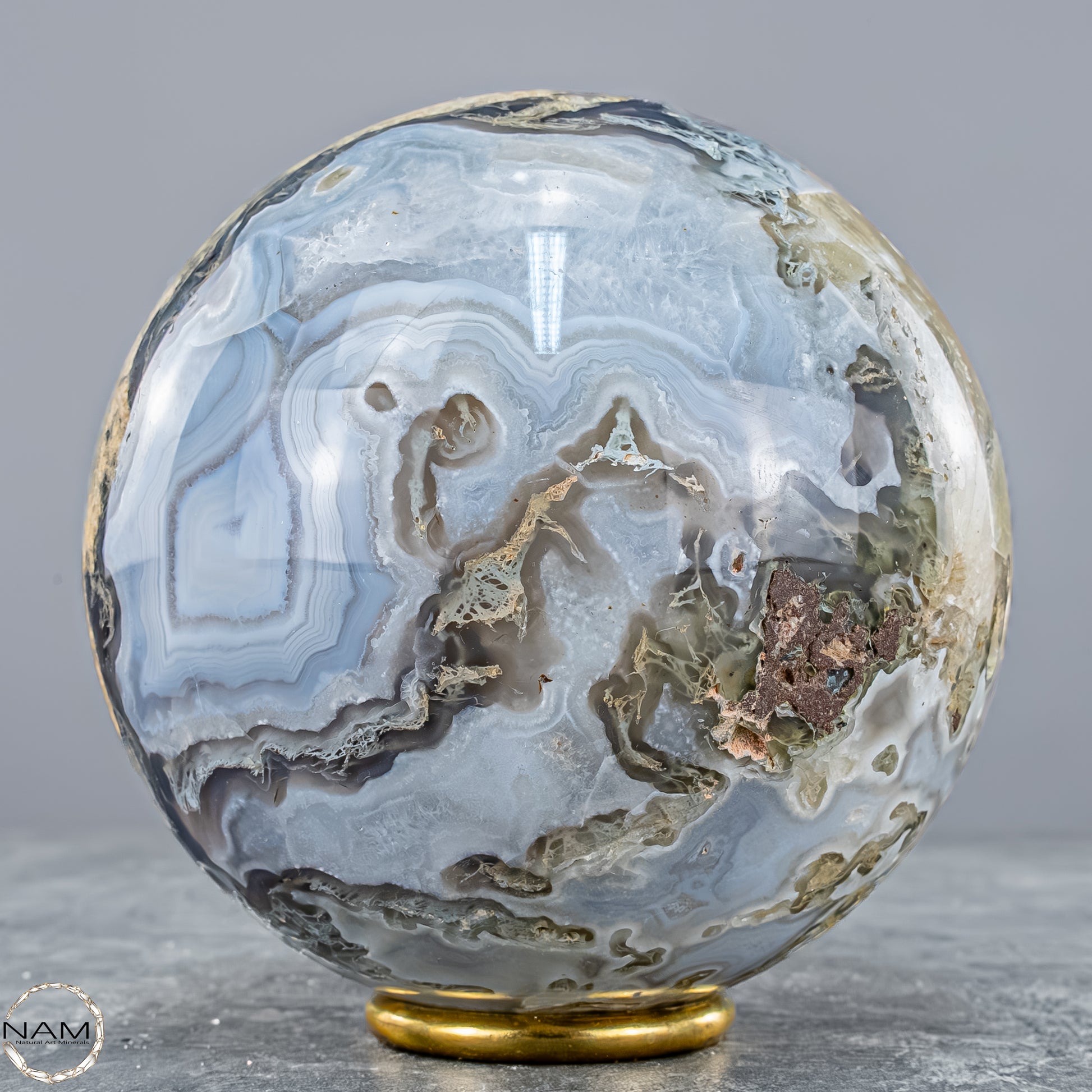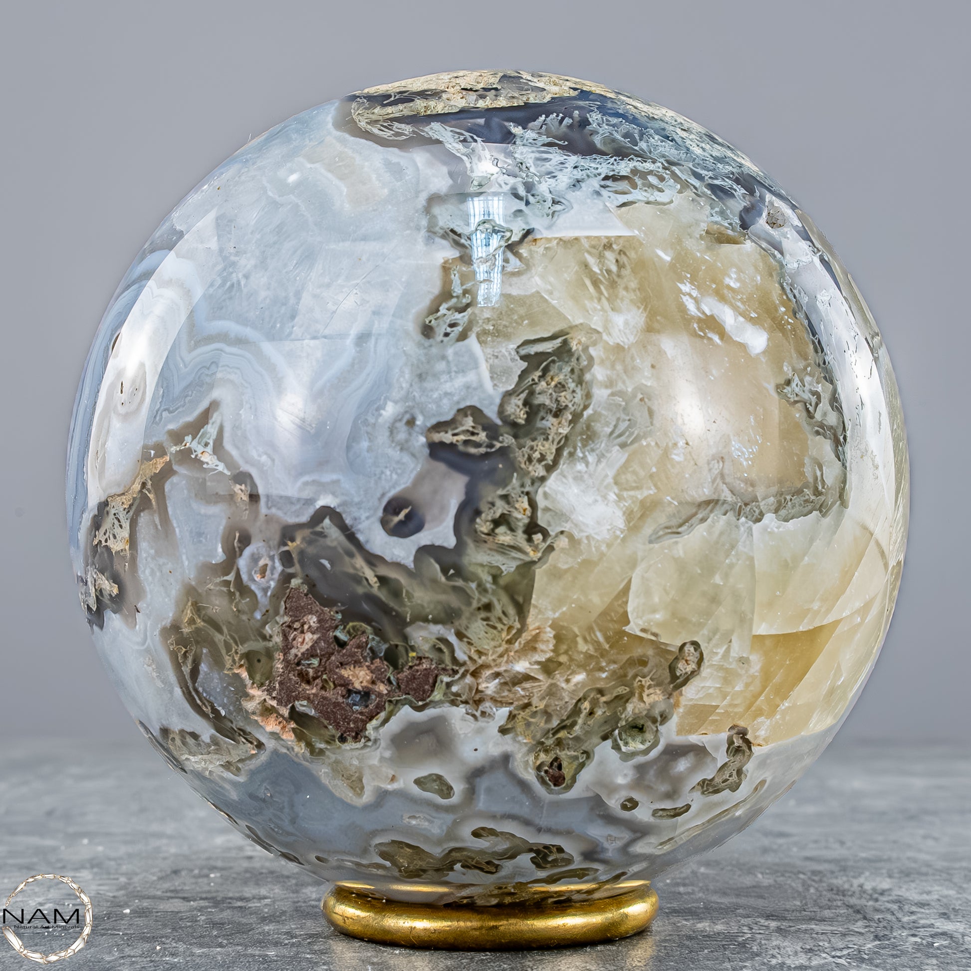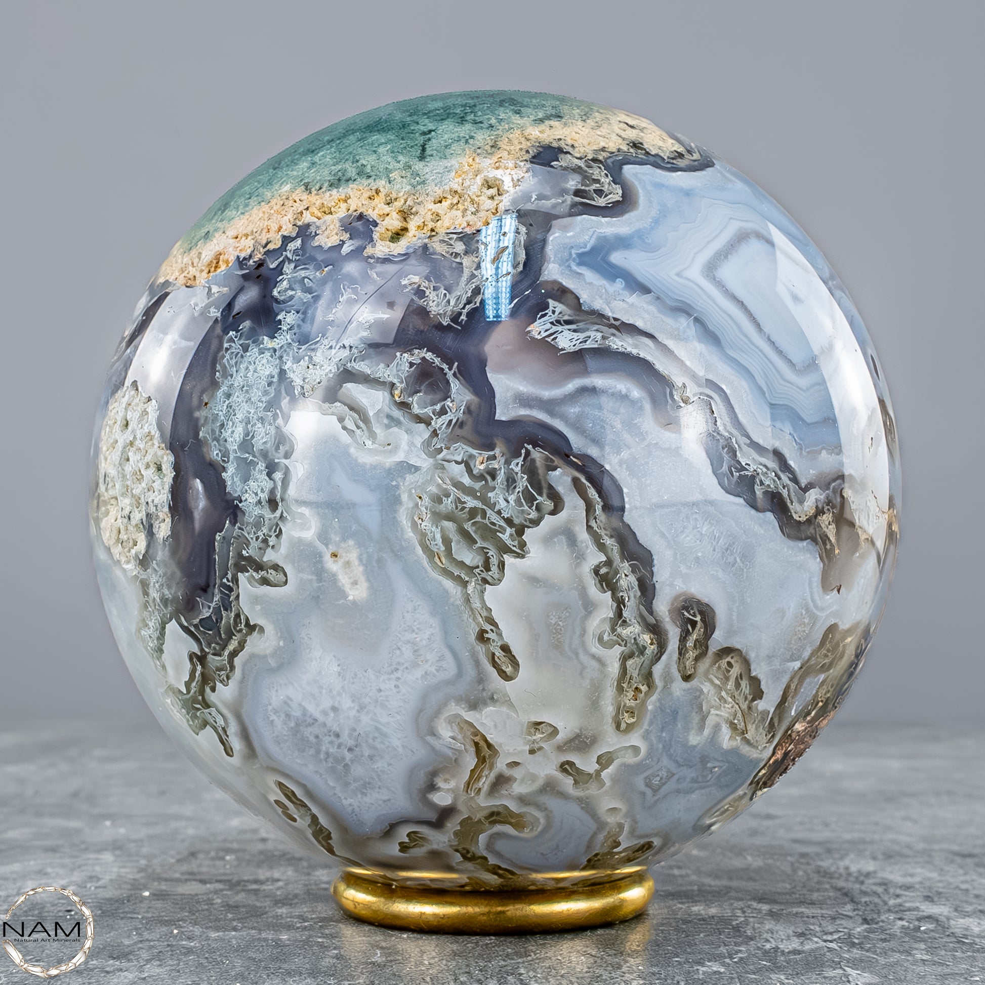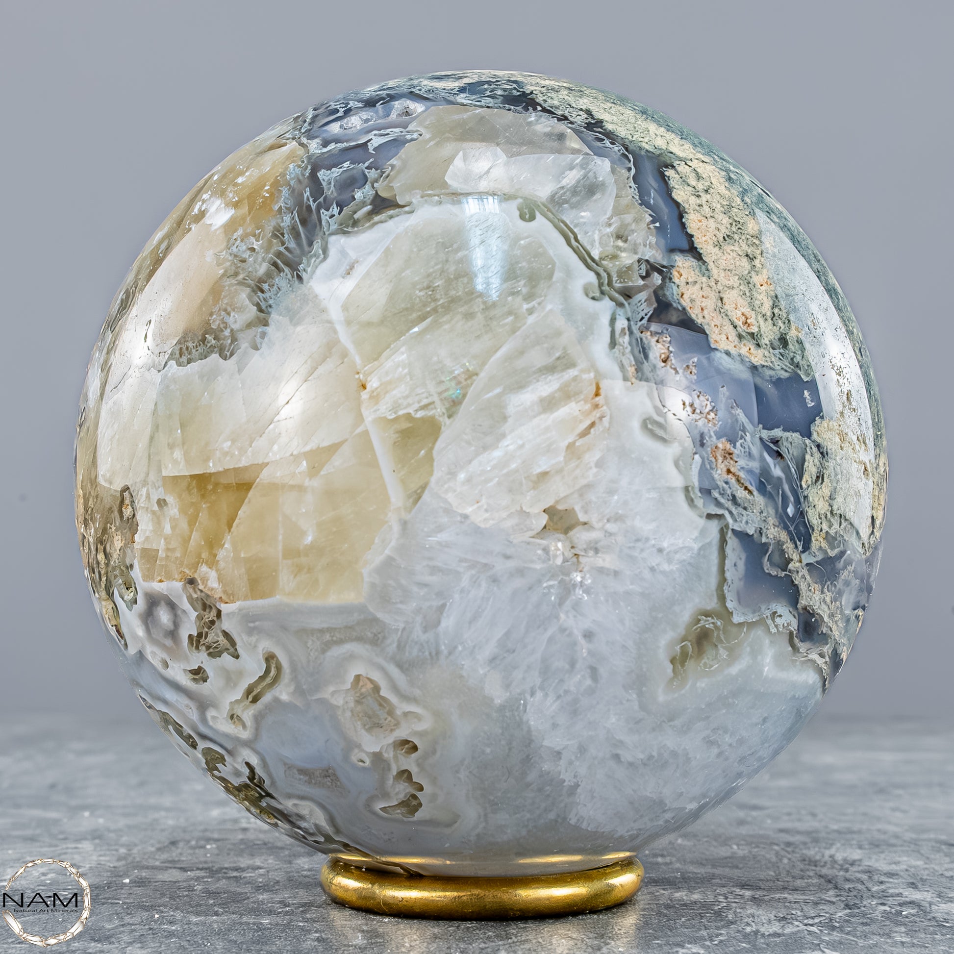 Eine einzigartige Kugel, der aus einem wunderschönen Kristall aus Moose-Achat geschnitzt ist, genannt Agata Sakura, was auf Japanisch 'Kirschblüten' bedeutet. Er zeichnet sich durch große Quarzkristalle mit einem grünlichen Ton und Achat-Einschlüssen im Inneren aus. Diese Formation ist nicht sehr häufig, besonders nicht in grünem Ton. Der Achat im Inneren hat zentrale weiße Punkte, umgeben von einer dunkleren, fast transparenten schwarzen Färbung. Eine weitere Eigenschaft dieses Kristallturms ist das Vorhandensein mehrerer Geoden, die Einblicke in die innere Kristallisation ermöglichen und einen faszinierenden visuellen Kontrast erzeugen.