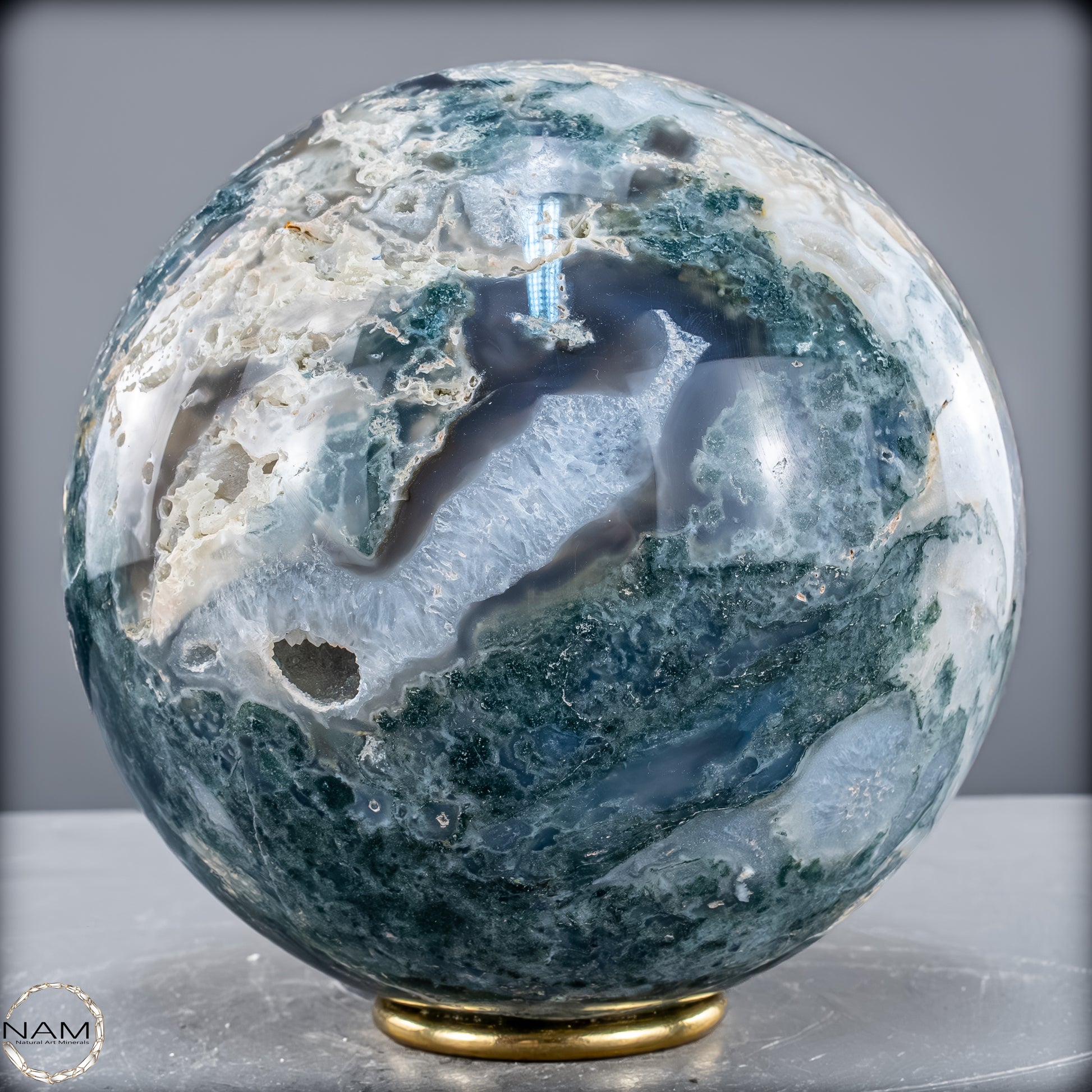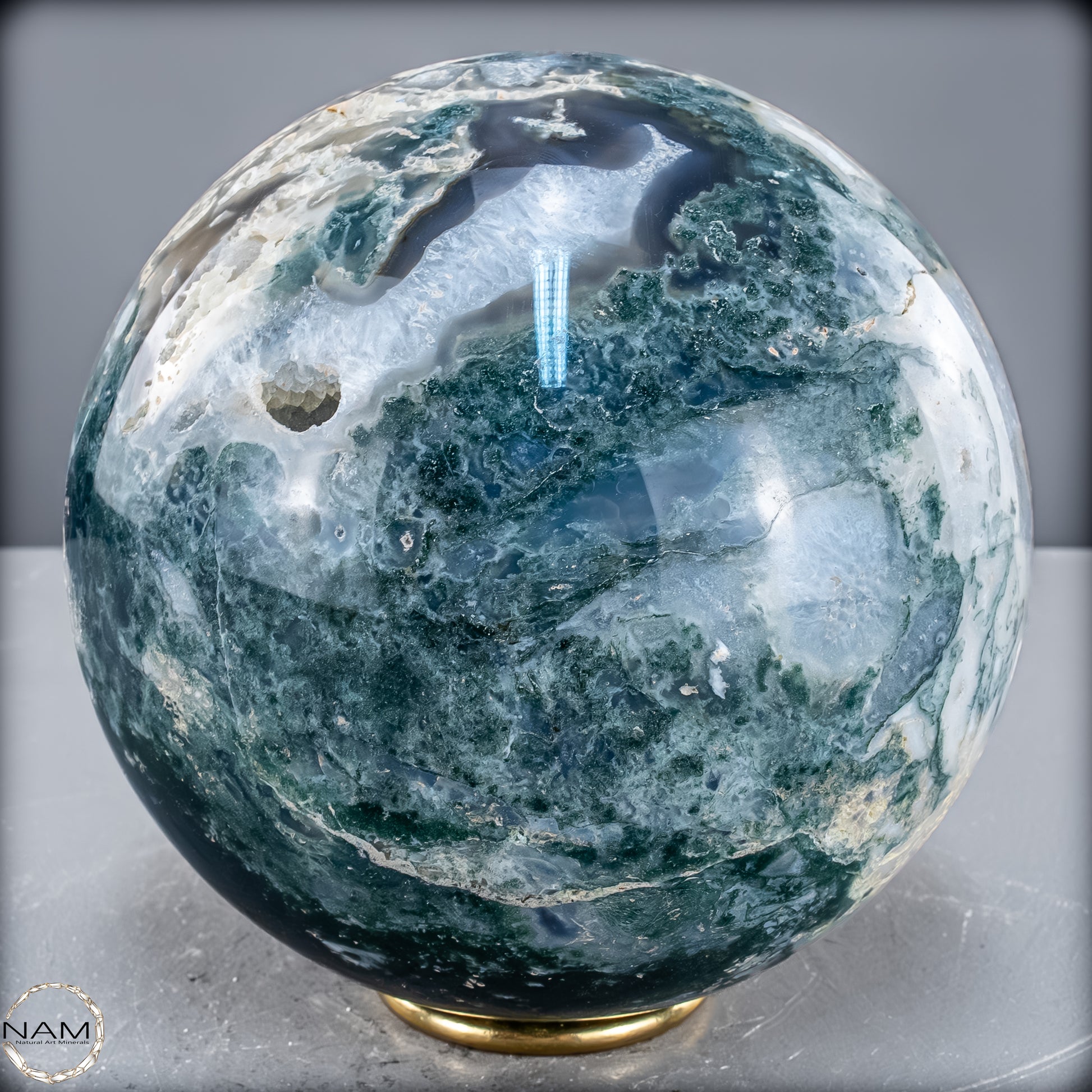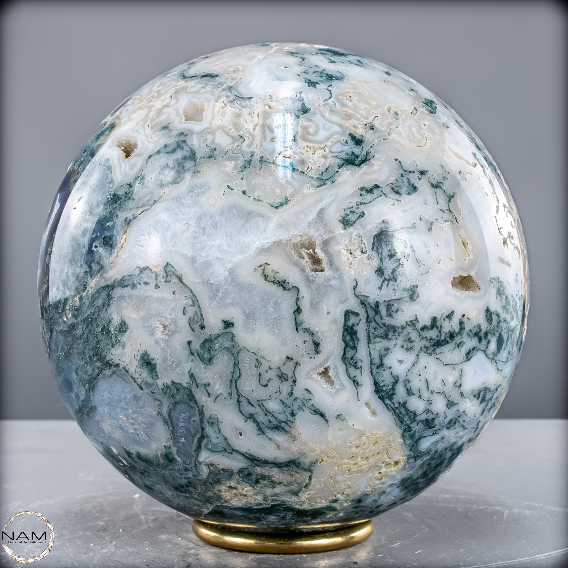 Eine einzigartige Kugel, der aus einem wunderschönen Kristall aus Moos-Achat geschnitzt ist, genannt Agata Sakura, was auf Japanisch 'Kirschblüten' bedeutet. Er zeichnet sich durch große Quarzkristalle mit einem grünlichen Ton und Achat-Einschlüssen im Inneren aus. Diese Formation ist nicht sehr häufig, besonders nicht in grünem Ton. Der Achat im Inneren hat zentrale weiße Punkte, umgeben von einer dunkleren, fast transparenten schwarzen Färbung. Eine weitere Eigenschaft dieses Kristallturms ist das Vorhandensein mehrerer Geoden, die Einblicke in die innere Kristallisation ermöglichen und einen faszinierenden visuellen Kontrast erzeugen.