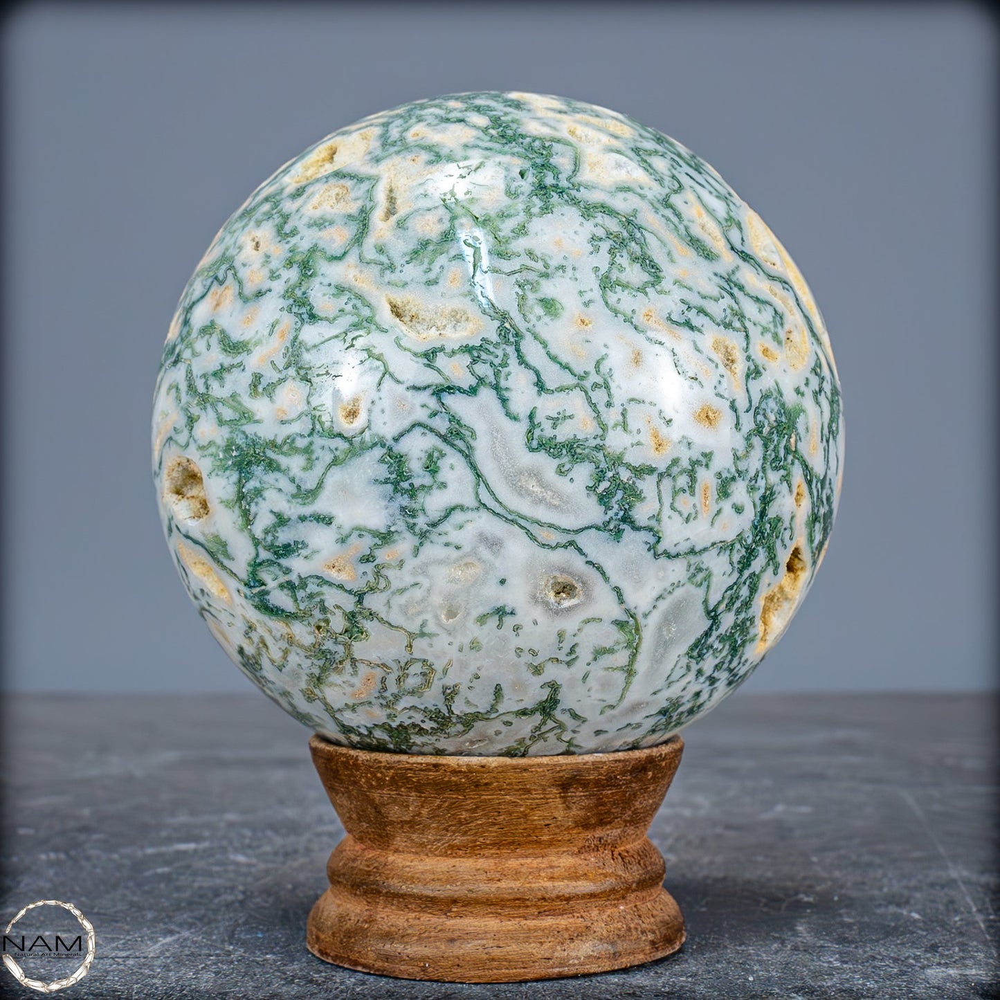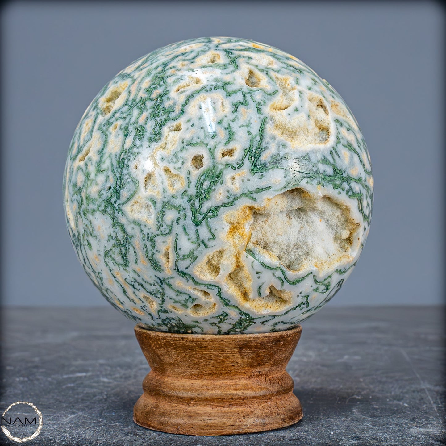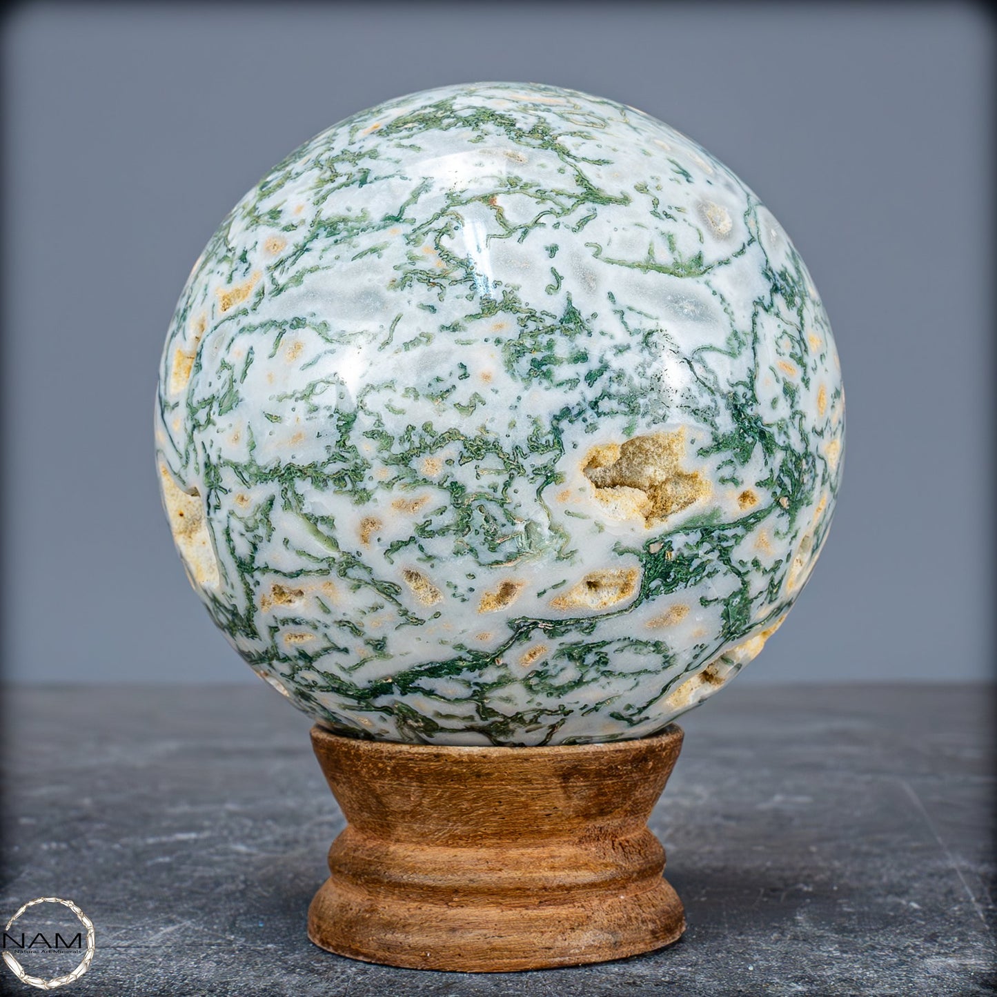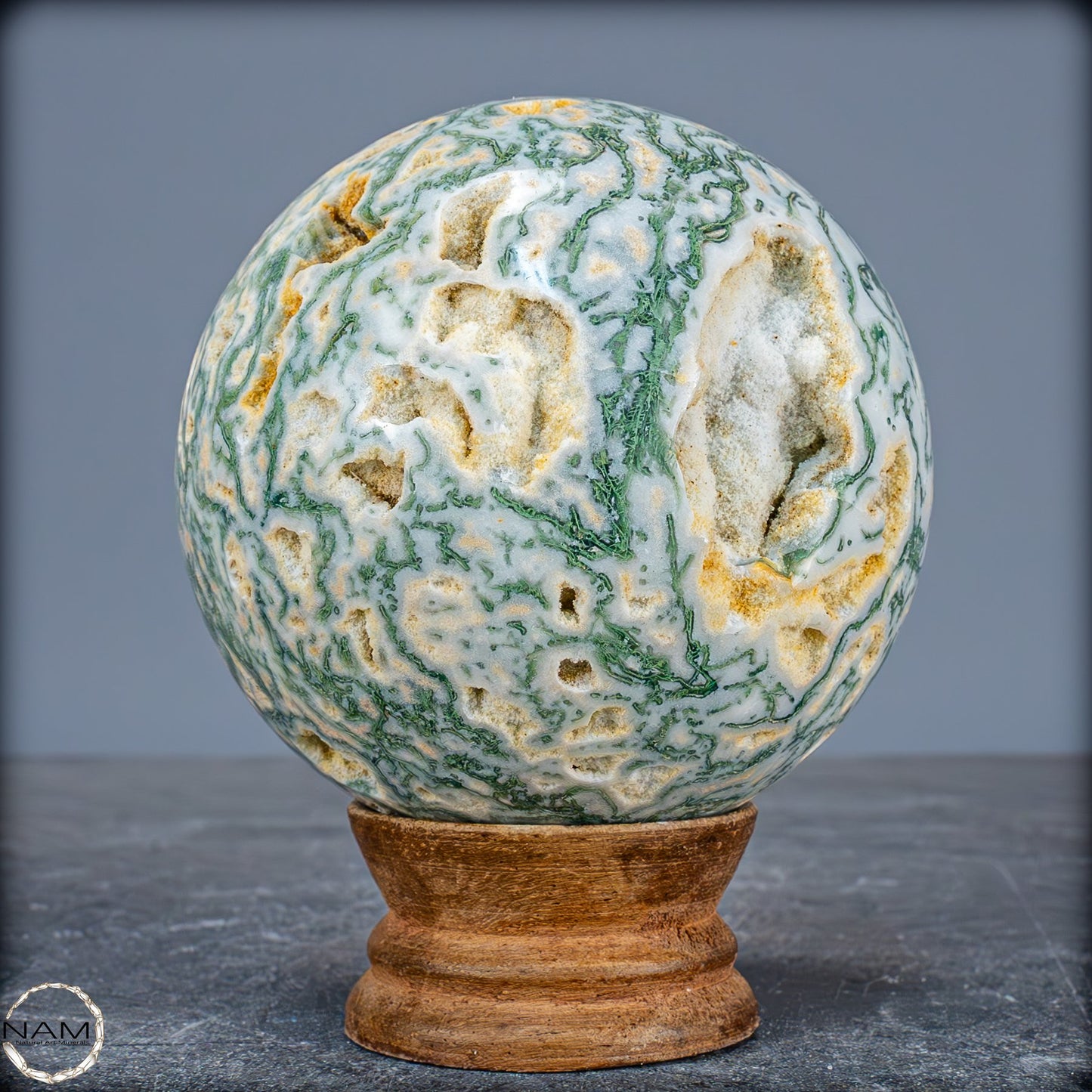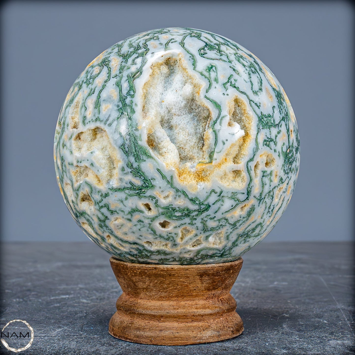 Eine einzigartige Kugel, der aus einem wunderschönen Kristall aus Moose-Achat geschnitzt ist, genannt Agata Sakura, was auf Japanisch 'Kirschblüten' bedeutet. Er zeichnet sich durch große Quarzkristalle mit einem grünlichen Ton und Achat-Einschlüssen im Inneren aus. Diese Formation ist nicht sehr häufig, besonders nicht in grünem Ton. Der Achat im Inneren hat zentrale weiße Punkte, umgeben von einer dunkleren, fast transparenten schwarzen Färbung. Eine weitere Eigenschaft dieses Kristallturms ist das Vorhandensein mehrerer Geoden, die Einblicke in die innere Kristallisation ermöglichen und einen faszinierenden visuellen Kontrast erzeugen.