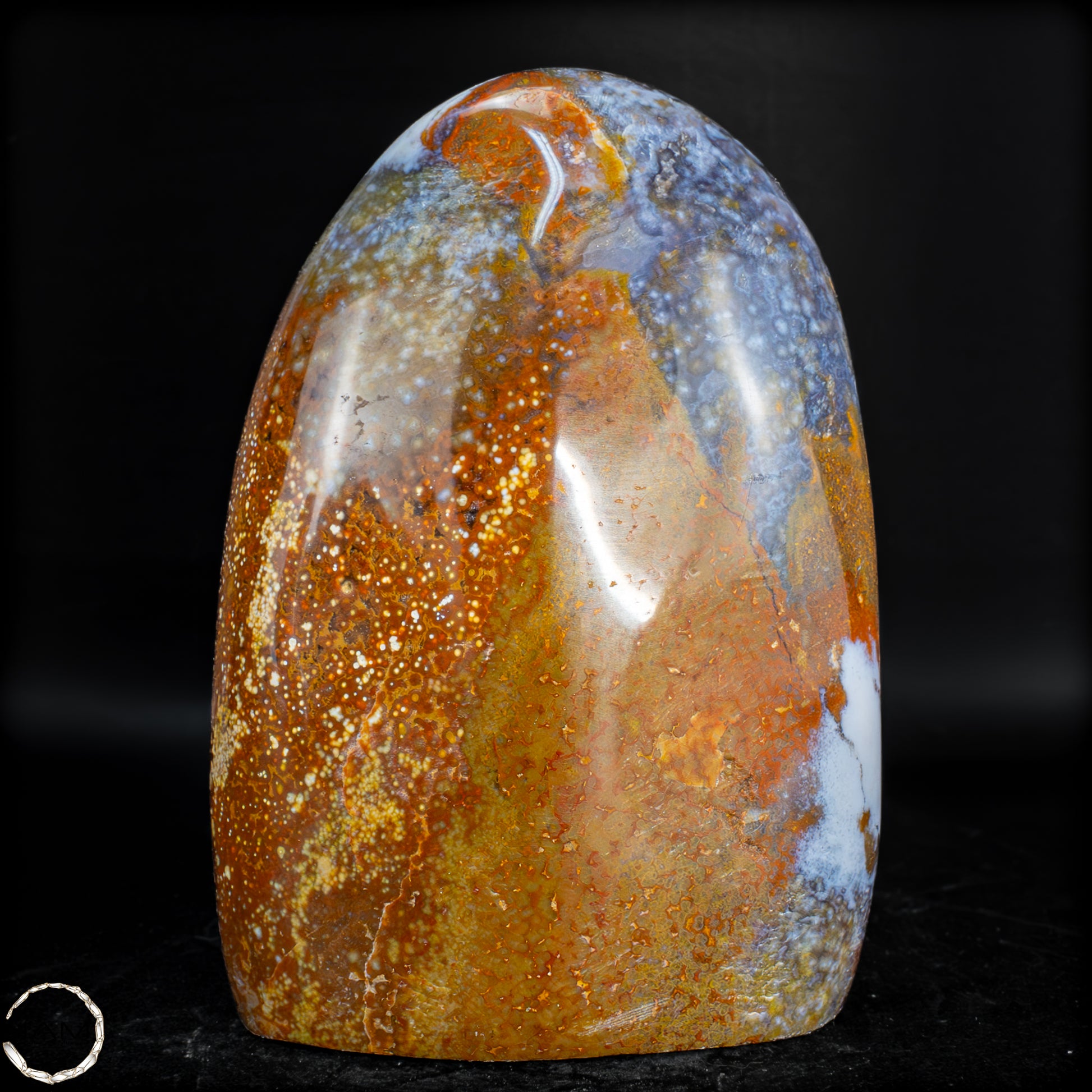 Die geschwungen polierte Oberfläche betont die natürlichen Muster und Farbverläufe dieses außergewöhnlichen Steins. Ocean Jasper ist bekannt für seine harmonisierende Wirkung und wird oft mit innerer Ruhe und regenerierender Energie in Verbindung gebracht.