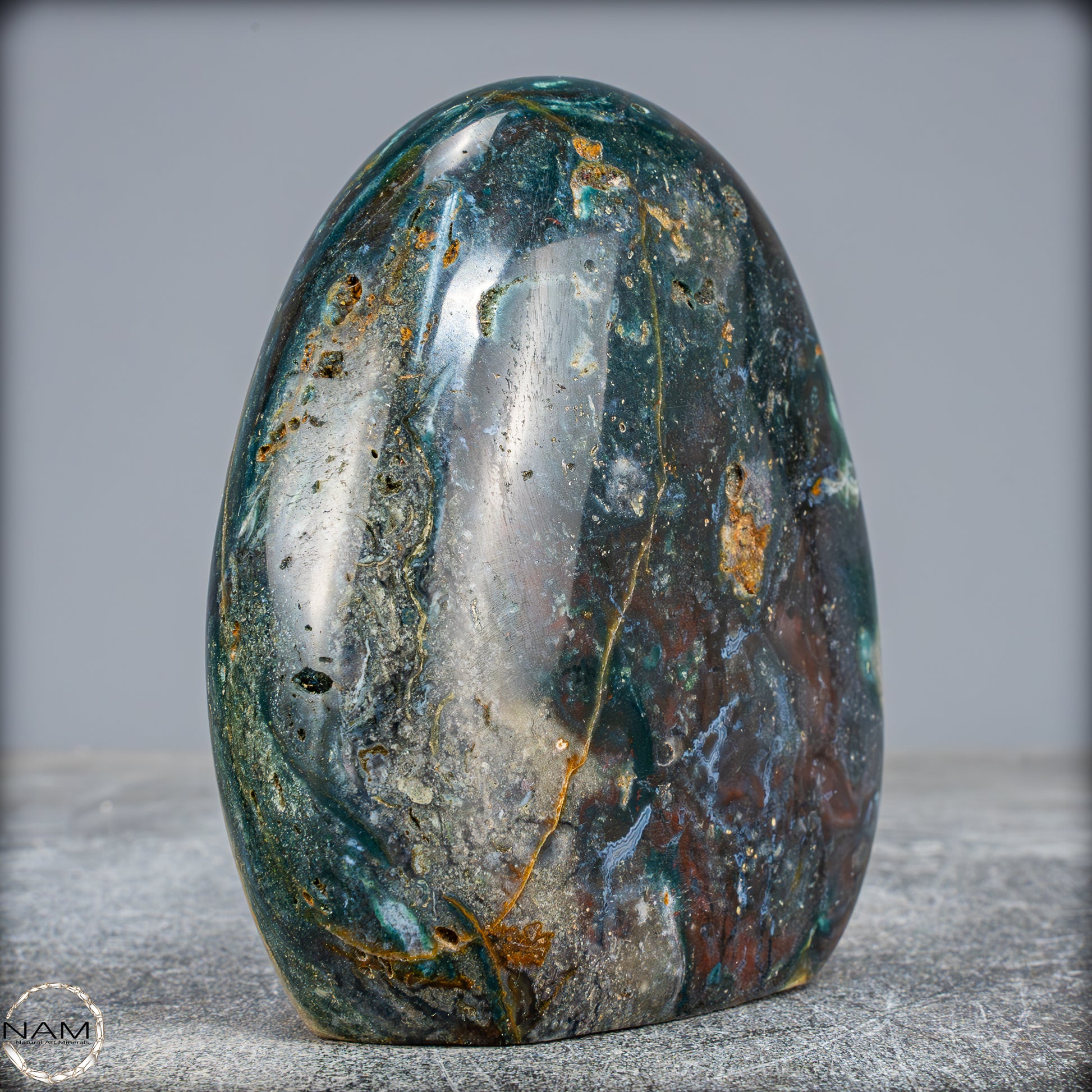 Diese Freiform aus Ocean Jasper präsentiert sich in einer besonders dunklen, fast mystischen Farbpalette. Tiefgrüne, bläuliche und rotbraune Bereiche wechseln sich ab und bilden eine Landschaft aus farblichen Tiefen, durchzogen von feinen, fast leuchtenden Adern in Gelb und Ocker. Kleine Einschlüsse und transparente Partien verleihen dem Stück eine geheimnisvolle Tiefe – als blicke man in eine andere Welt.