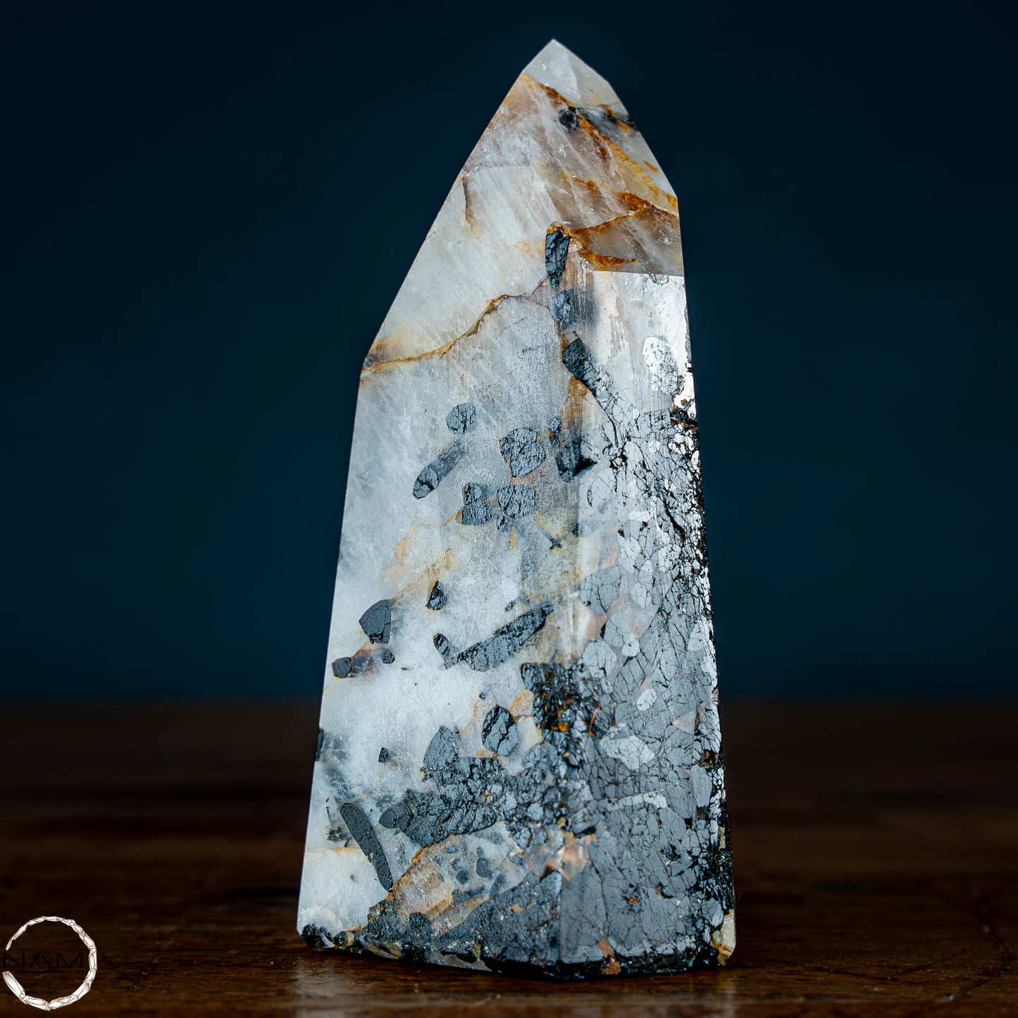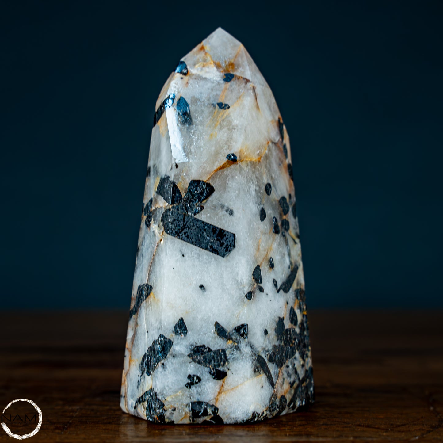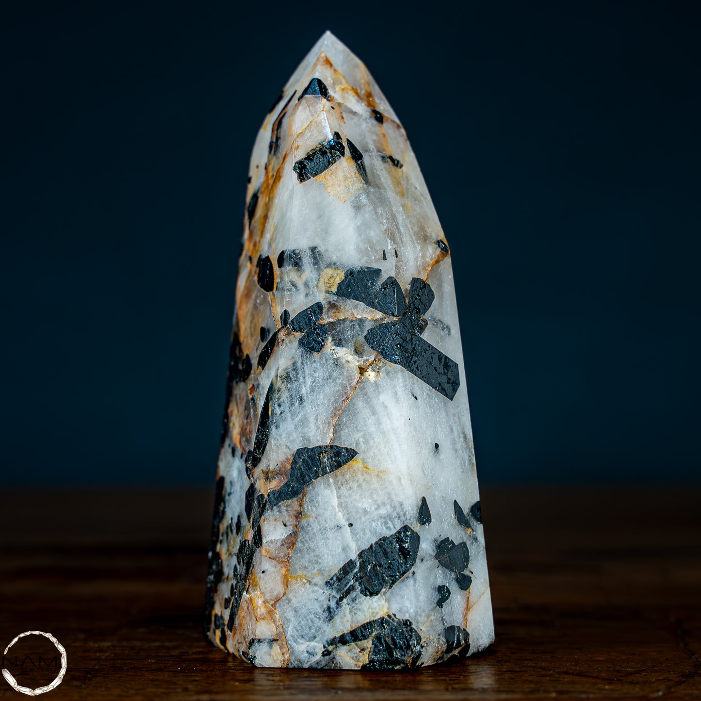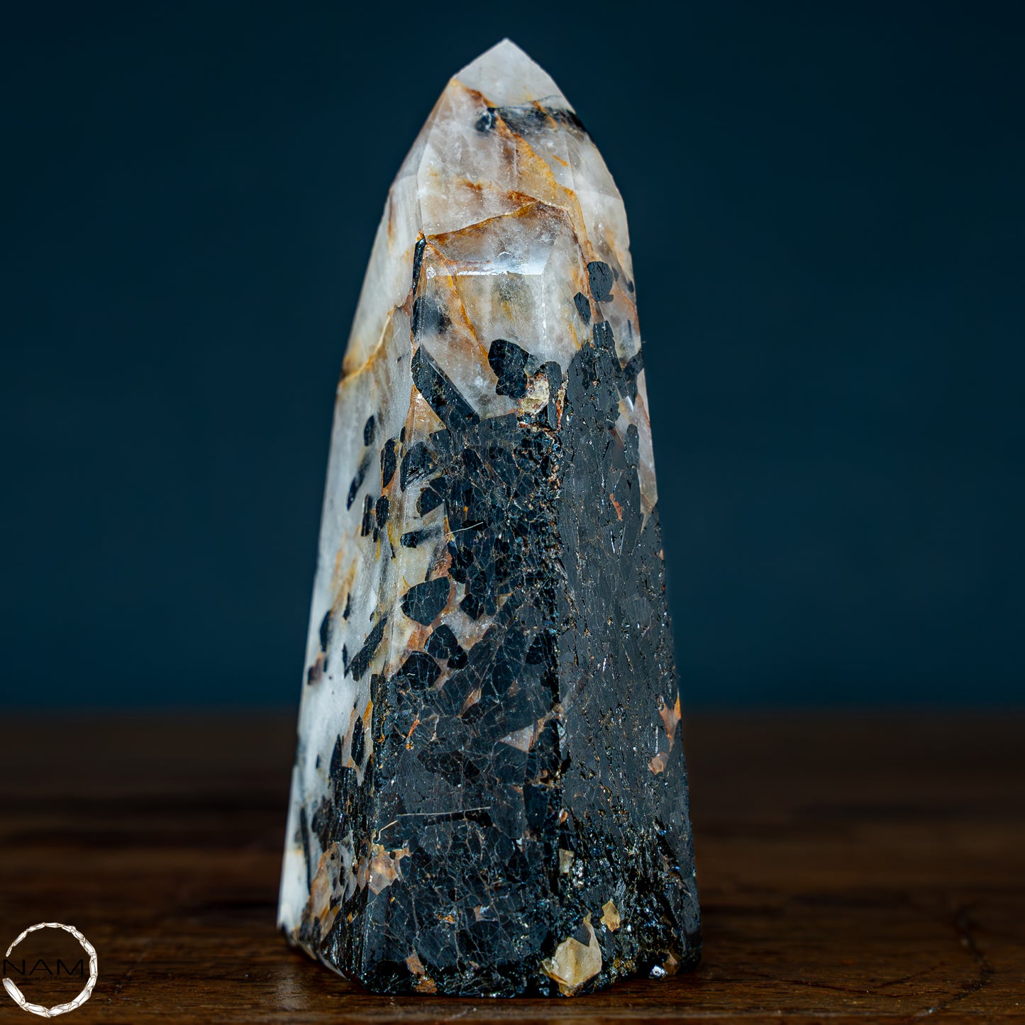 Dieser sehr seltene Obelisk wurde aus einem großen Block schwarzen Turmalin in Quarz geschnitzt, dessen Kristalle in seine natürliche Matrix eingebettet sind, was einen auffälligen Kontrasteffekt zwischen den schwarzen Kristallen sowie dem Quarz erzeugte.