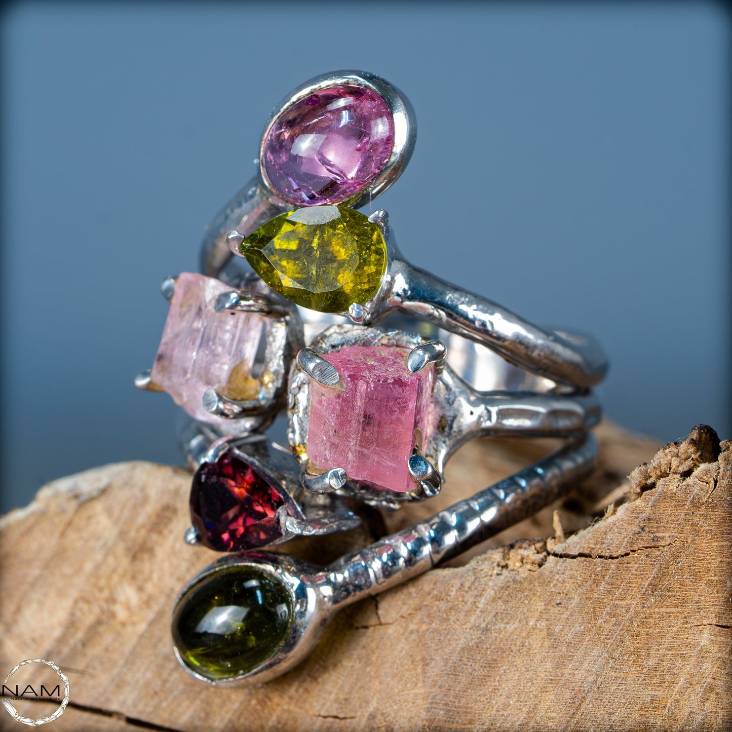 Dieser kunstvolle Ring besticht durch eine außergewöhnliche Anordnung verschiedener natürlicher Turmaline, die in verschiedenen Farbtönen erstrahlen. Die Kombination aus Pink, Gelb, Grün und Oliv verleiht dem Ring ein lebendiges und einzigartiges Farbspiel. Die Turmaline sind in unterschiedlichen Schliffen – oval, rund und tropfenförmig – gefasst, was den Ring zu einem echten Hingucker macht. Jeder Stein wird von einer silbernen Fassung sicher gehalten, die den Farben der Turmaline schmeichelt und sie zum Leuchten bringt.