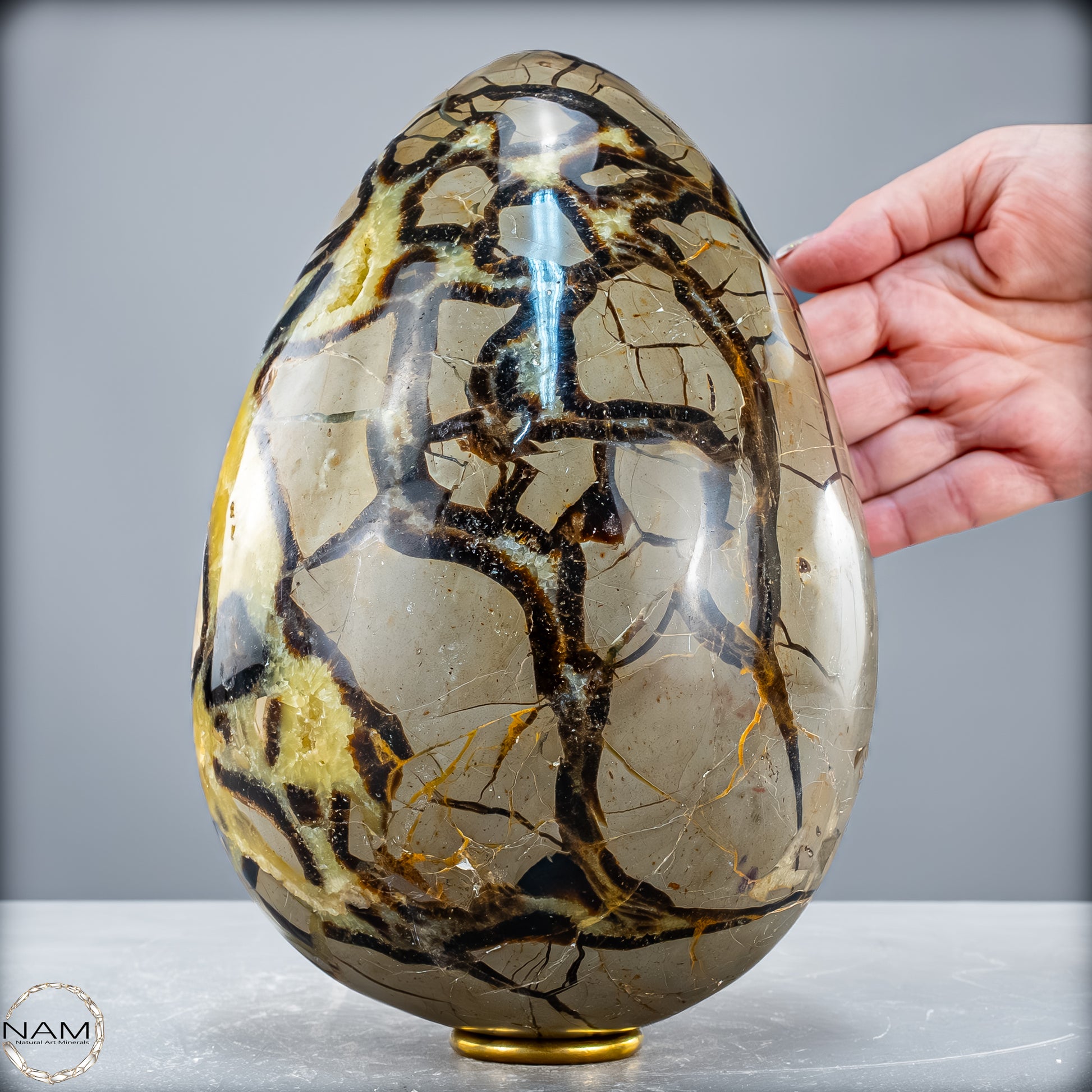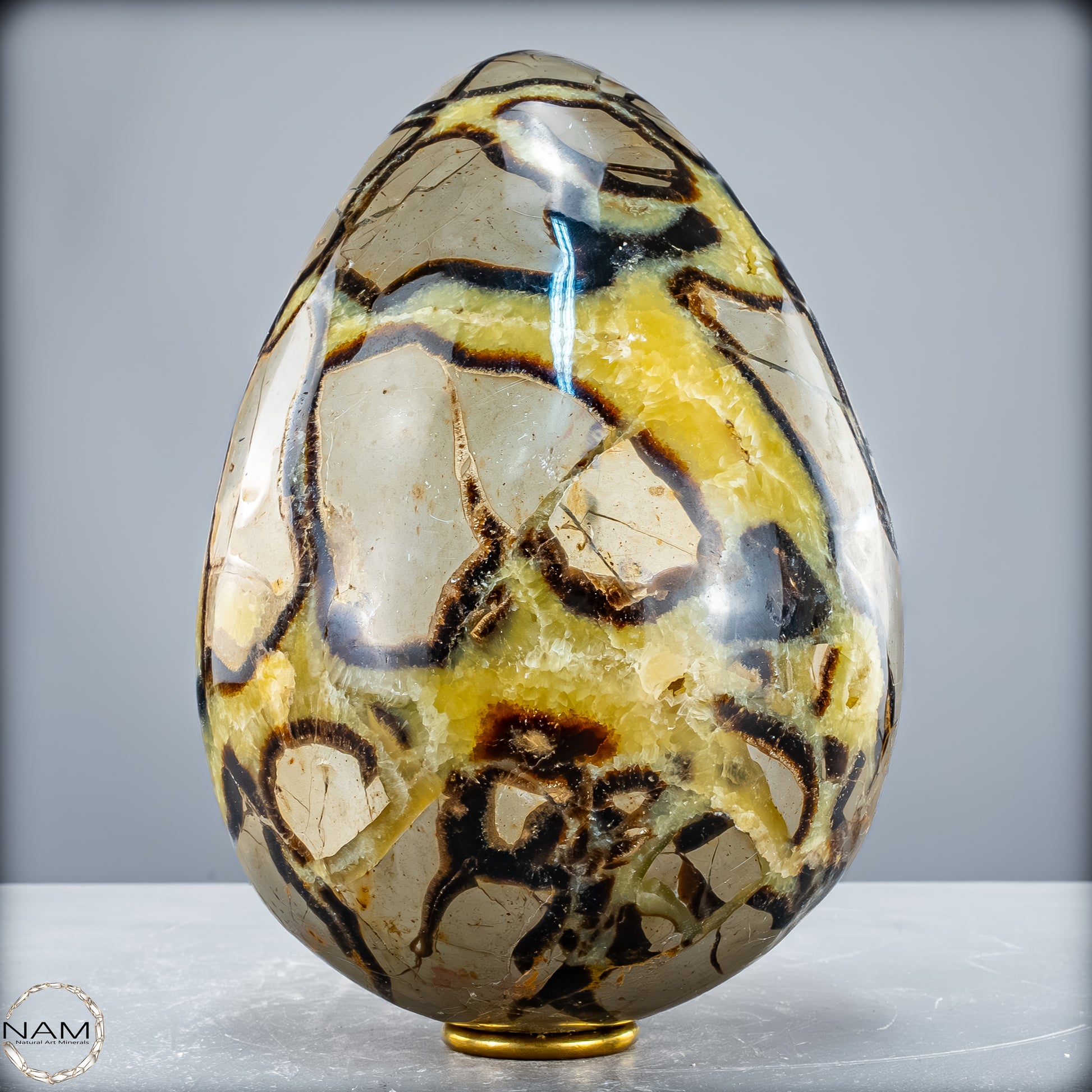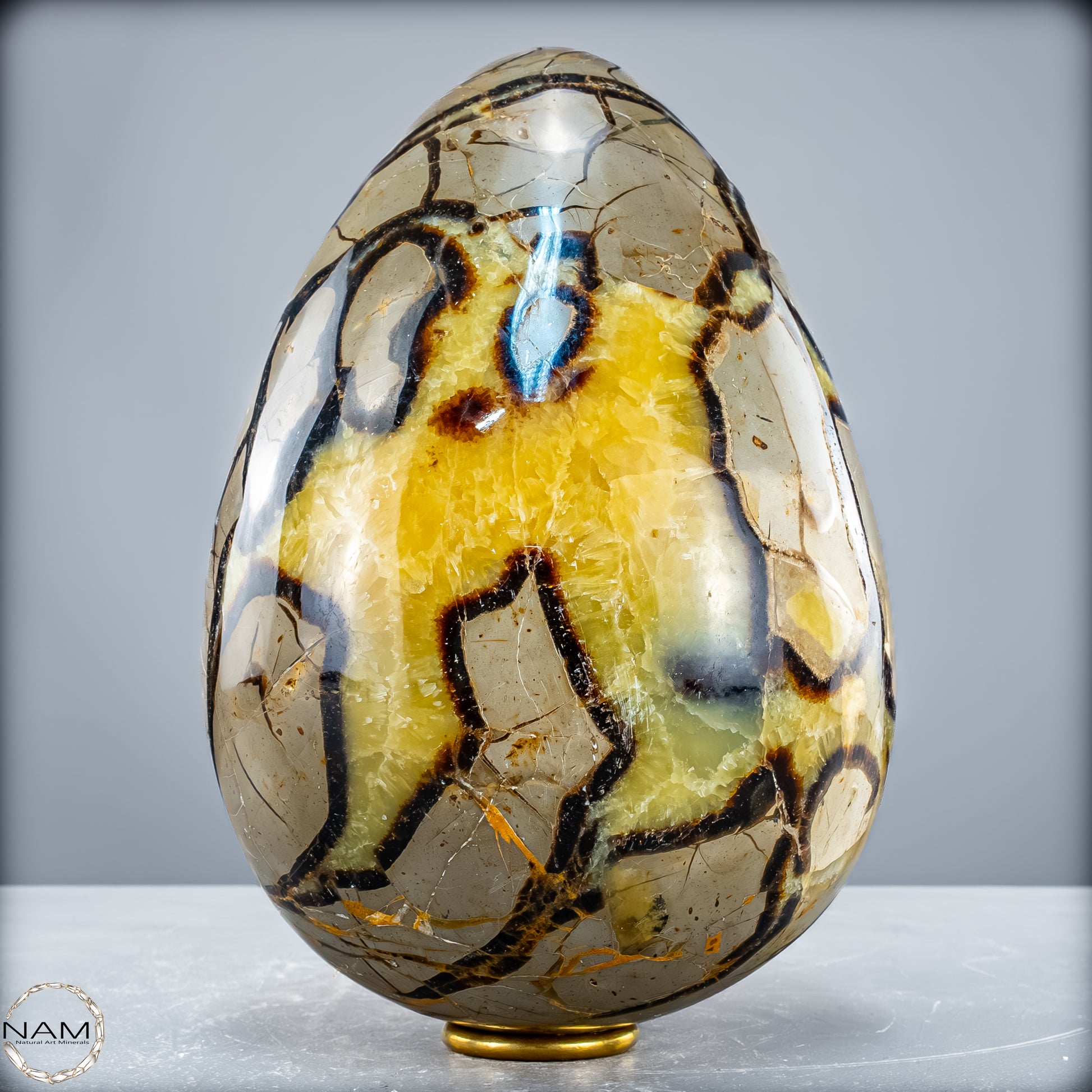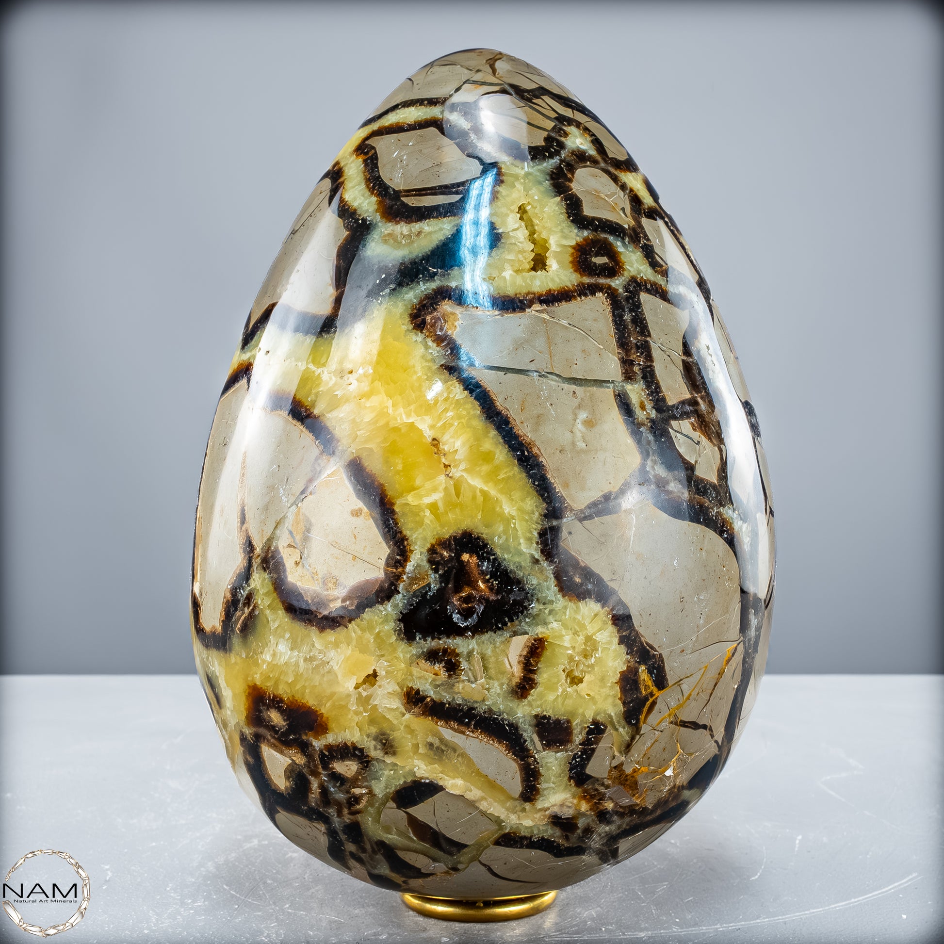 Natürliches Septarien-Ei. Diese beeindruckende Septarie besticht durch ihre komplexe, natürliche Struktur, die aus einer Kombination von Mineralien wie Kalkstein, Aragonit und Calcit besteht. Die äußere Oberfläche zeigt ein einzigartiges Muster, das durch feine, dunkle Linien durchzogen ist und an die Schale eines Dinosauriereis erinnert. Im Inneren öffnet sich eine kristallisierte Höhlung, die in warmen Gelb- und Brauntönen leuchtet und dem Stein eine besondere Tiefe und Lebendigkeit verleiht. Die Entstehung von Septarien geht auf Prozesse vor Millionen von Jahren zurück, bei denen sich die Mineralien im Gestein zu diesem charakteristischen Muster und den kristallinen Strukturen formten.