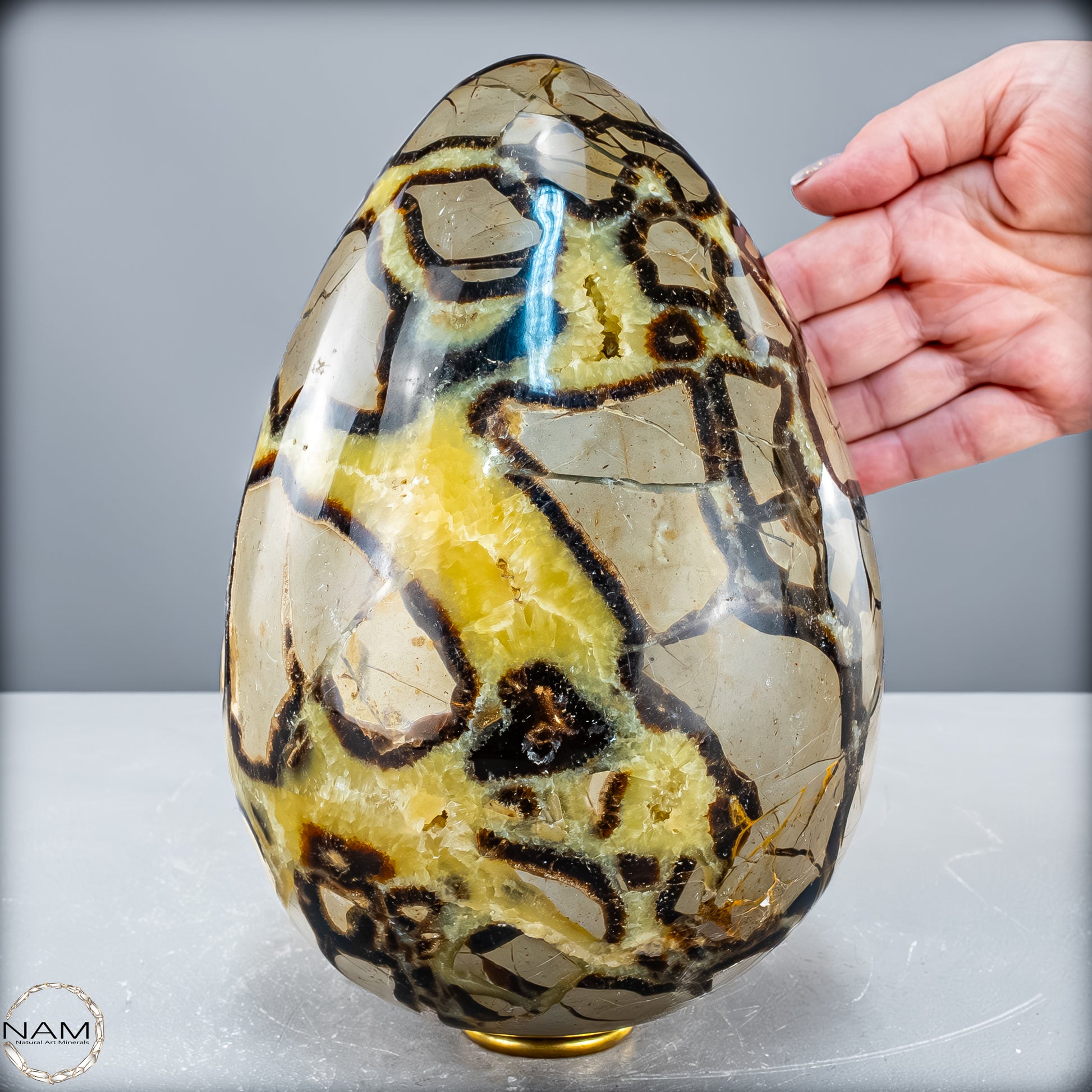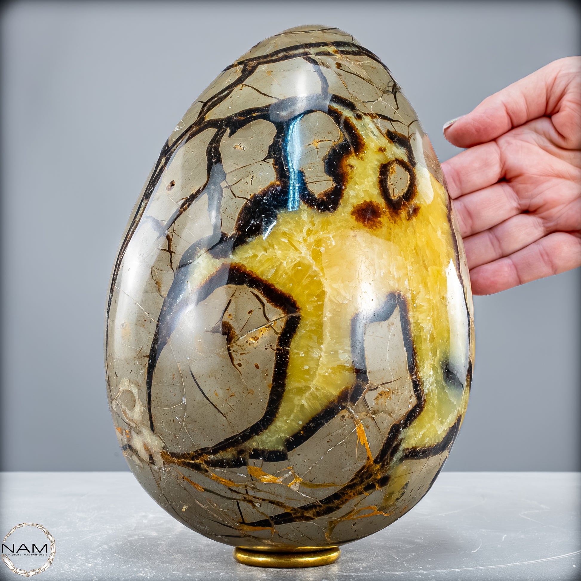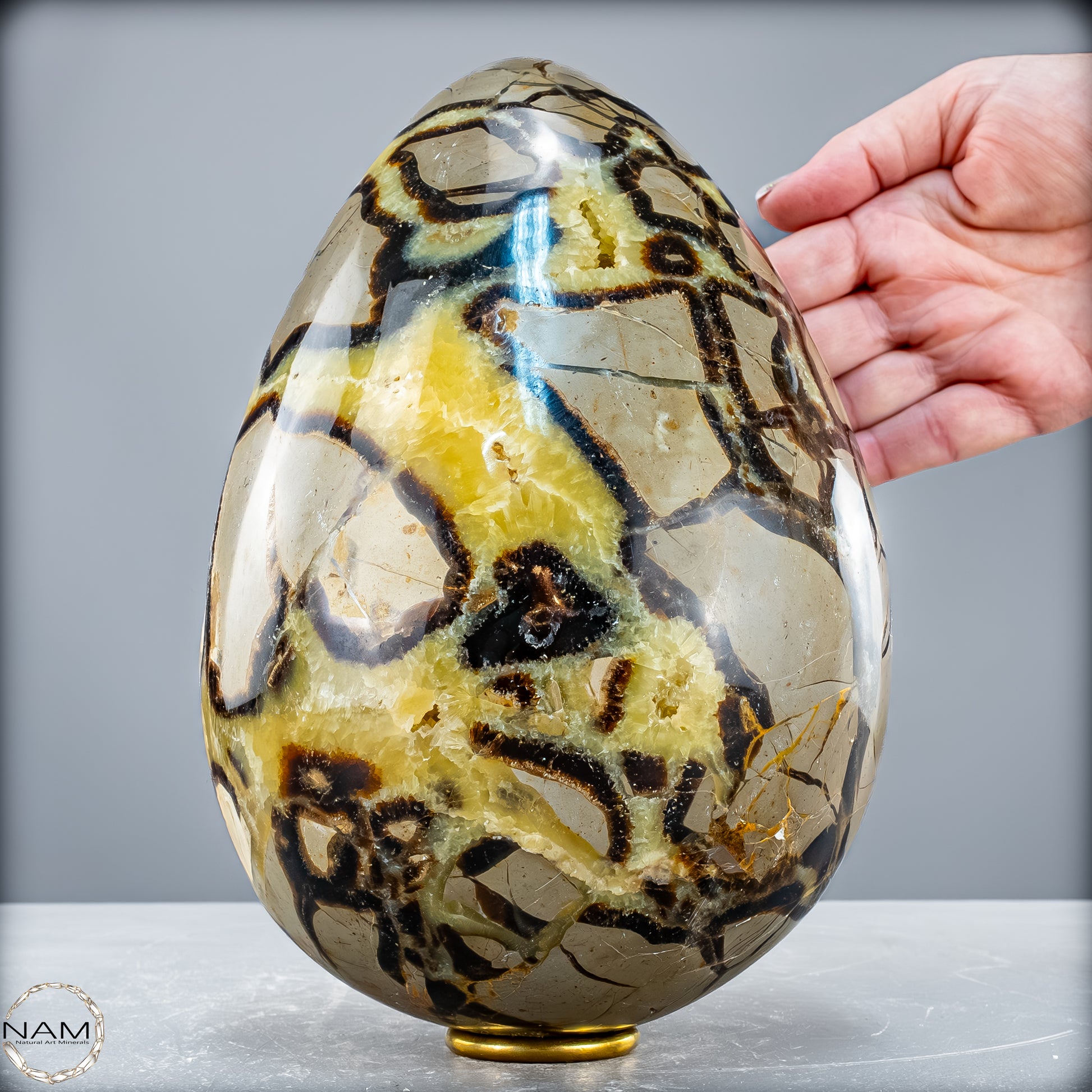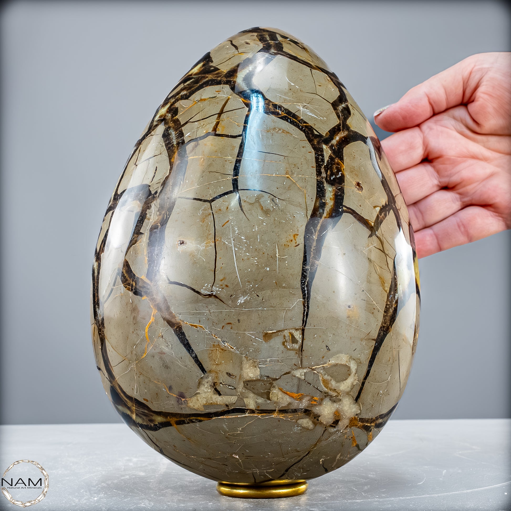 Natürliches Septarien-Ei. Diese beeindruckende Septarie besticht durch ihre komplexe, natürliche Struktur, die aus einer Kombination von Mineralien wie Kalkstein, Aragonit und Calcit besteht. Die äußere Oberfläche zeigt ein einzigartiges Muster, das durch feine, dunkle Linien durchzogen ist und an die Schale eines Dinosauriereis erinnert. Im Inneren öffnet sich eine kristallisierte Höhlung, die in warmen Gelb- und Brauntönen leuchtet und dem Stein eine besondere Tiefe und Lebendigkeit verleiht. Die Entstehung von Septarien geht auf Prozesse vor Millionen von Jahren zurück, bei denen sich die Mineralien im Gestein zu diesem charakteristischen Muster und den kristallinen Strukturen formten.
