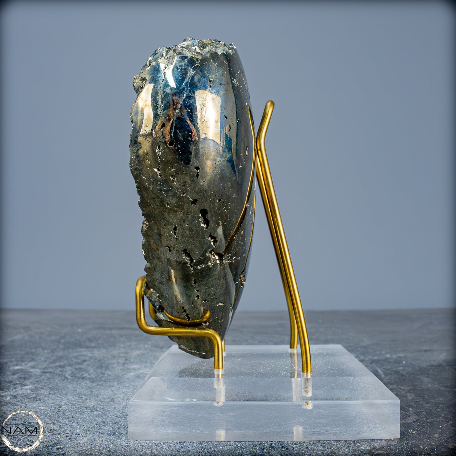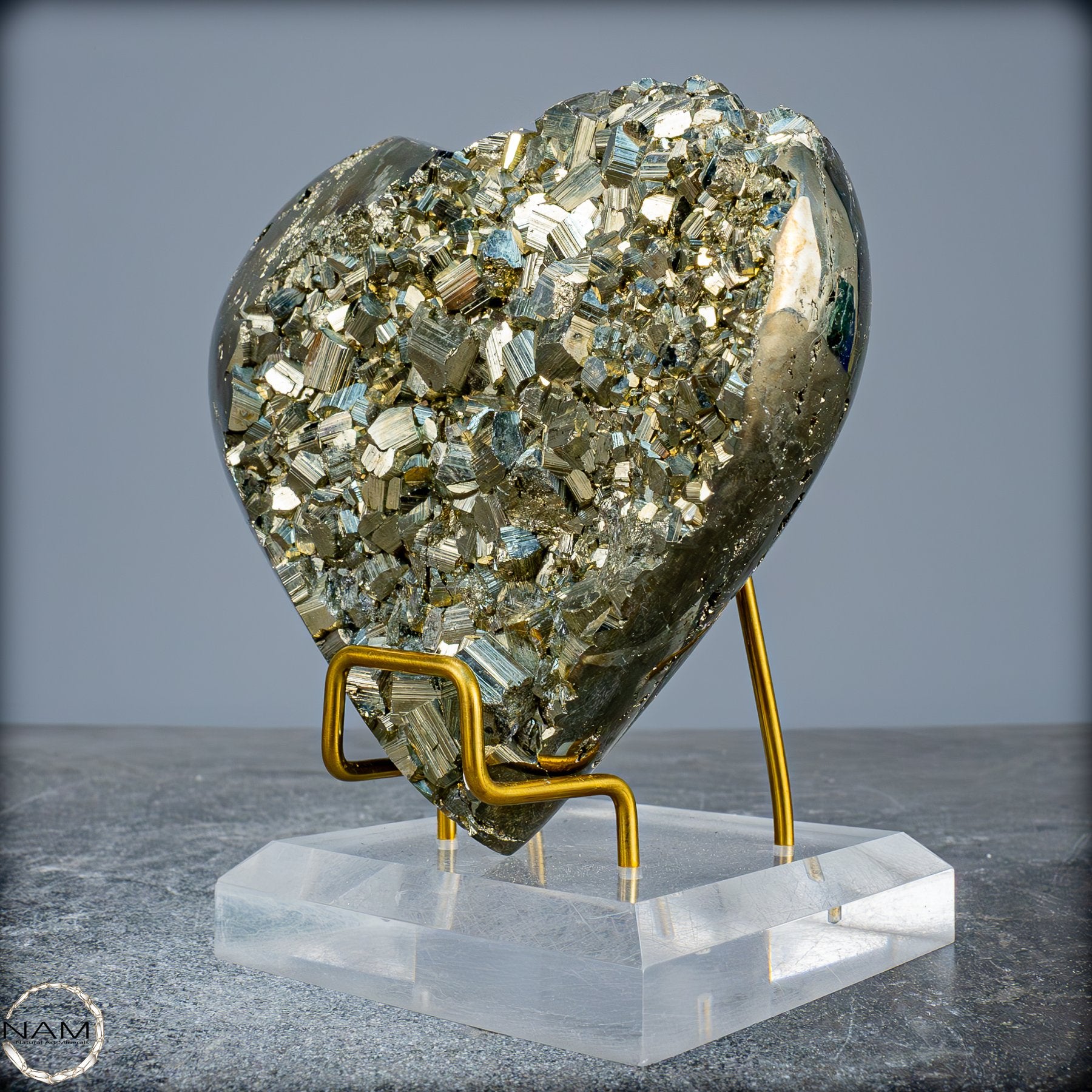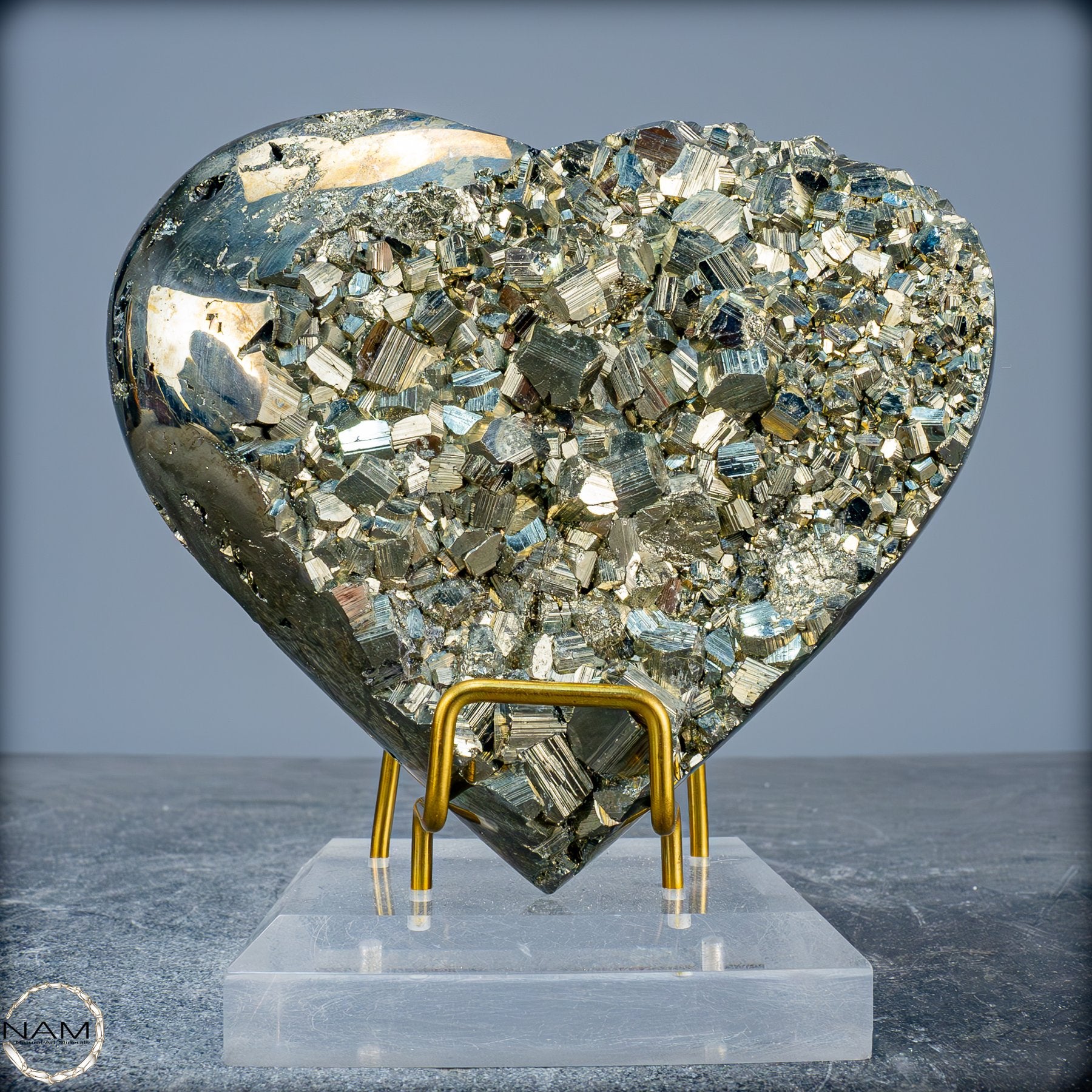 Dieses beeindruckende Pyrit-Herz zieht sofort die Aufmerksamkeit mit seiner natürlichen, glänzenden goldenen Farbe und seinen klaren geometrischen Kristallstrukturen auf sich. Der Stein funkelt in verschiedenen Facetten und schafft ein außergewöhnliches Spiel von Licht und Reflexion, das seine faszinierende, metallische Schönheit hervorhebt.