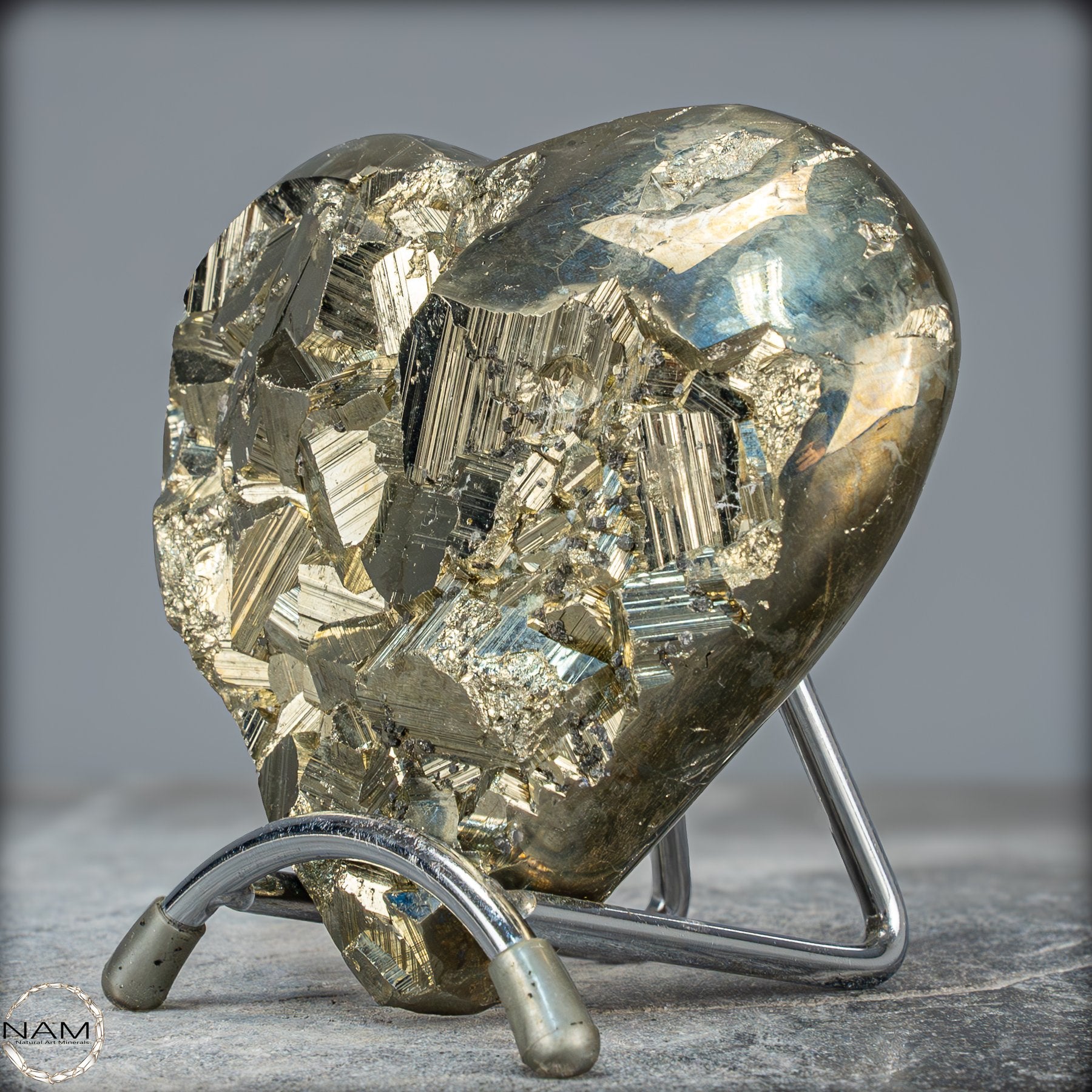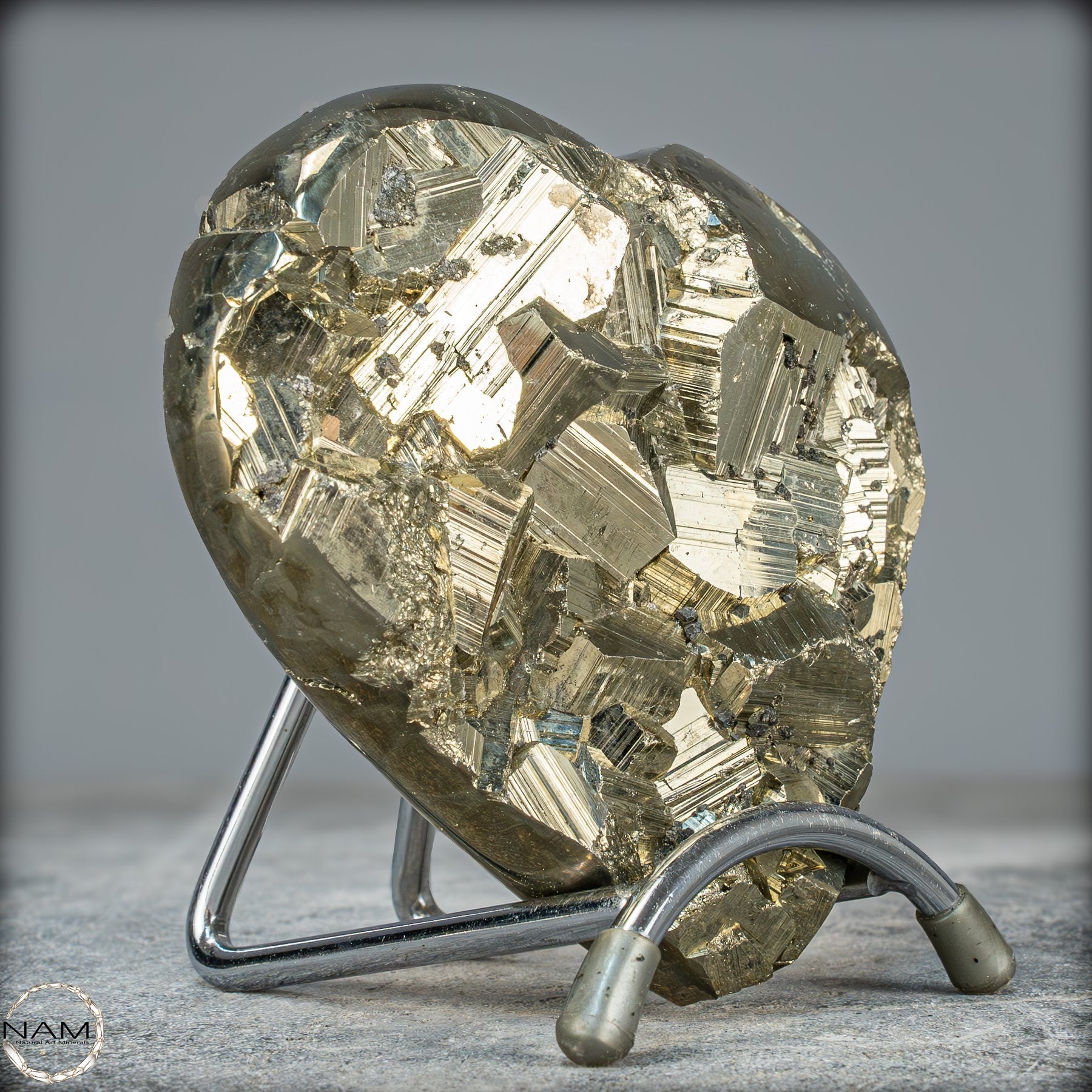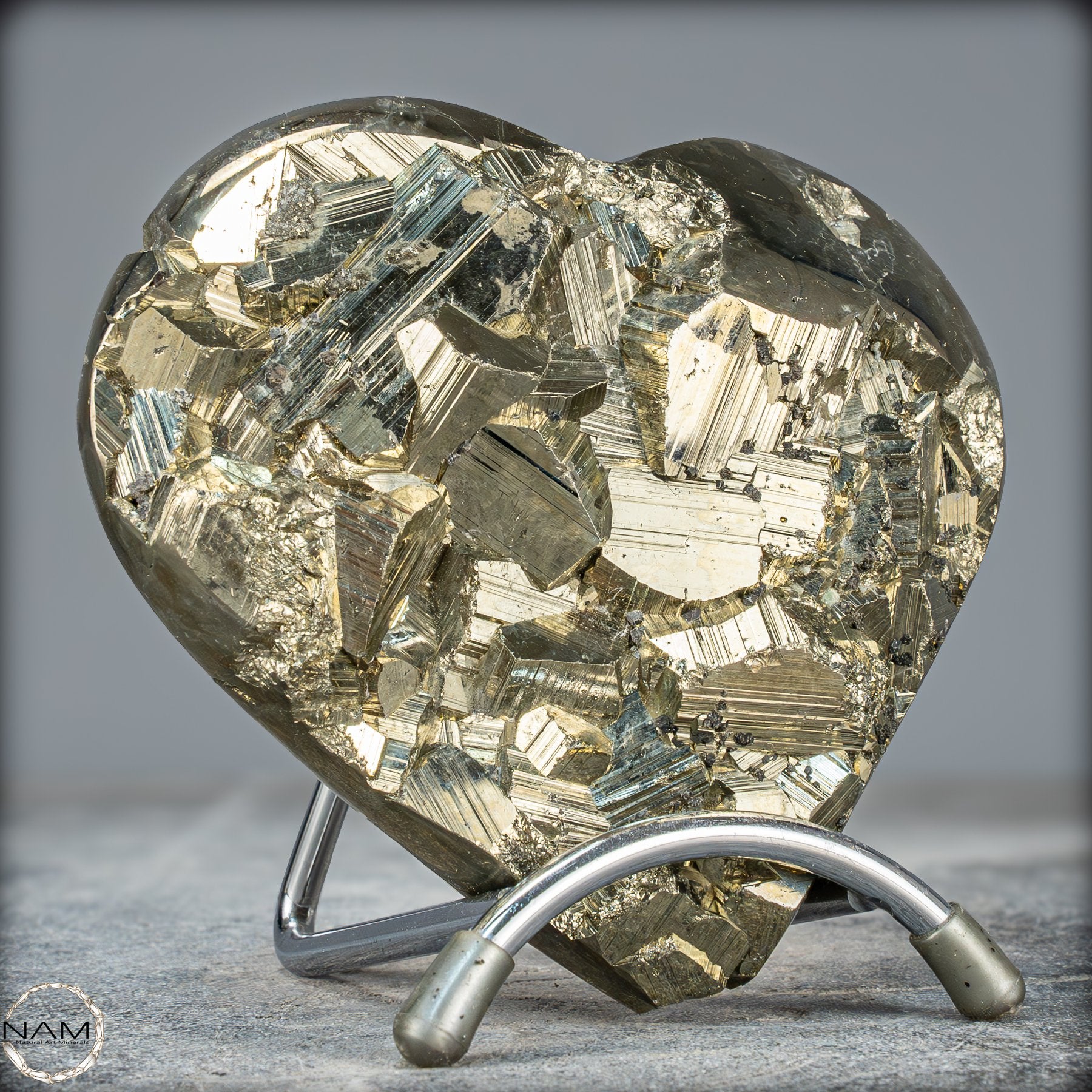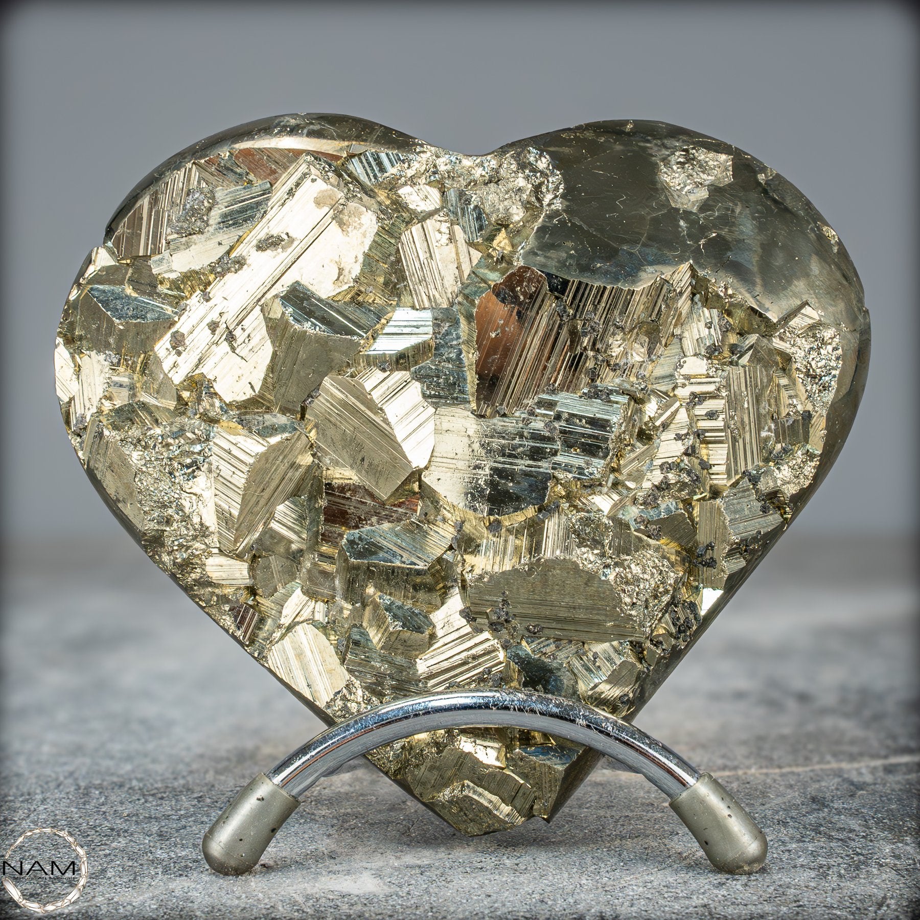 Dieses beeindruckende Pyrit-Herz zieht sofort die Aufmerksamkeit mit seiner natürlichen, glänzenden goldenen Farbe und seinen klaren geometrischen Kristallstrukturen auf sich. Der Stein funkelt in verschiedenen Facetten und schafft ein außergewöhnliches Spiel von Licht und Reflexion, das seine faszinierende, metallische Schönheit hervorhebt.