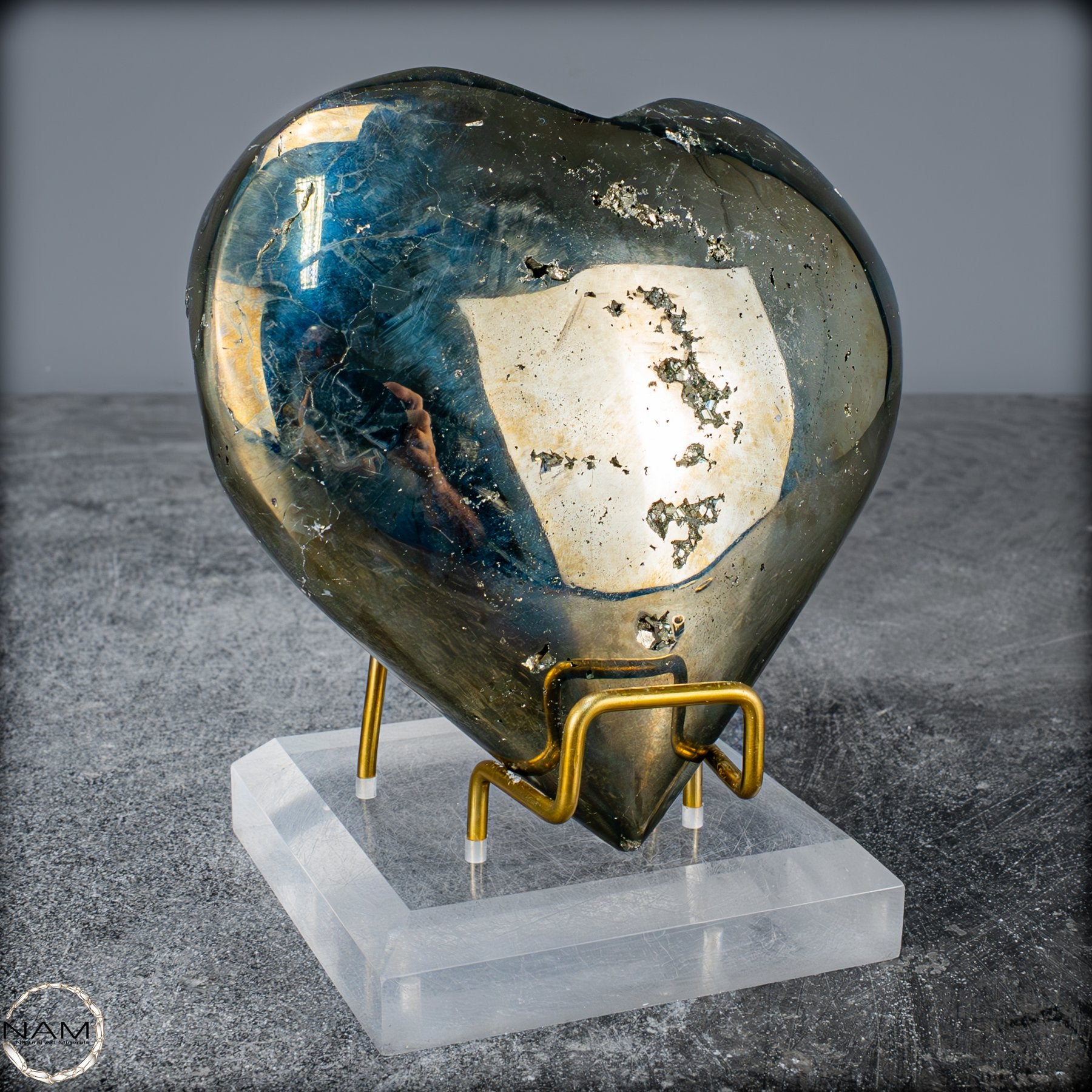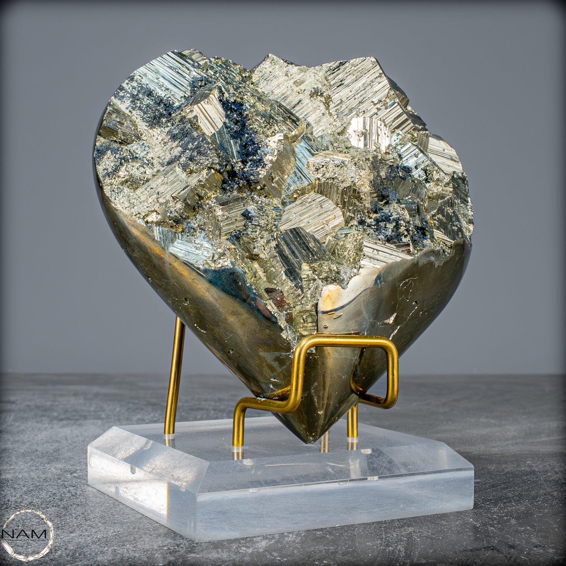 Dieses beeindruckende Pyrit-Herz zieht sofort die Aufmerksamkeit mit seiner natürlichen, glänzenden goldenen Farbe und seinen klaren geometrischen Kristallstrukturen auf sich. Der Stein funkelt in verschiedenen Facetten und schafft ein außergewöhnliches Spiel von Licht und Reflexion, das seine faszinierende, metallische Schönheit hervorhebt.