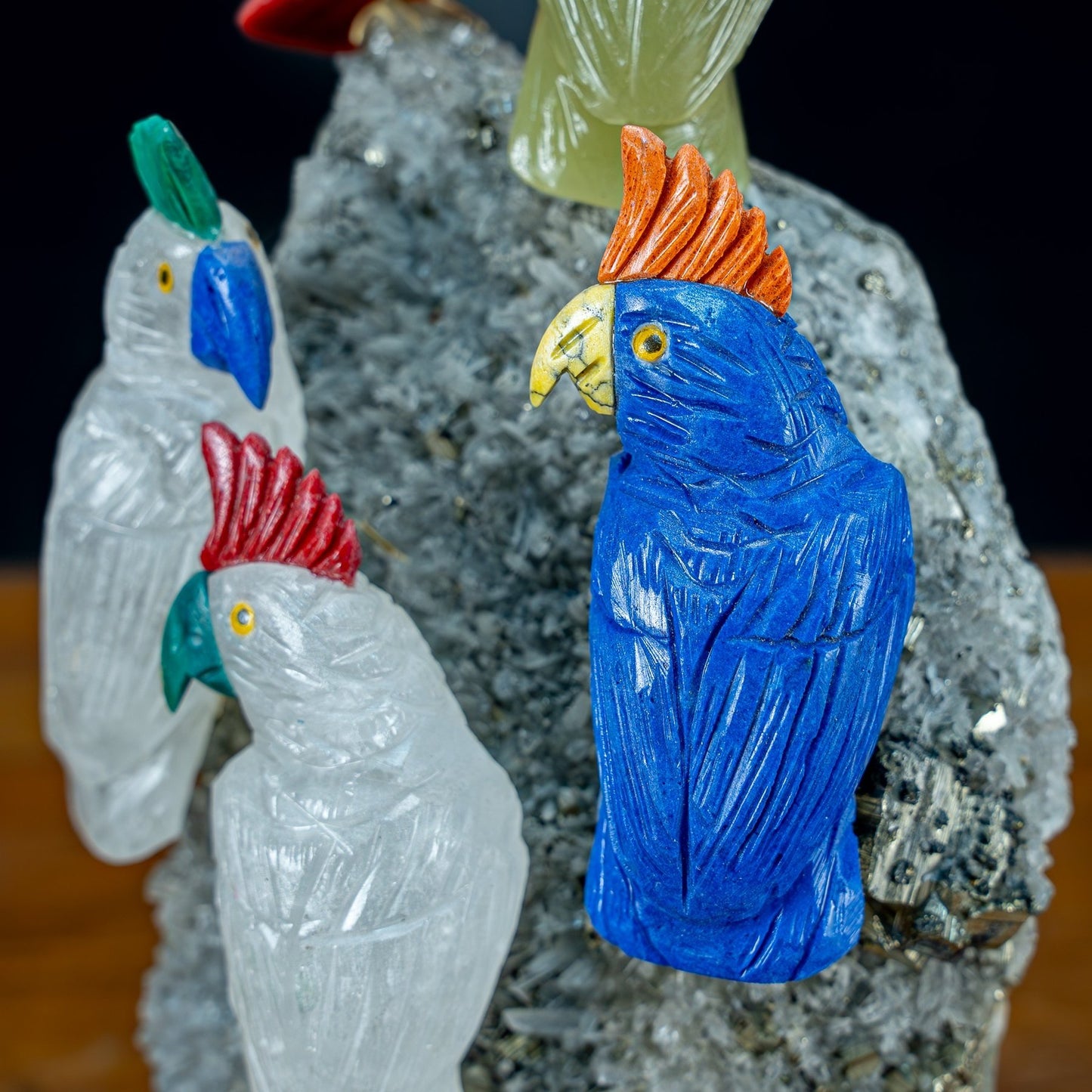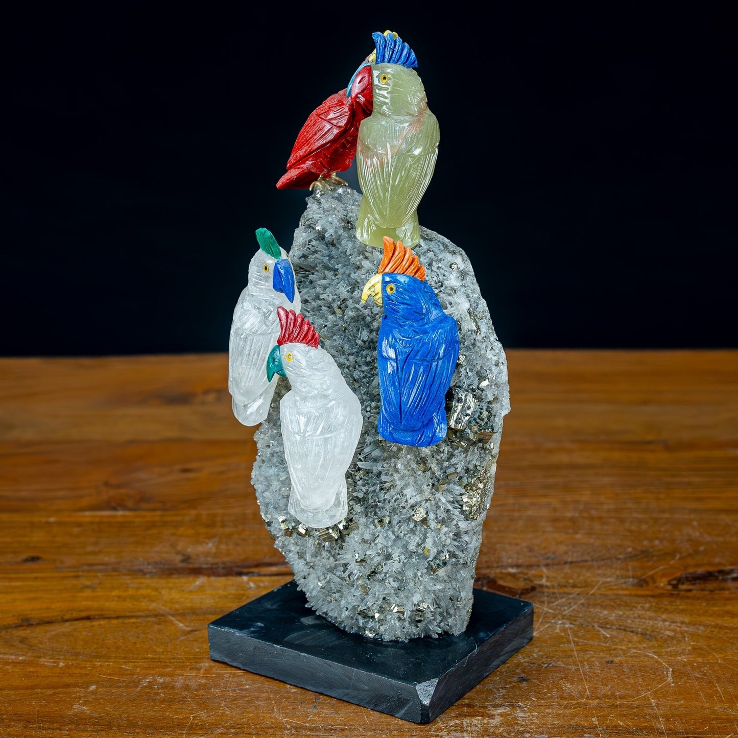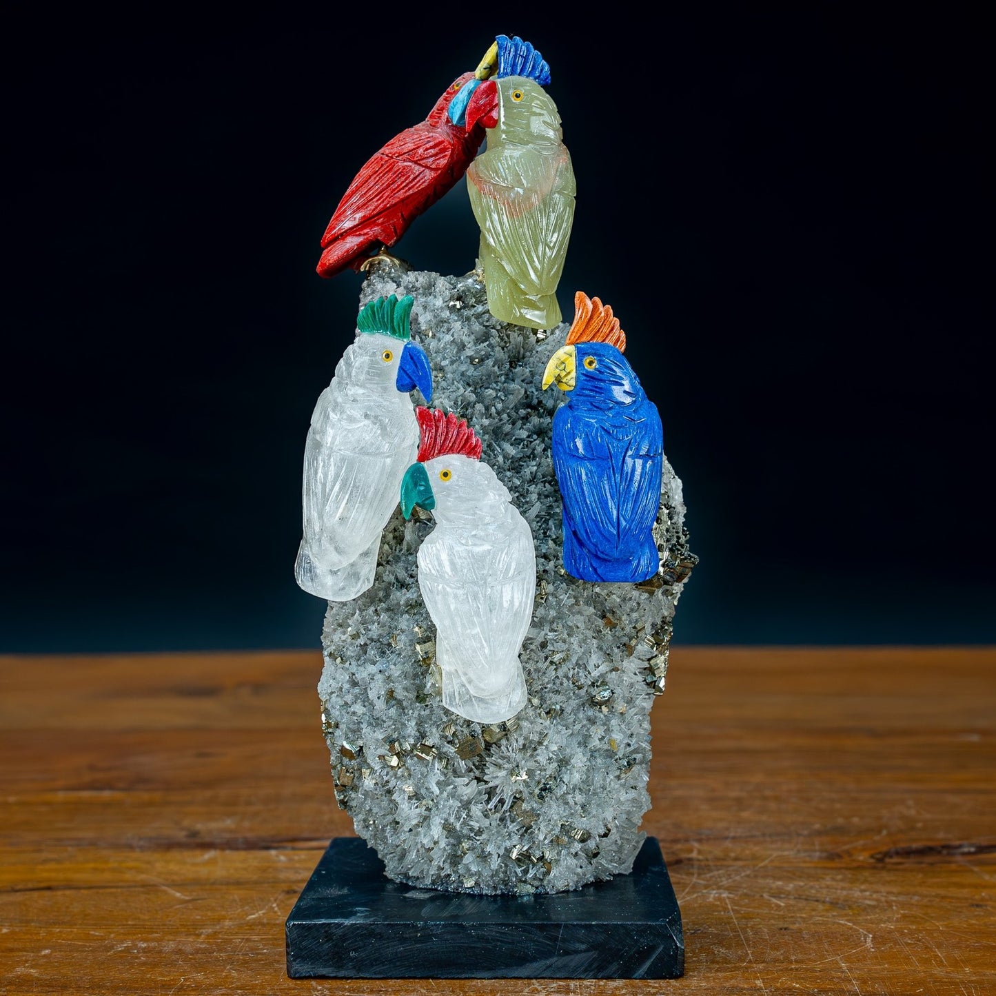 Wunderschöne Quarzskulptur, die 4 Papagaien darstellt, die auf einer großen Quarzkluster ruhen.