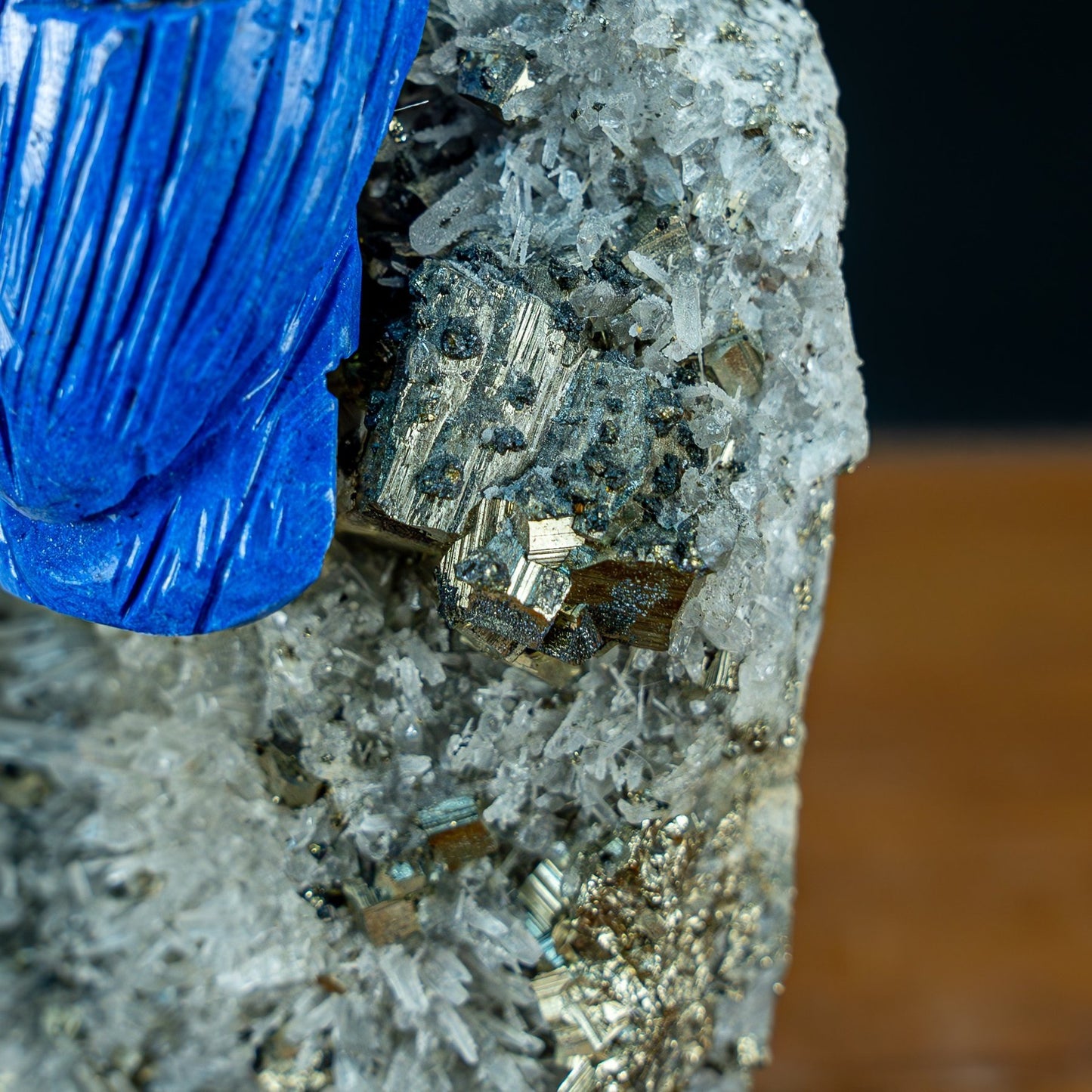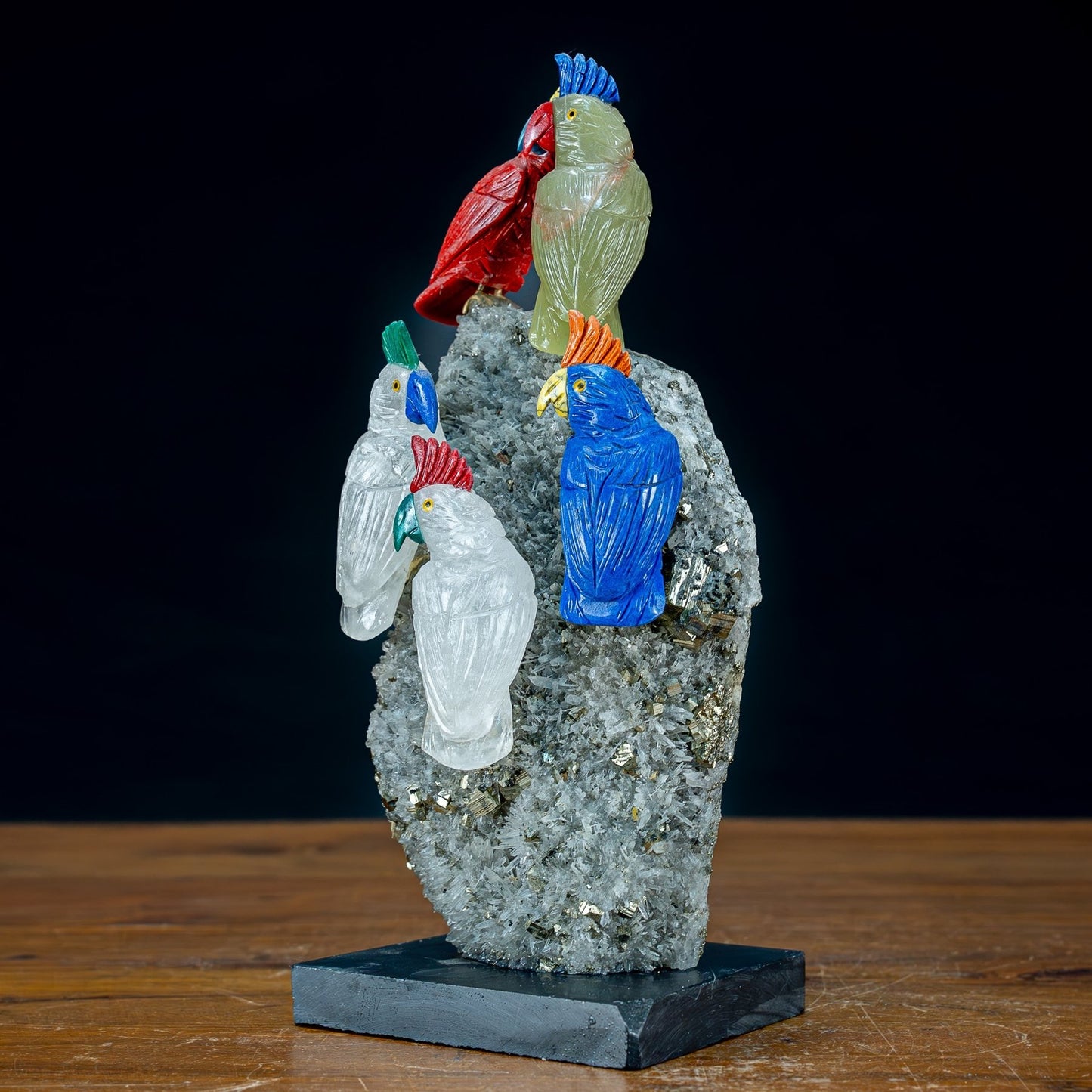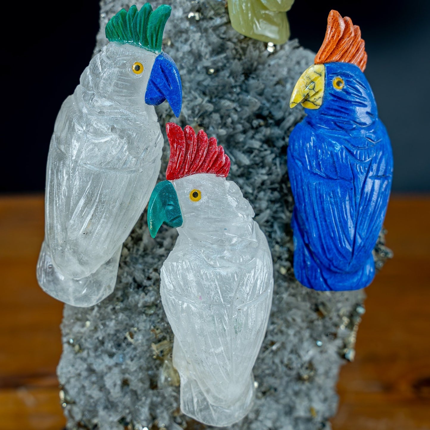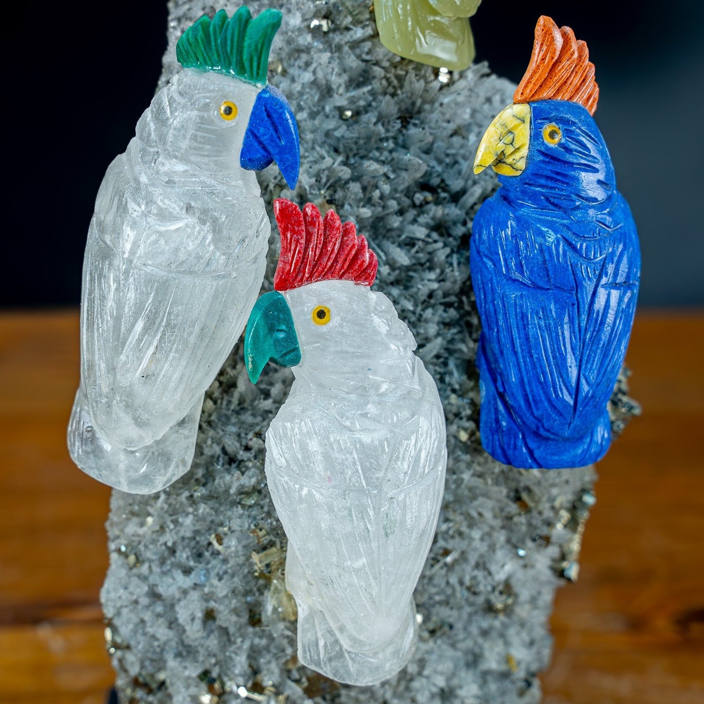 Wunderschöne Quarzskulptur, die 4 Papagaien darstellt, die auf einer großen Quarzkluster ruhen.