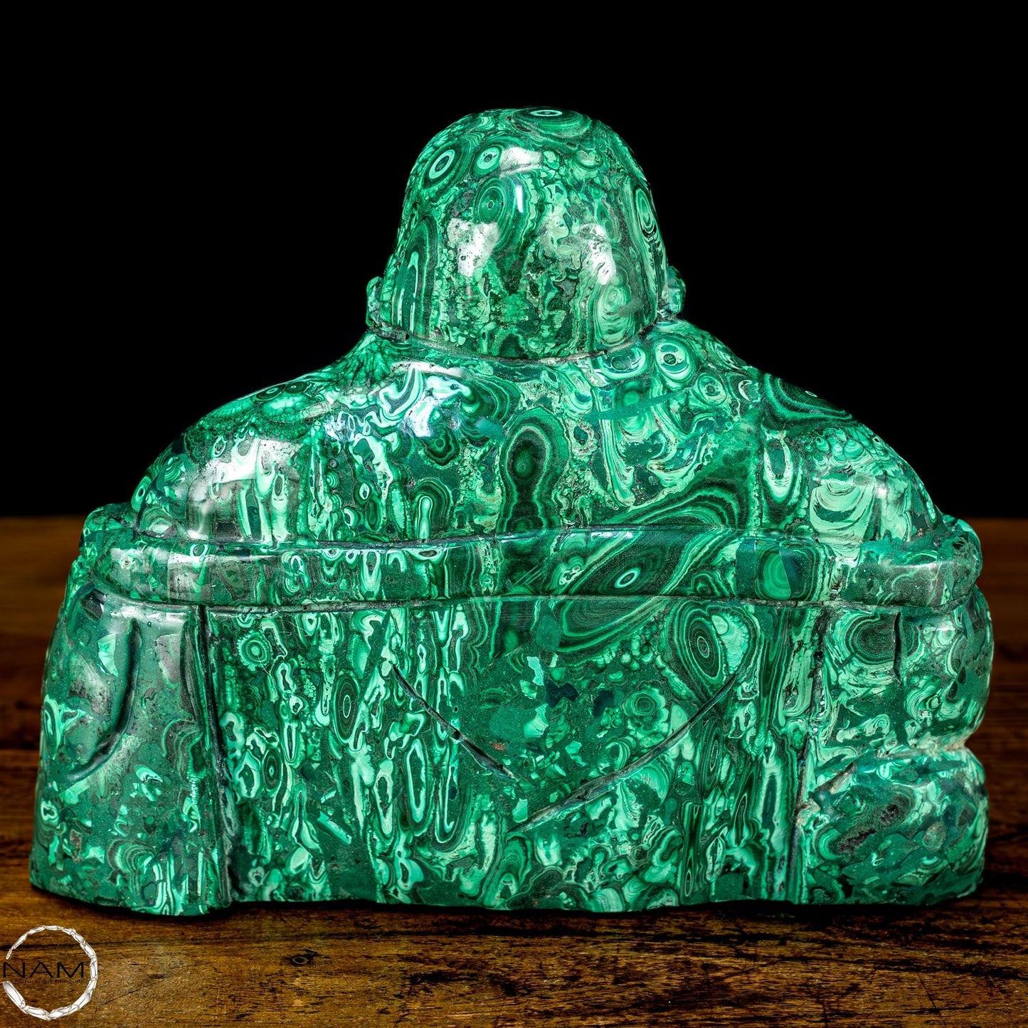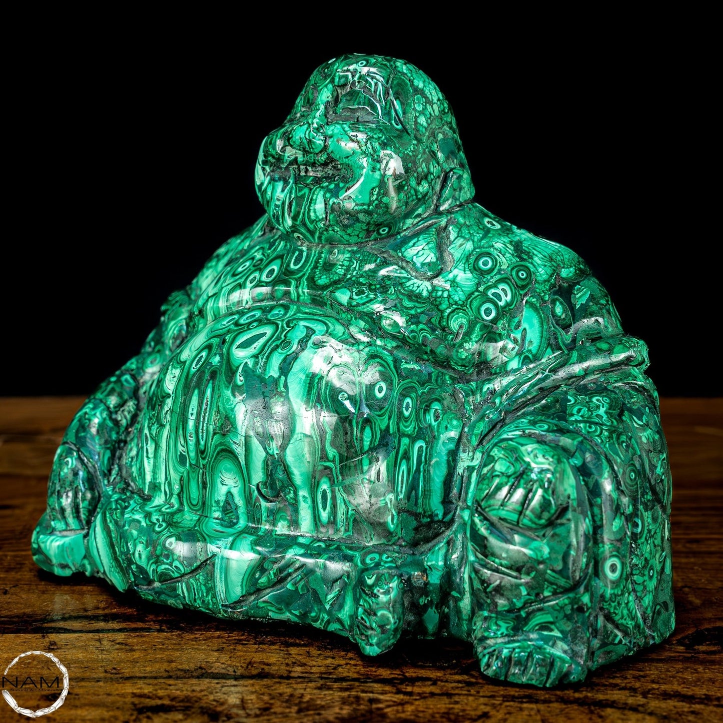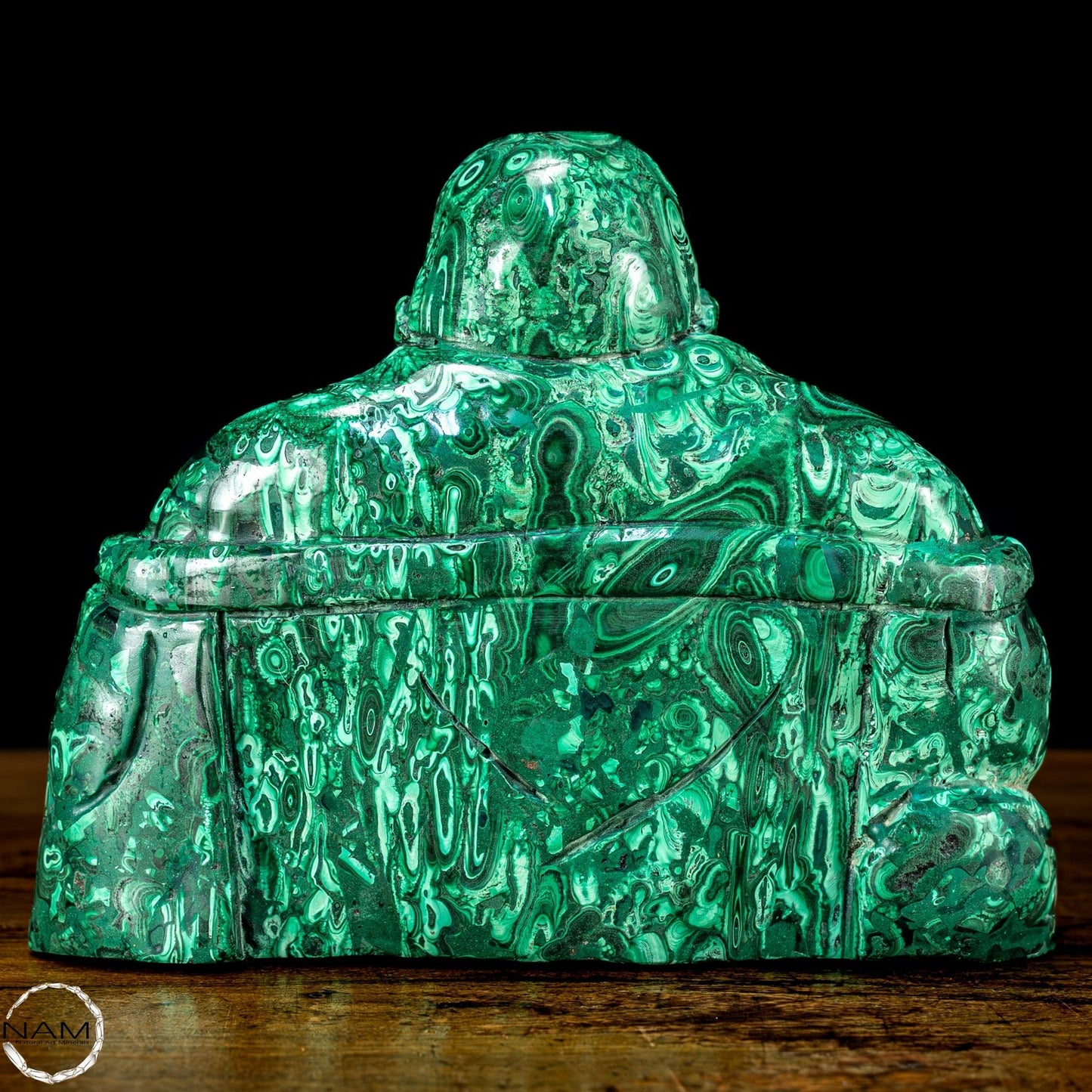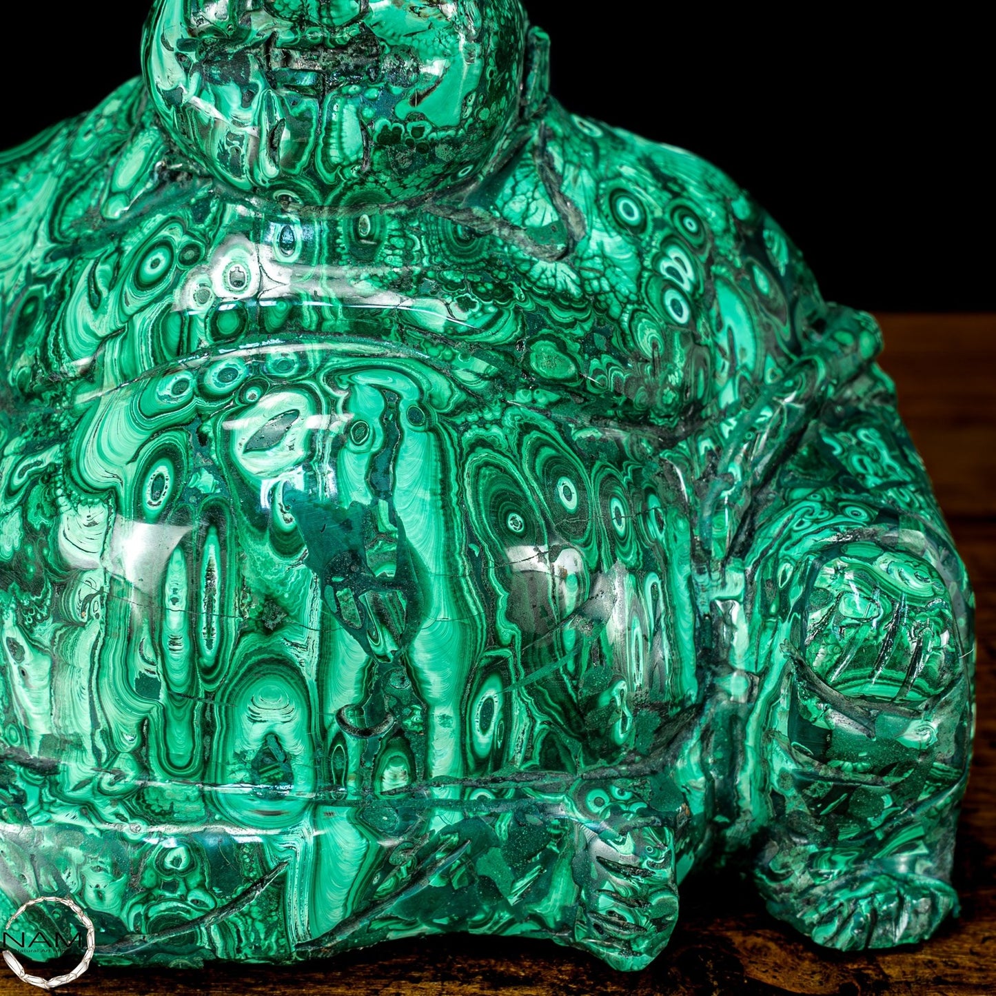 Der Buddha wurde mit großer Detailtreue geschnitzt und zeigt den traditionellen, freundlichen und friedvollen Ausdruck eines sitzenden Buddha. Seine runden Formen und die sanften Linien der Skulptur sind ein faszinierendes Beispiel für die Kunstfertigkeit der Handwerker. Durch die Verwendung eines massiven Malachitblocks ist jede Linie und jedes Detail in der Skulptur unverwechselbar und einzigartig. Der Malachit verleiht der Figur nicht nur eine beeindruckende visuelle Wirkung, sondern hat auch spirituelle Bedeutung, da der Stein für Heilung und Transformation geschätzt wird.