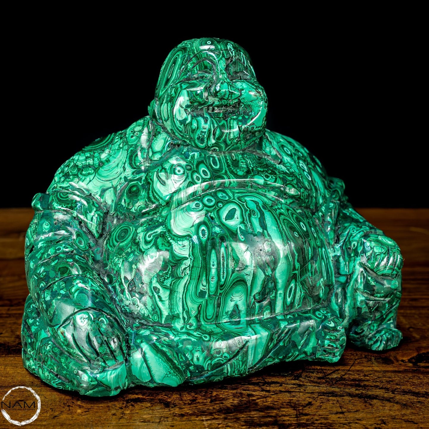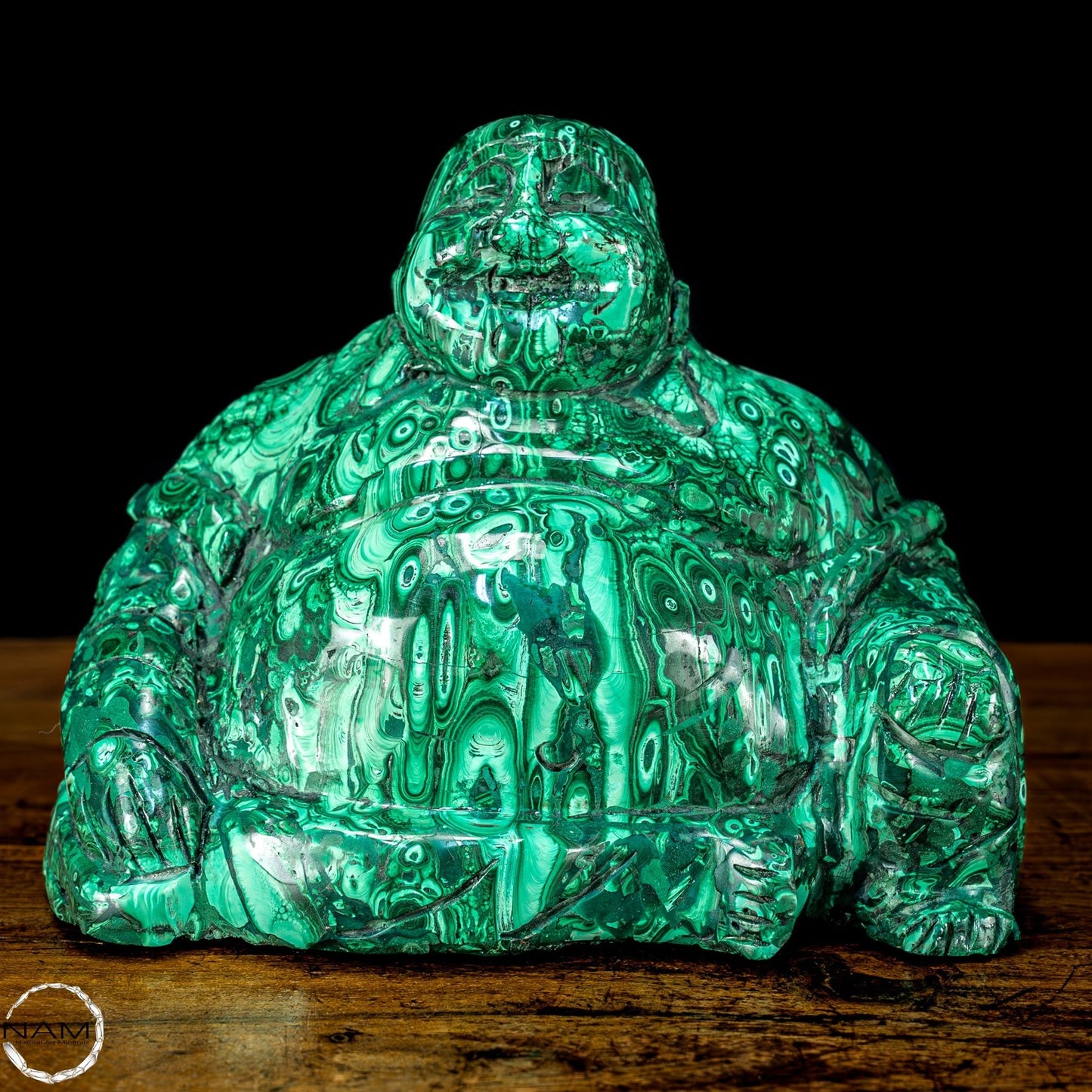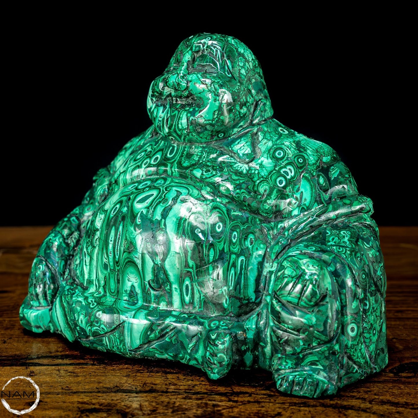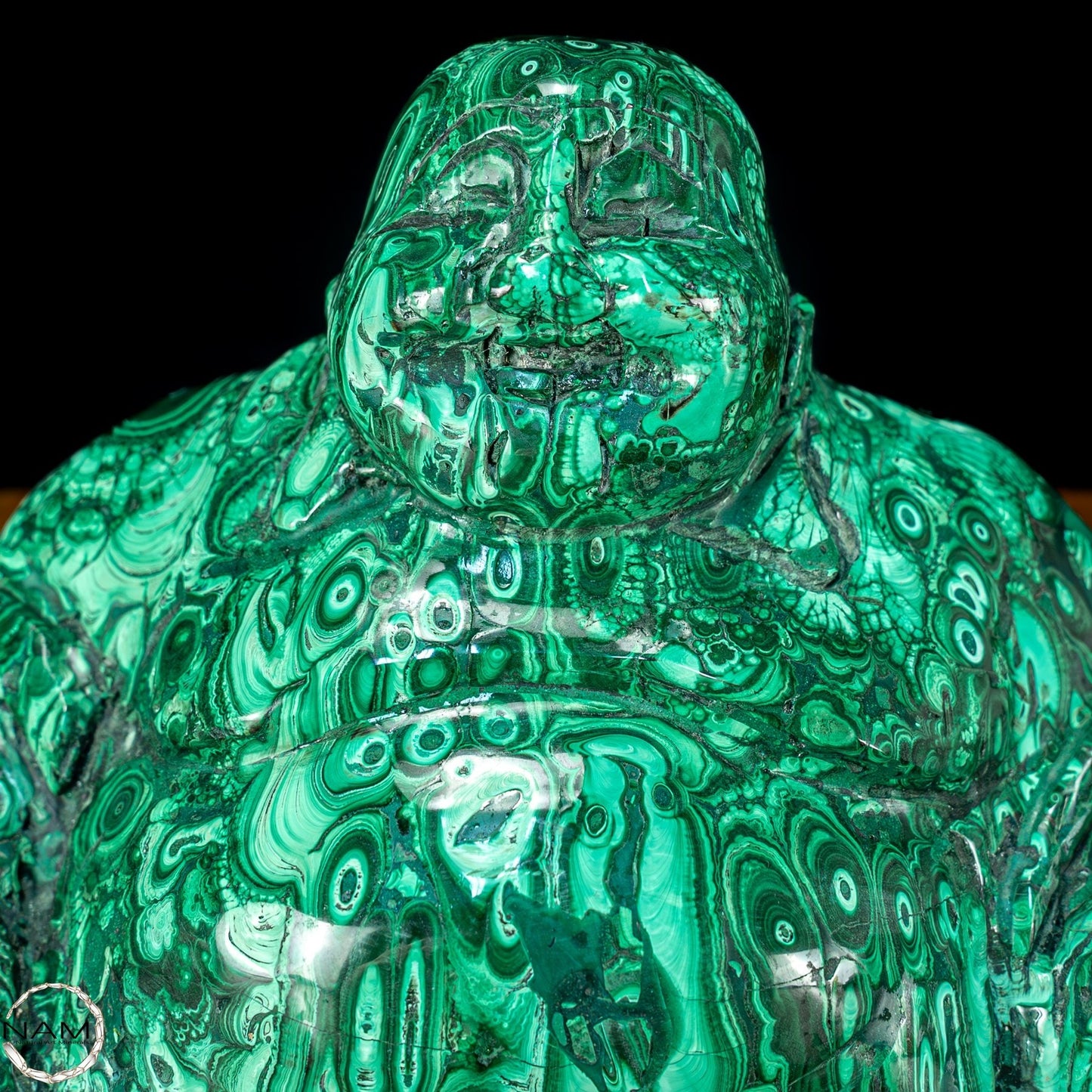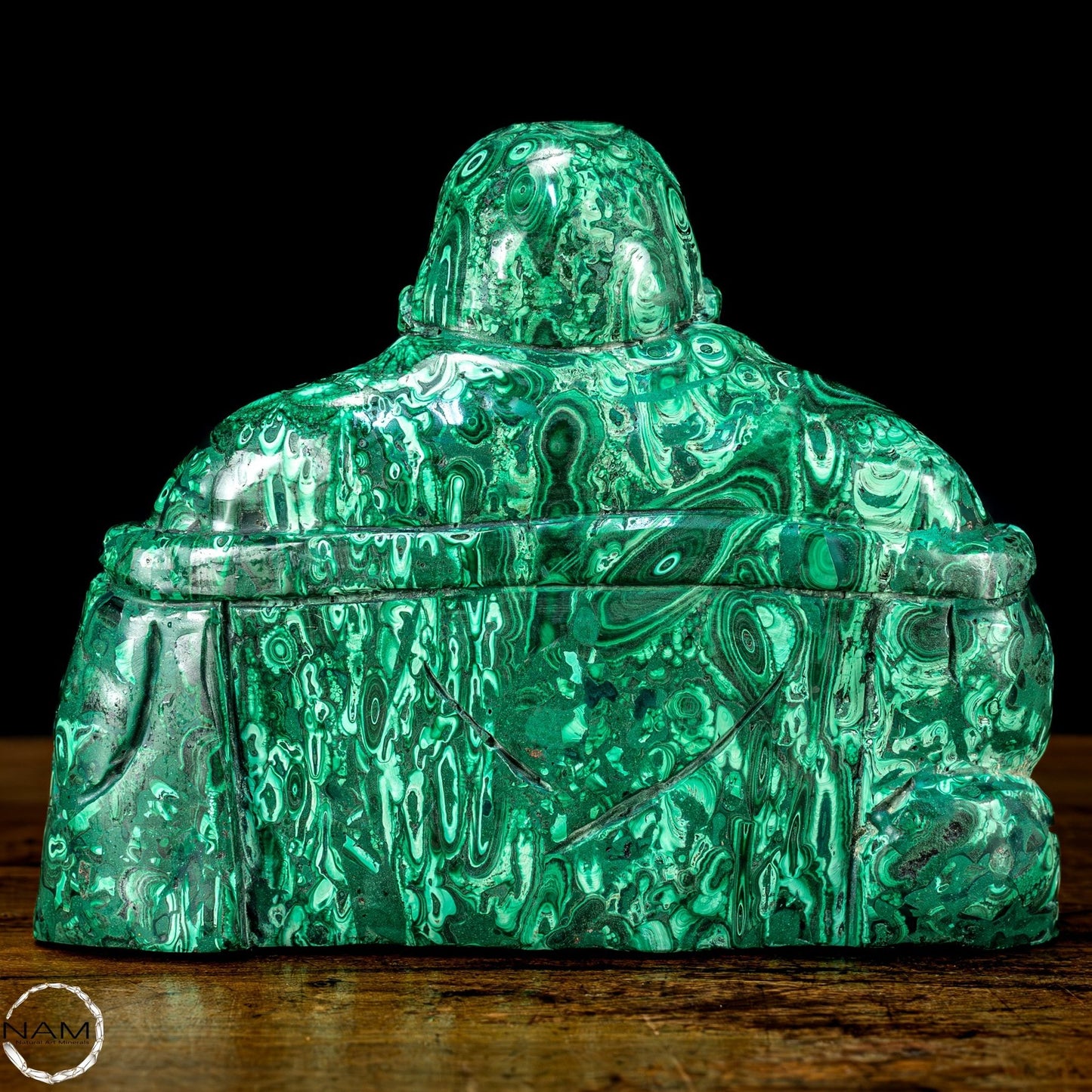 Der Buddha wurde mit großer Detailtreue geschnitzt und zeigt den traditionellen, freundlichen und friedvollen Ausdruck eines sitzenden Buddha. Seine runden Formen und die sanften Linien der Skulptur sind ein faszinierendes Beispiel für die Kunstfertigkeit der Handwerker. Durch die Verwendung eines massiven Malachitblocks ist jede Linie und jedes Detail in der Skulptur unverwechselbar und einzigartig. Der Malachit verleiht der Figur nicht nur eine beeindruckende visuelle Wirkung, sondern hat auch spirituelle Bedeutung, da der Stein für Heilung und Transformation geschätzt wird.