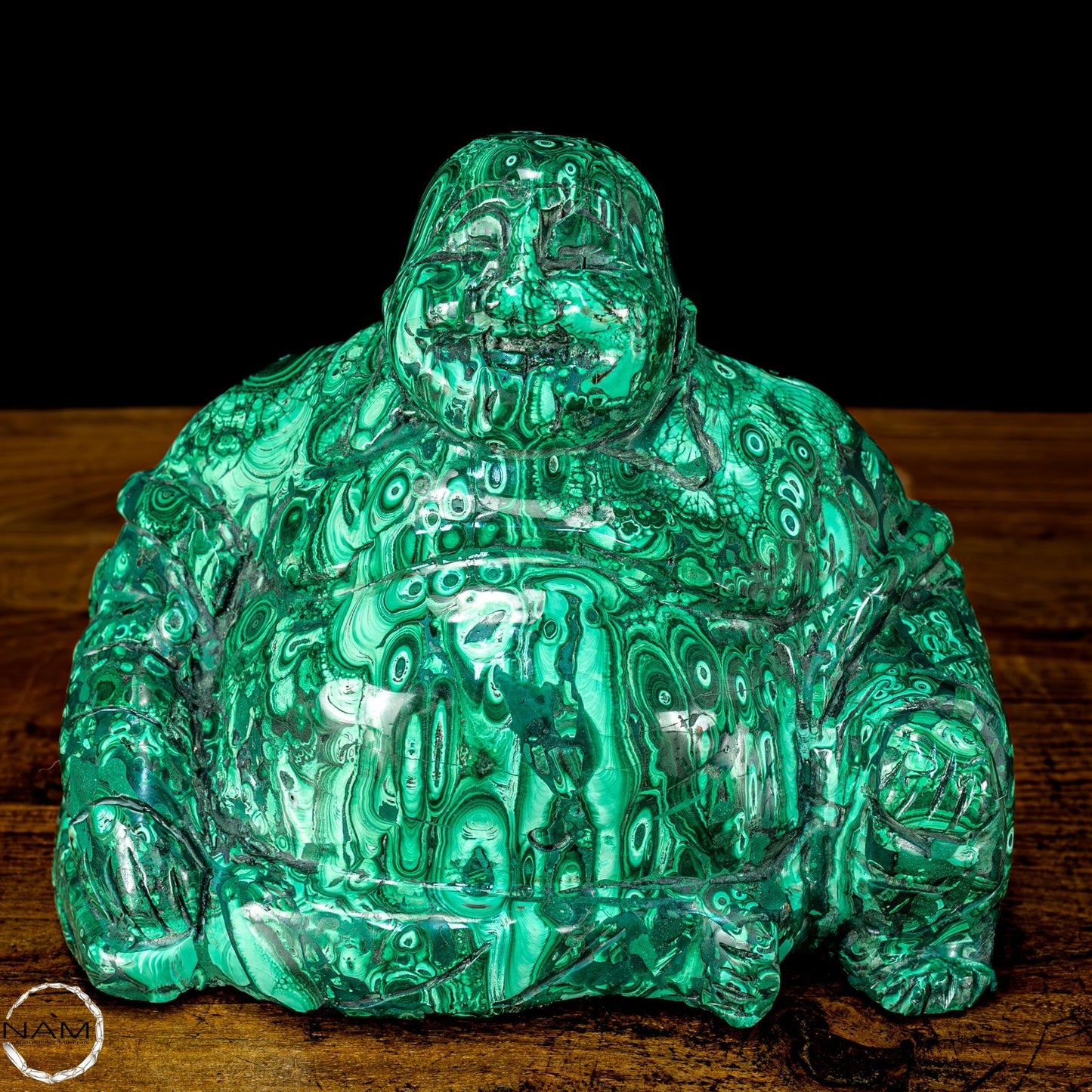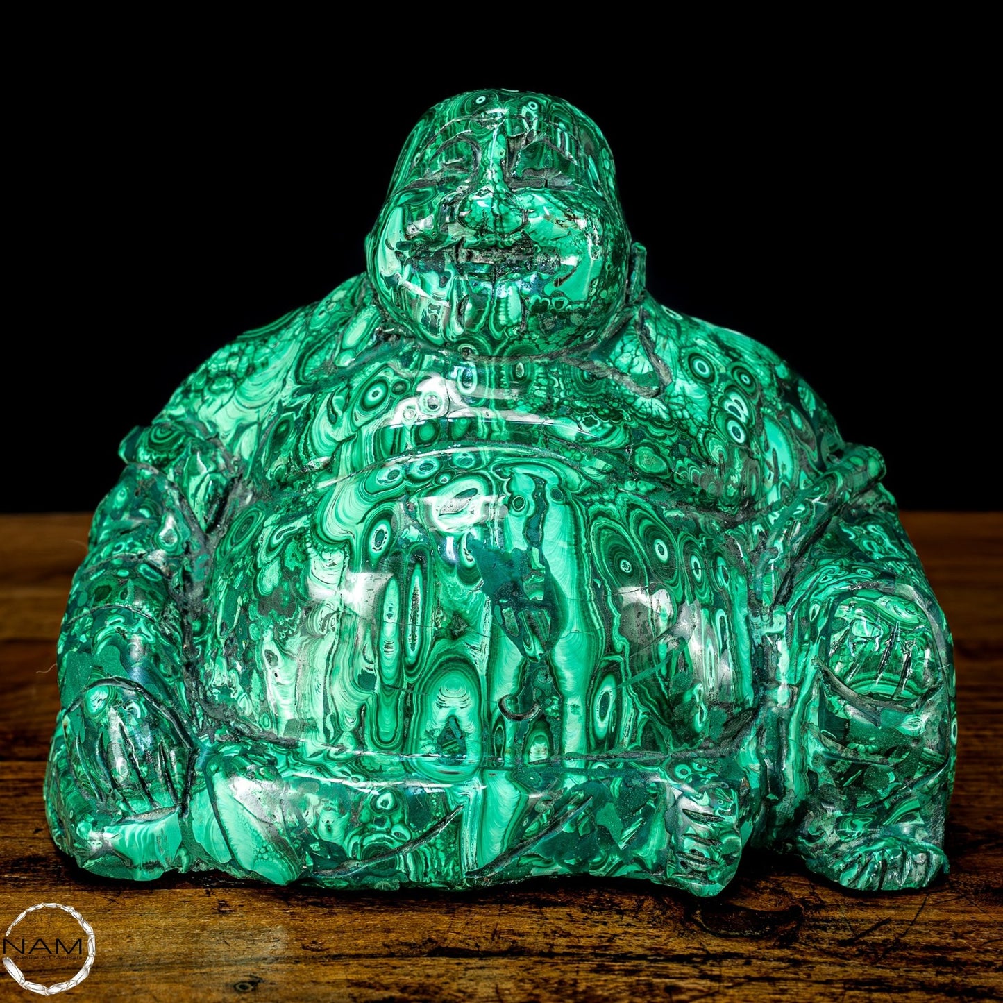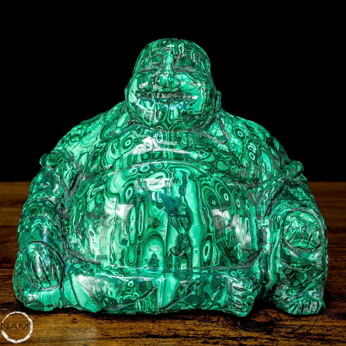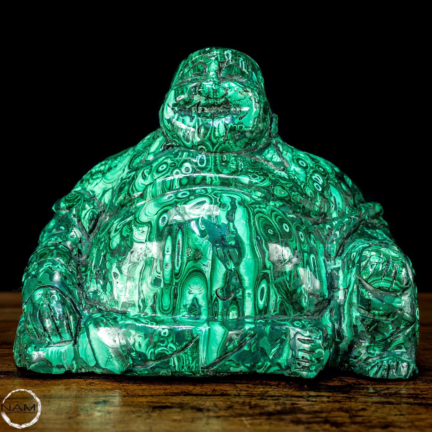 Der Buddha wurde mit großer Detailtreue geschnitzt und zeigt den traditionellen, freundlichen und friedvollen Ausdruck eines sitzenden Buddha. Seine runden Formen und die sanften Linien der Skulptur sind ein faszinierendes Beispiel für die Kunstfertigkeit der Handwerker. Durch die Verwendung eines massiven Malachitblocks ist jede Linie und jedes Detail in der Skulptur unverwechselbar und einzigartig. Der Malachit verleiht der Figur nicht nur eine beeindruckende visuelle Wirkung, sondern hat auch spirituelle Bedeutung, da der Stein für Heilung und Transformation geschätzt wird.