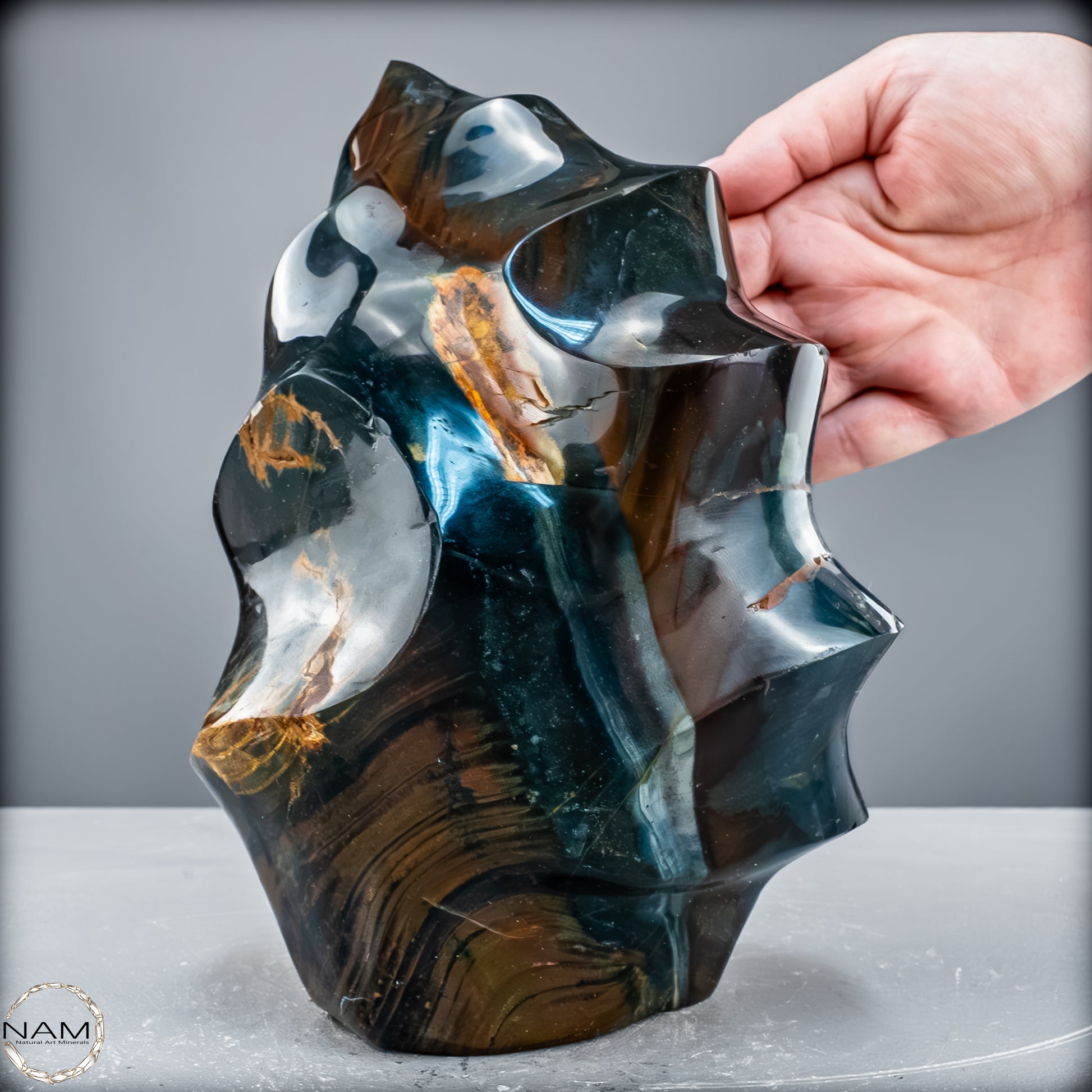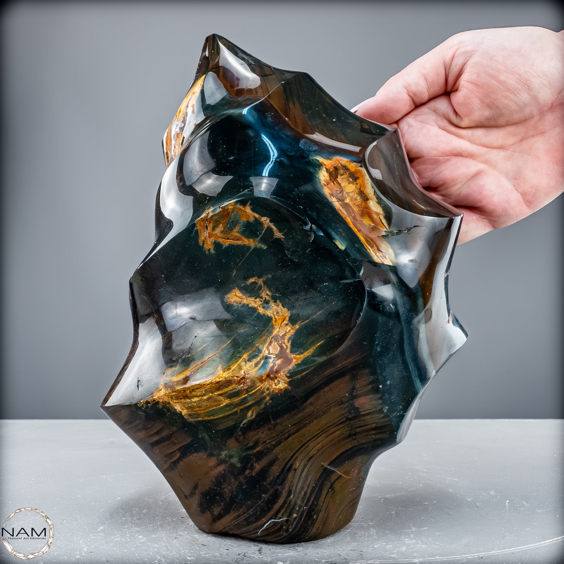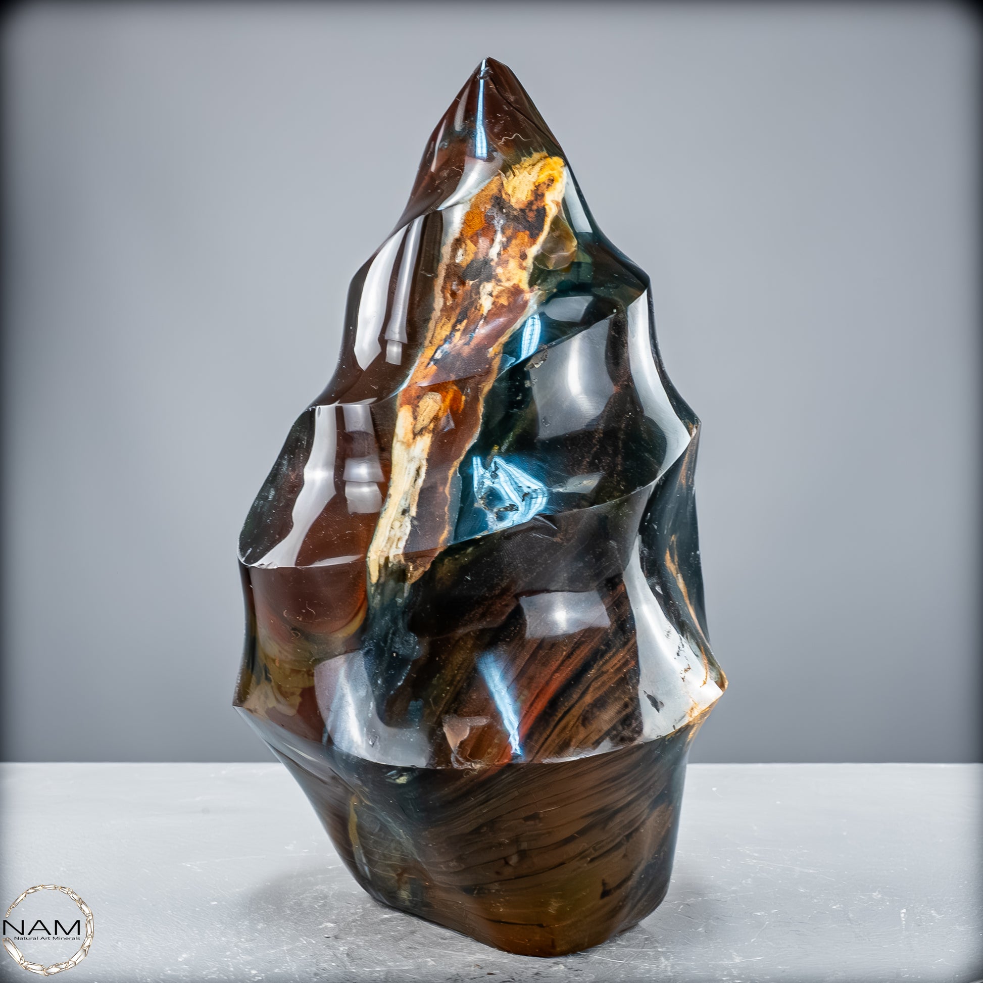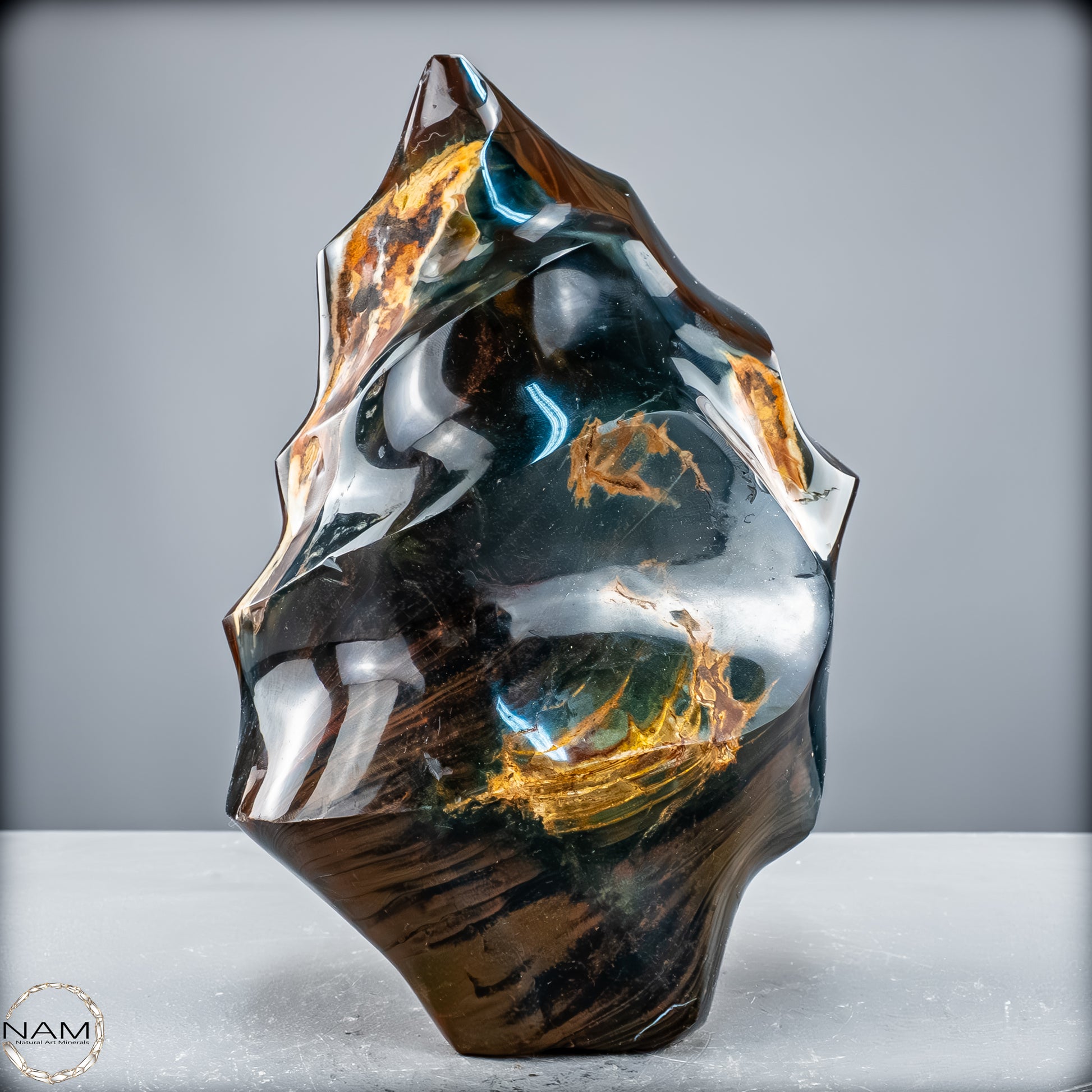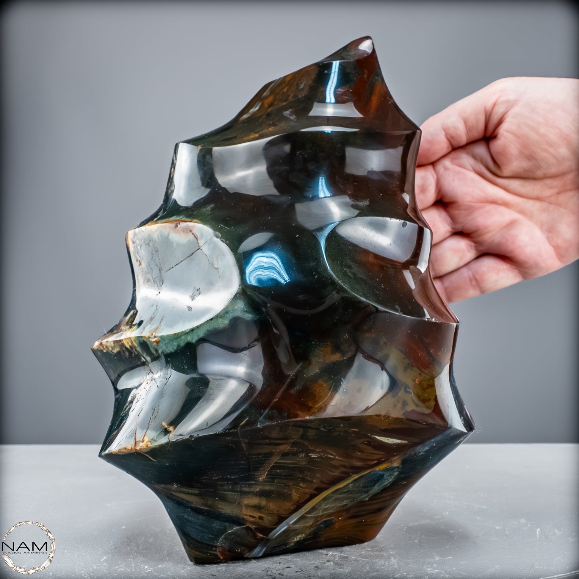 Die glatte, hochglanzpolierte Oberfläche hebt die geheimnisvollen Strukturen und Maserungen besonders stark hervor. Jeder Blickwinkel offenbart neue Details – von fließenden Linien bis hin zu intensiven Farbwirbeln, die an glühende Lava oder mystische Landschaften erinnern.