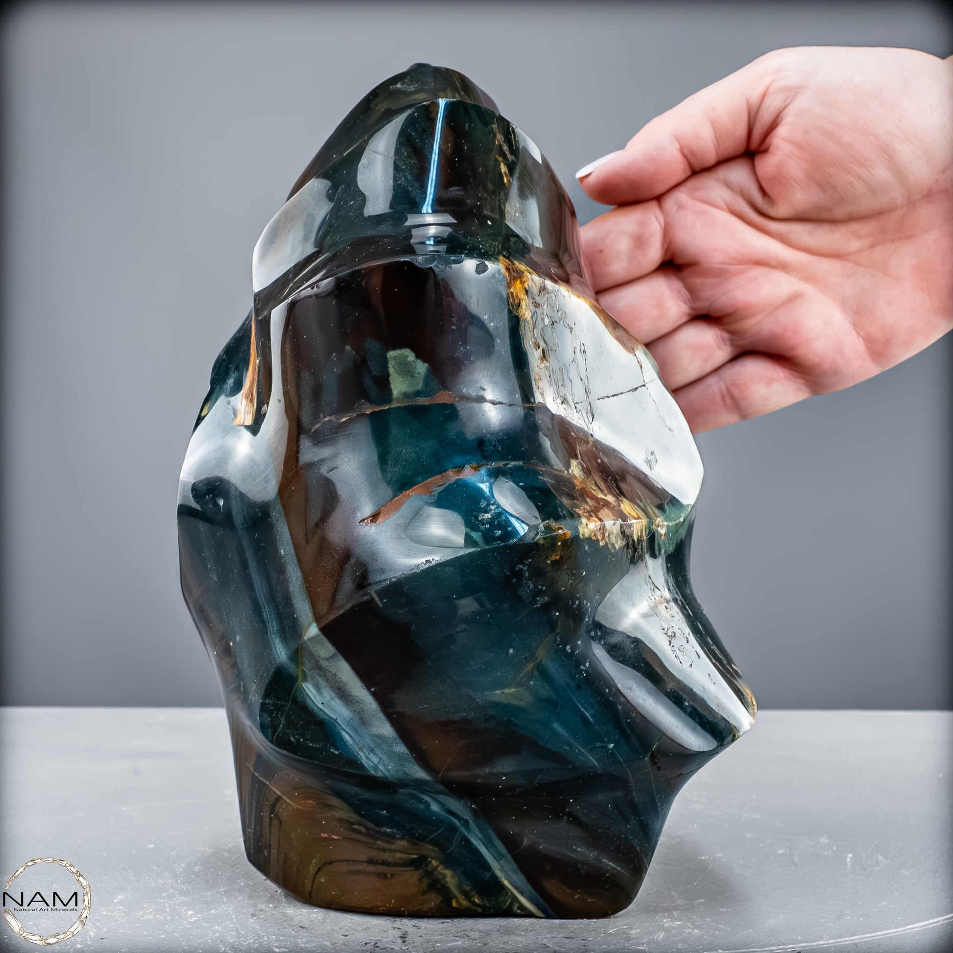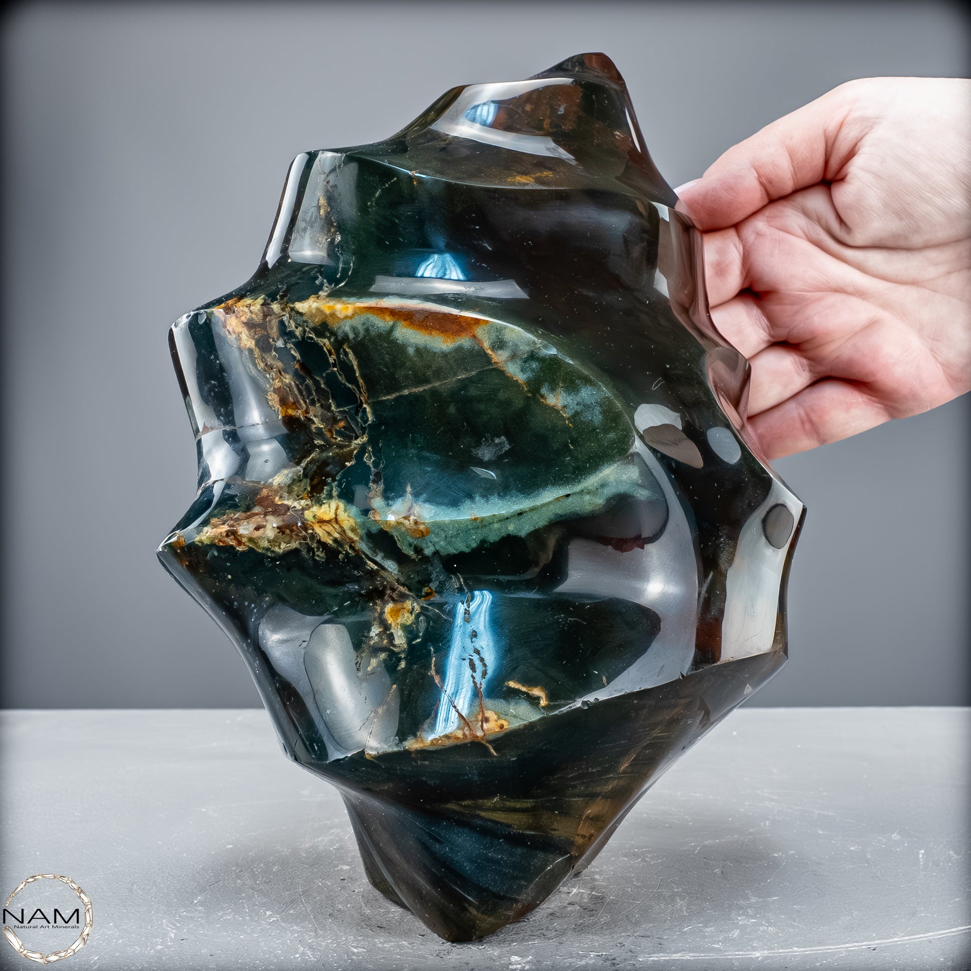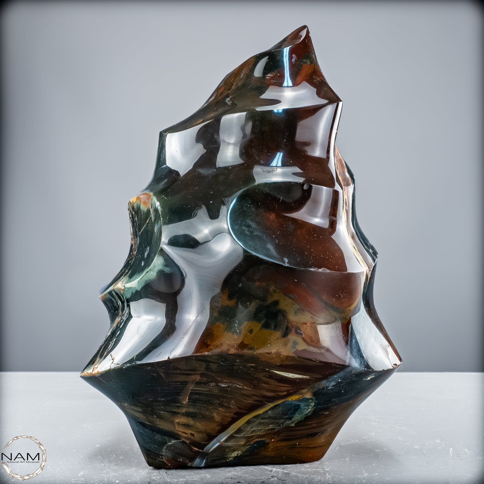 Diese beeindruckende Achat-Jaspis Flamme vereint natürliche Ausdruckskraft mit meisterhafter Politur und zeigt ein faszinierendes Farbspiel aus tiefem Dunkelgrün, warmem Braun sowie goldenen und bernsteinfarbenen Einschlüssen. Die charakteristische Flammenform verstärkt die Dynamik des Steins und lässt ihn wirken, als würde er sich aus der Erde emporheben.