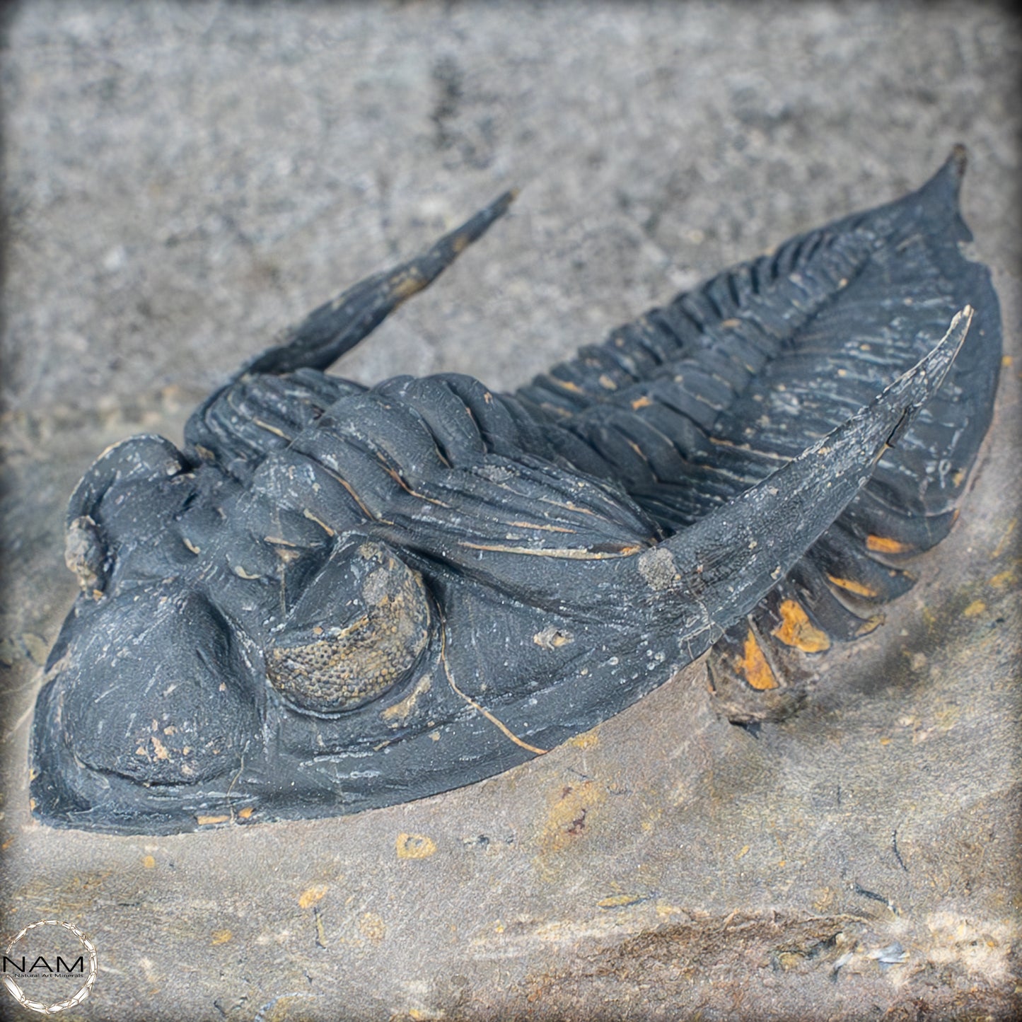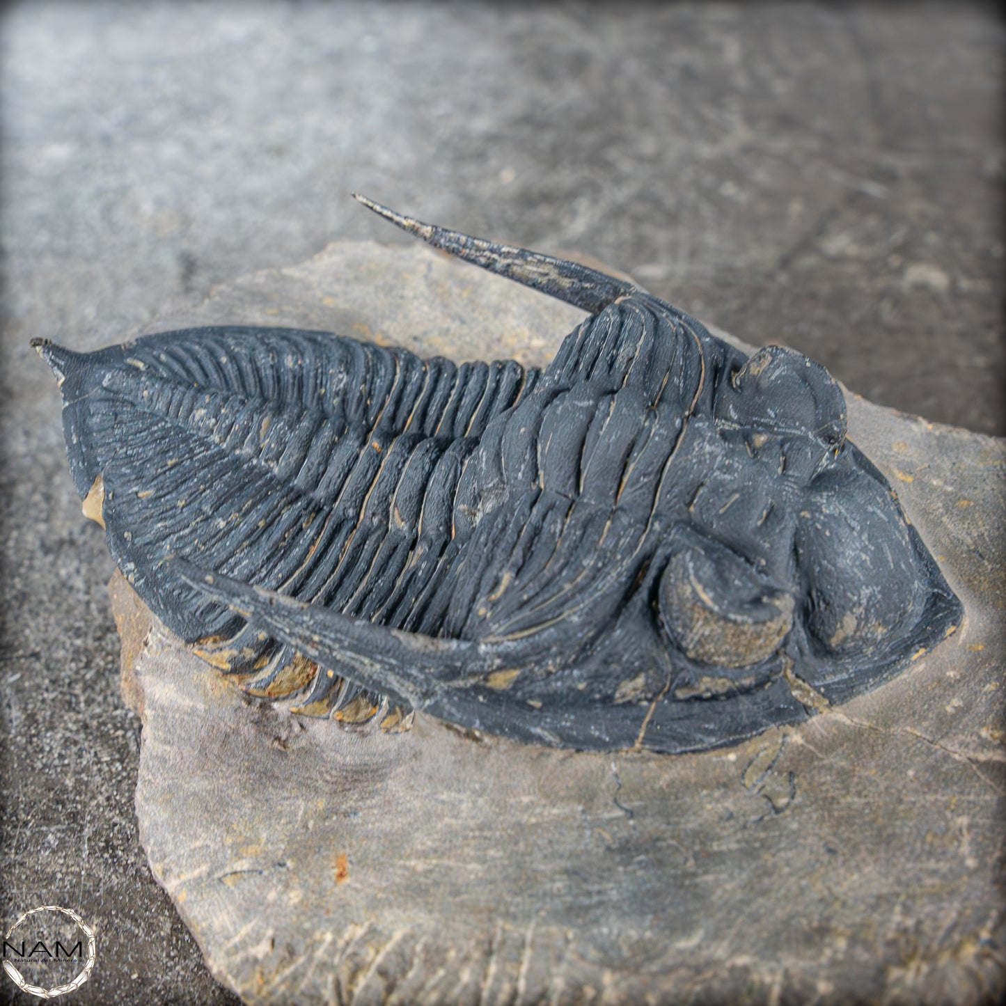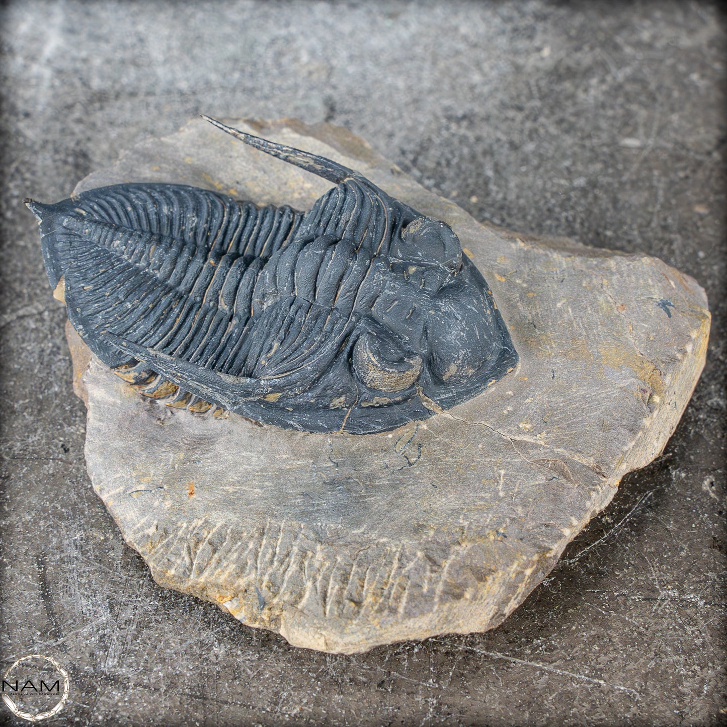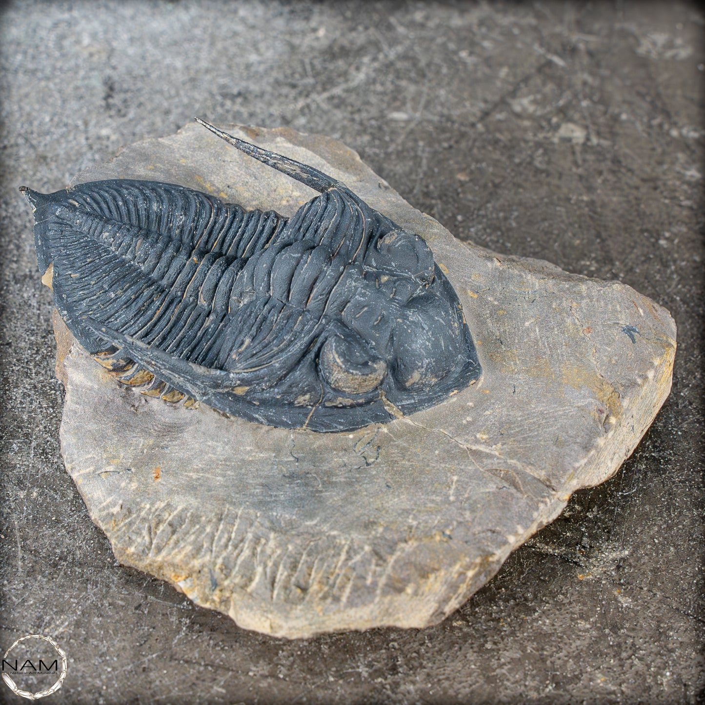 Hier präsentieren wir ein außergewöhnliches Fossil der Art Hollardops mesocristata, einem Trilobiten aus Marokko, der aus der Devon-Zeit stammt, vor etwa 390 Millionen Jahren. Dieses Exemplar zeichnet sich durch seine bemerkenswerte Größe und die gut erhaltenen, feinen Details des Exoskeletts aus. Die deutlichen Rippenstrukturen und das große, facettenreiche Auge dieses Trilobiten vermitteln einen faszinierenden Einblick in die urzeitliche Welt.