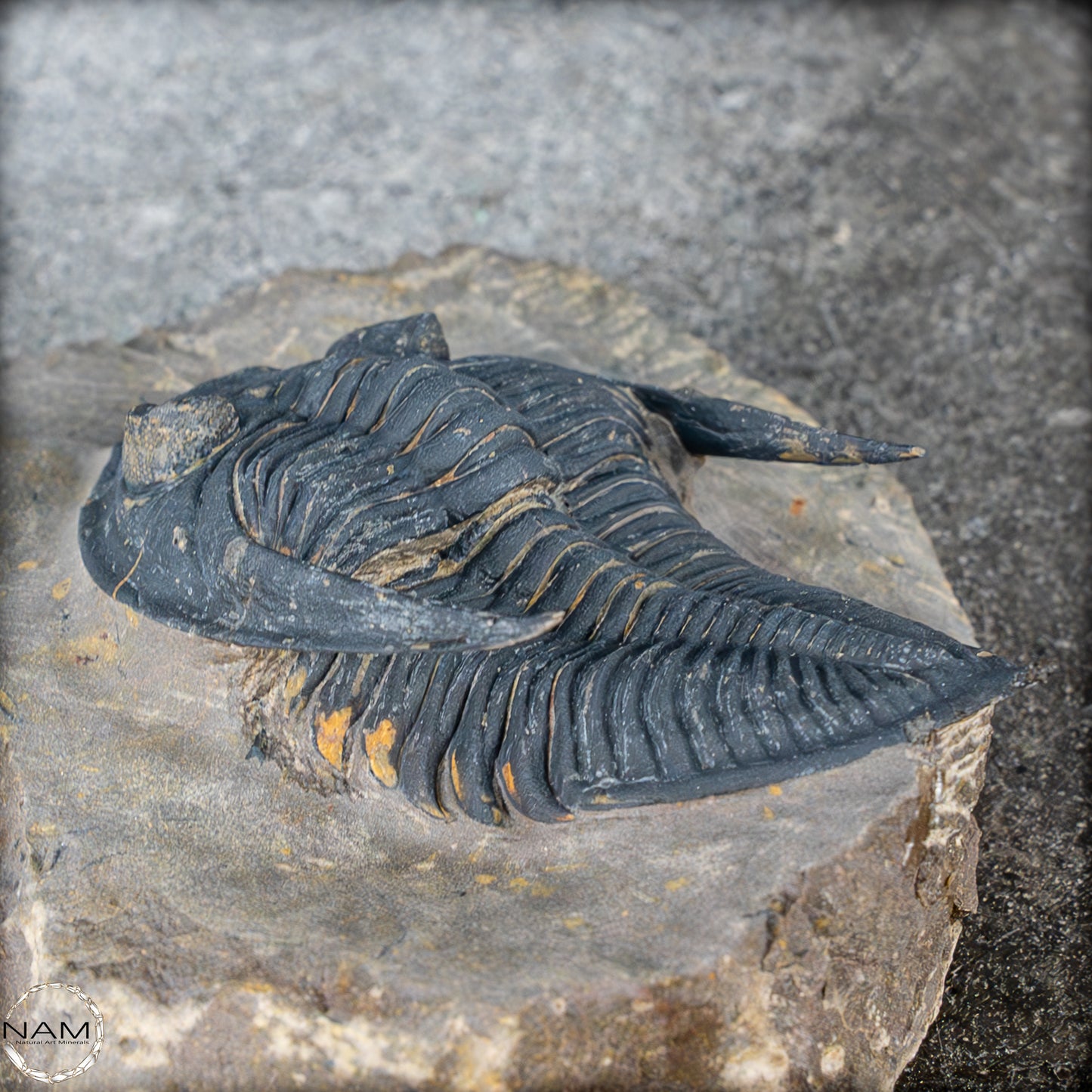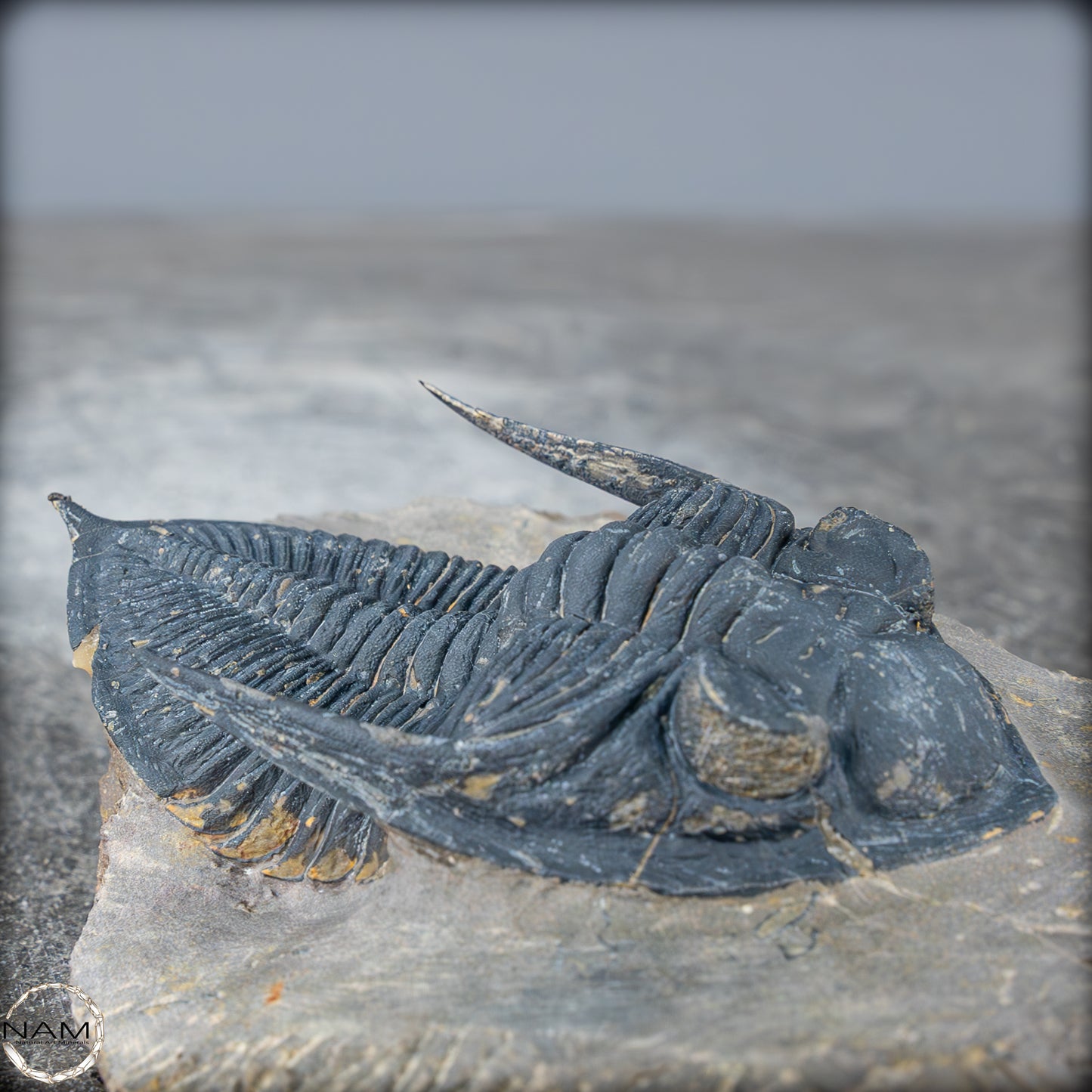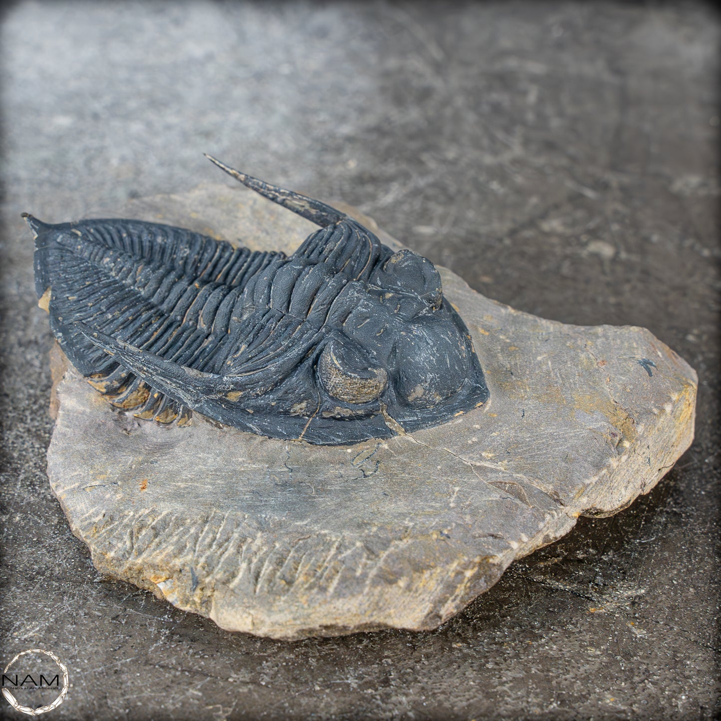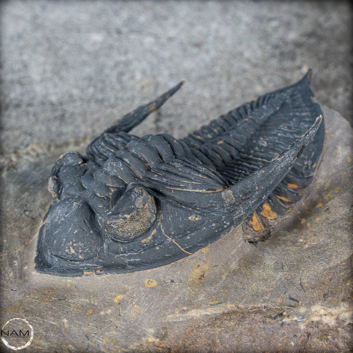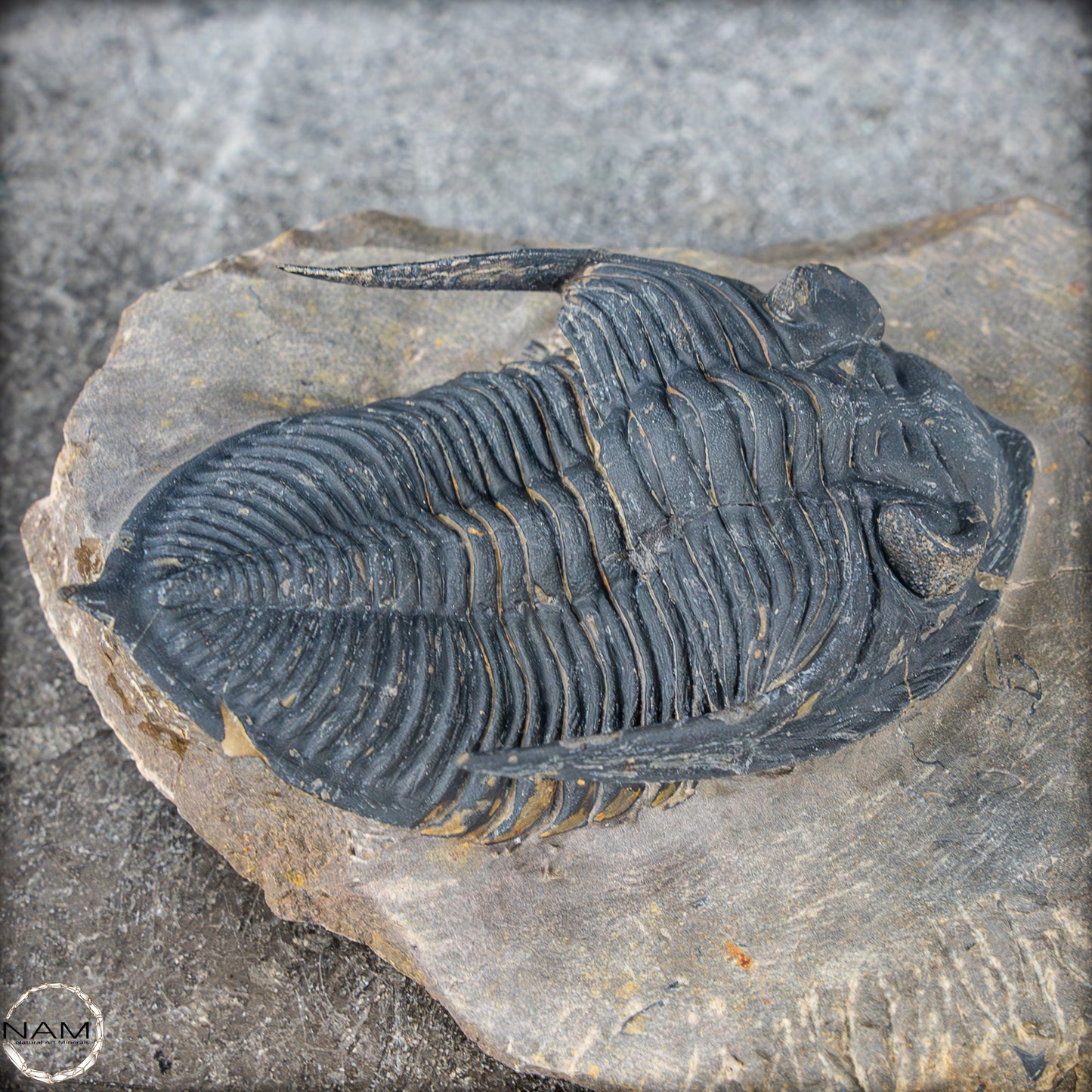 Hier präsentieren wir ein außergewöhnliches Fossil der Art Hollardops mesocristata, einem Trilobiten aus Marokko, der aus der Devon-Zeit stammt, vor etwa 390 Millionen Jahren. Dieses Exemplar zeichnet sich durch seine bemerkenswerte Größe und die gut erhaltenen, feinen Details des Exoskeletts aus. Die deutlichen Rippenstrukturen und das große, facettenreiche Auge dieses Trilobiten vermitteln einen faszinierenden Einblick in die urzeitliche Welt.