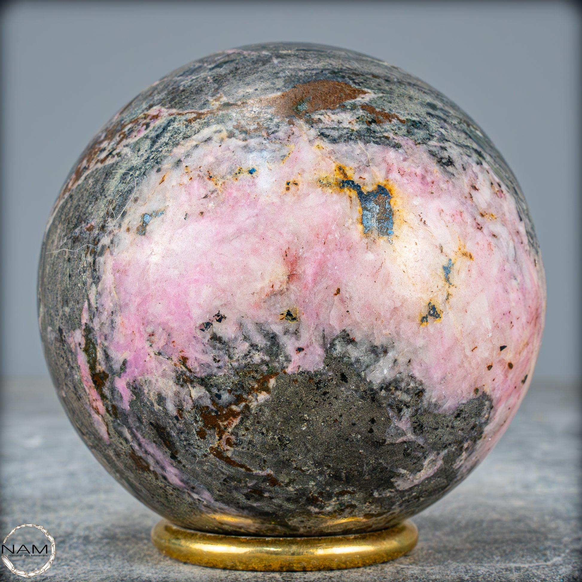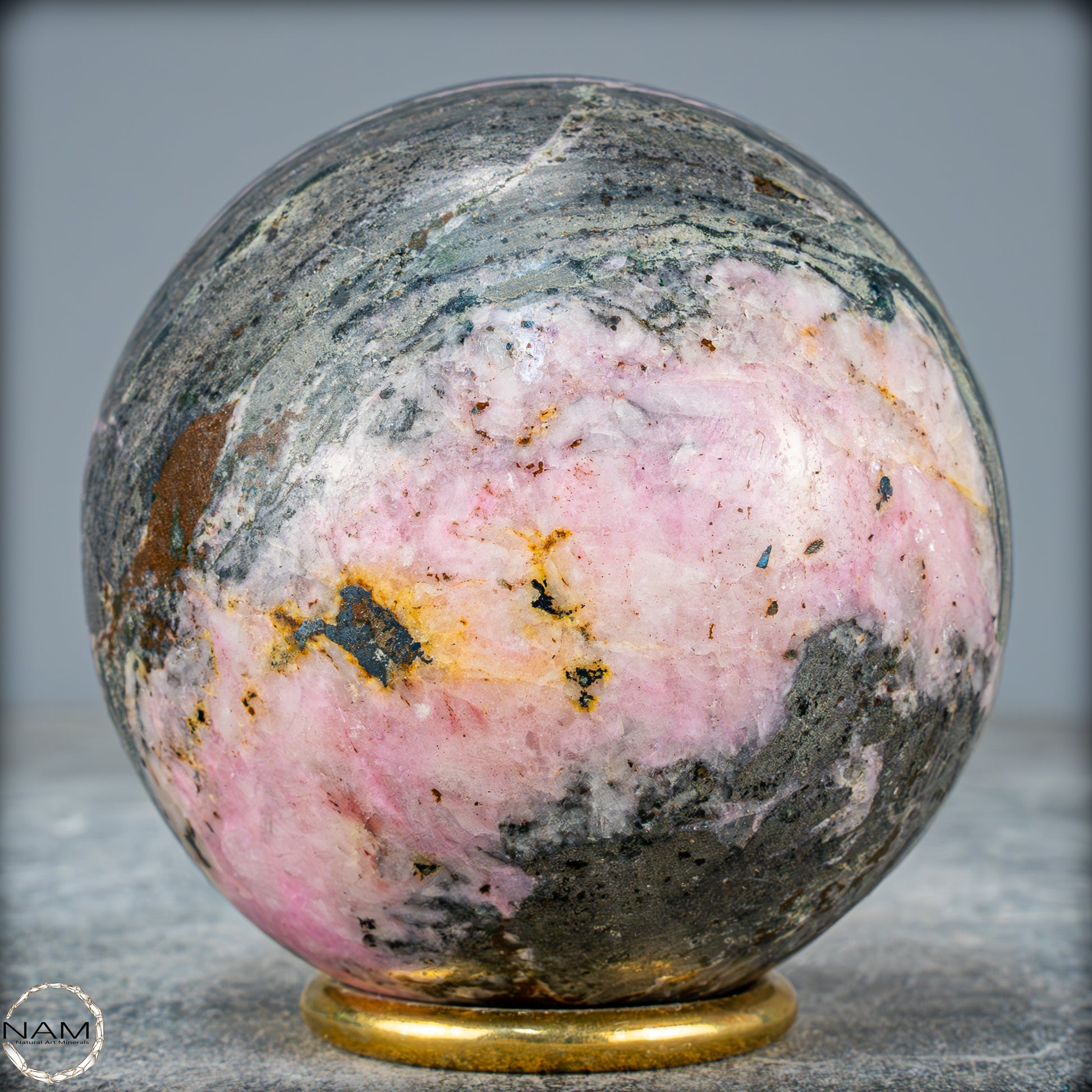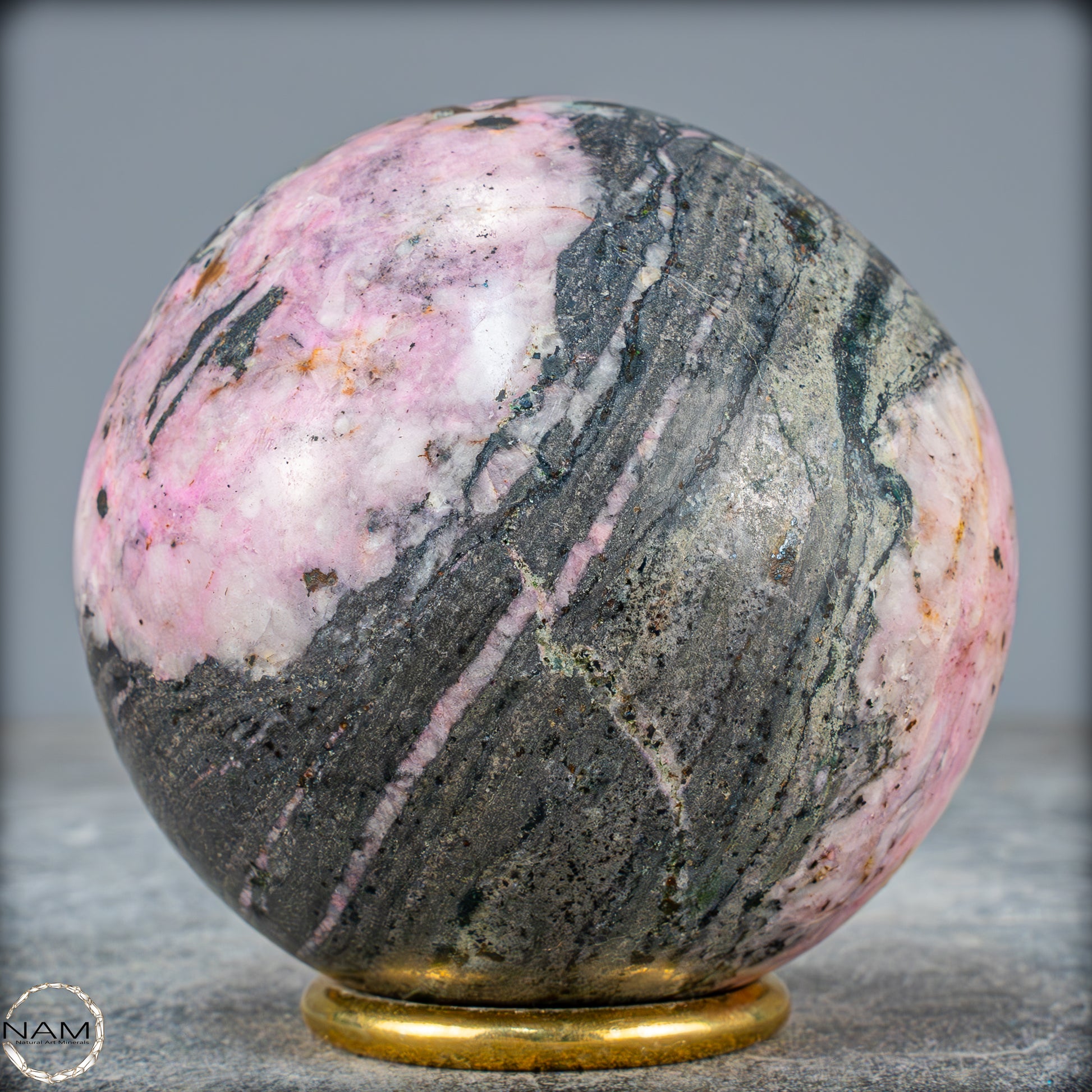 Diese eindrucksvolle Kugel besteht aus Cobaltkalzit – einem seltenen, rosa gefärbten Kalzit, dessen Färbung auf das Vorhandensein von Kobalt zurückzuführen ist. Die Oberfläche zeigt ein lebendiges Zusammenspiel aus zarten Rosatönen und dunkelgrauer Matrix, durchzogen von feinen Adern und Schichten, die der Kugel Tiefe und Struktur verleihen.