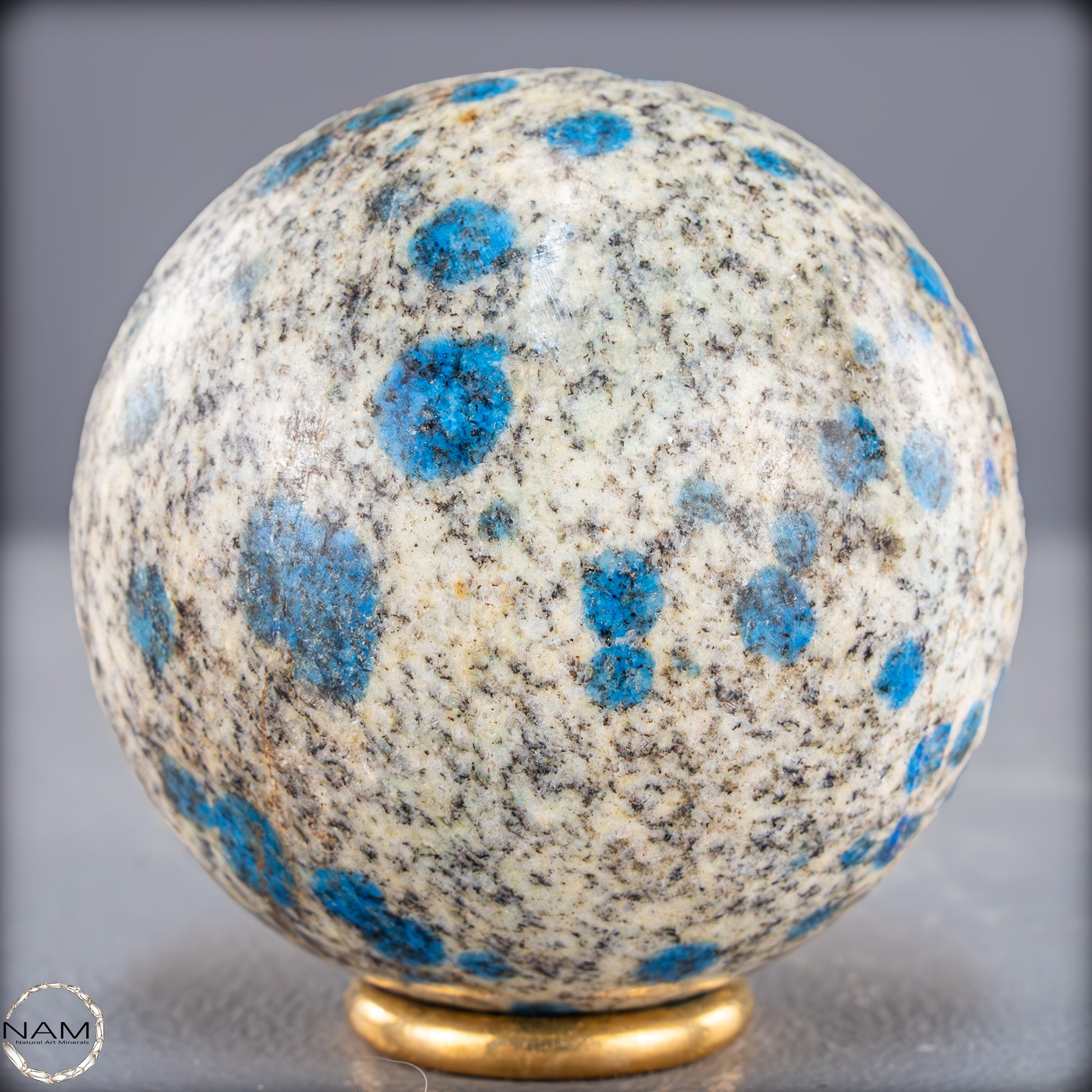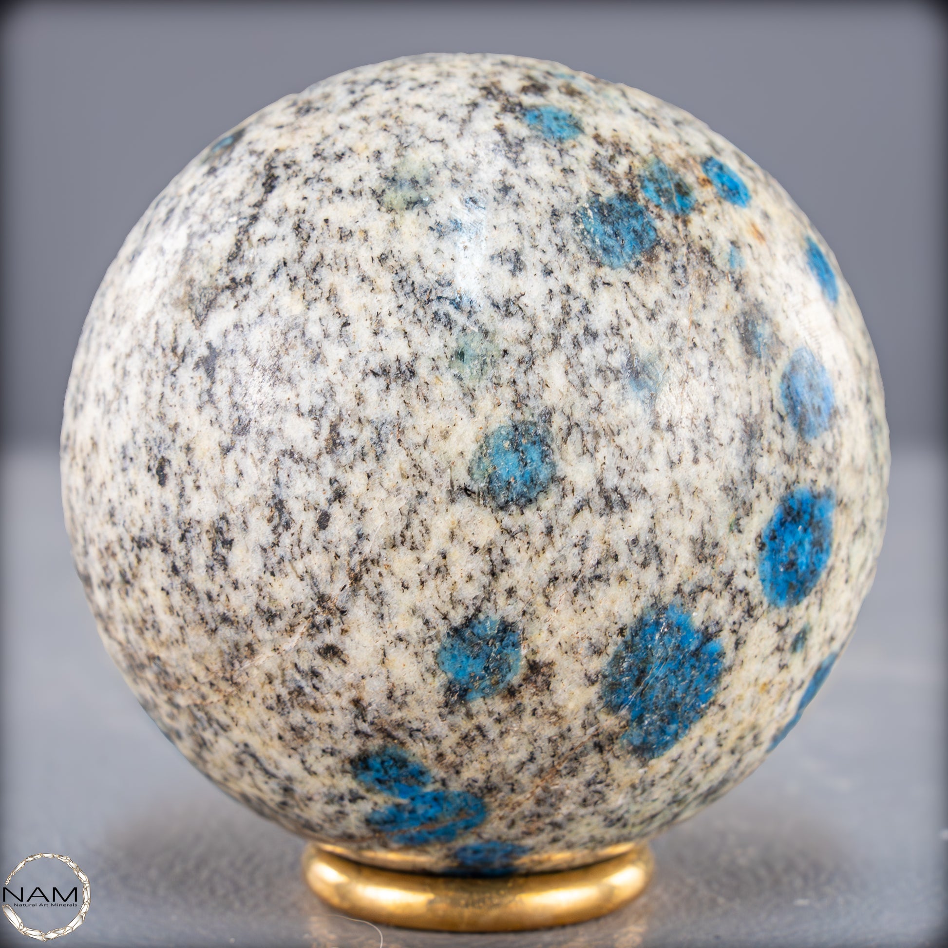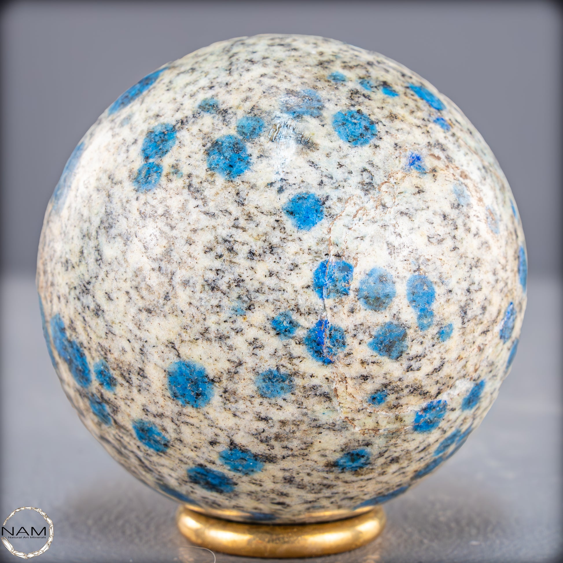 Eine einzigartige K2-Kugel aus dem Himalaya, die durch ihre auffälligen blauen Flecken auf einer hellgrauen bis weißen Grundfarbe sofort ins Auge fällt. Dieses außergewöhnliche Mineral besteht aus weißem Granit mit Einsprengseln von leuchtend blauem Azurit, was ein faszinierendes Kontrastspiel erzeugt. Die polierte Oberfläche der Kugel betont die besondere Textur und Farbgebung des Steins.