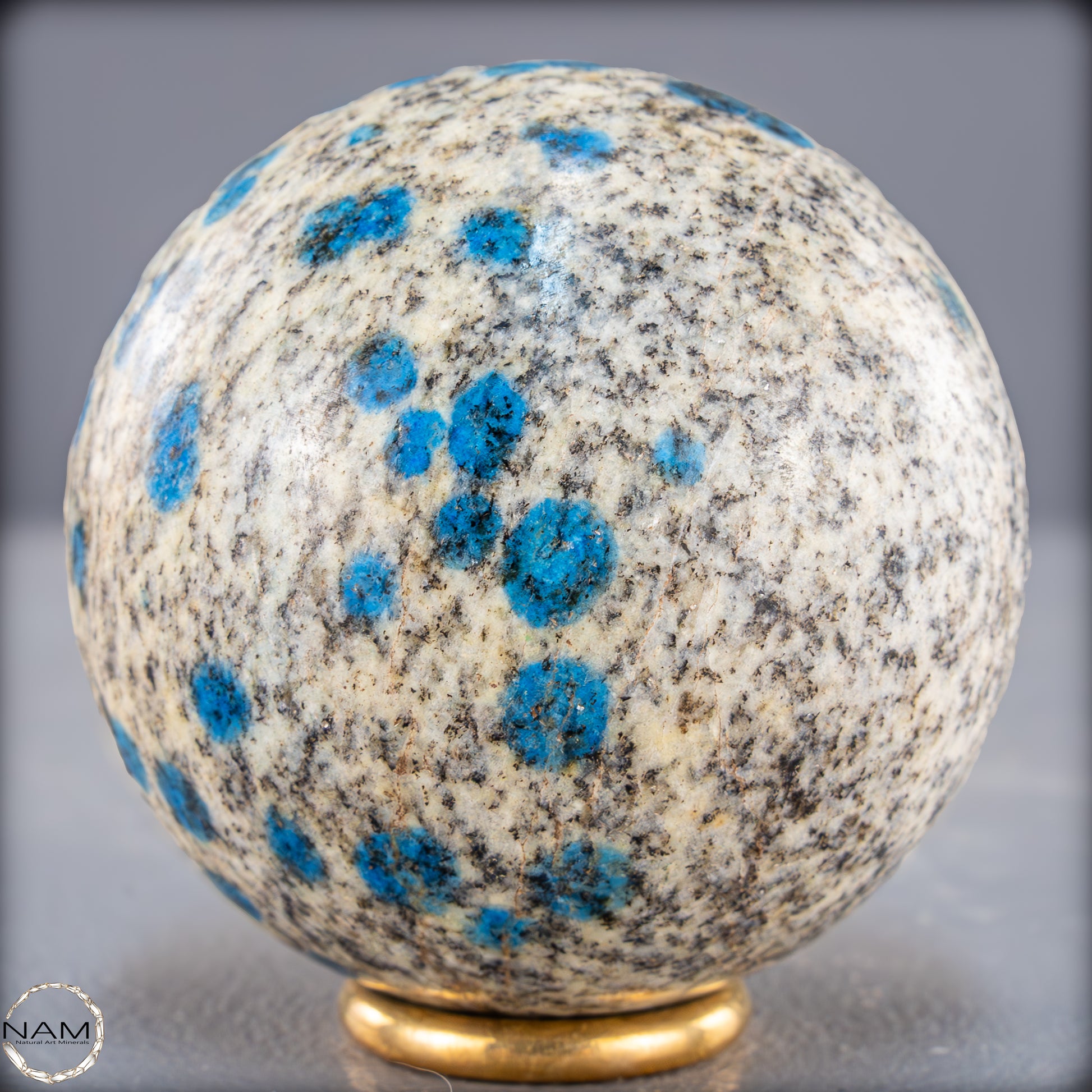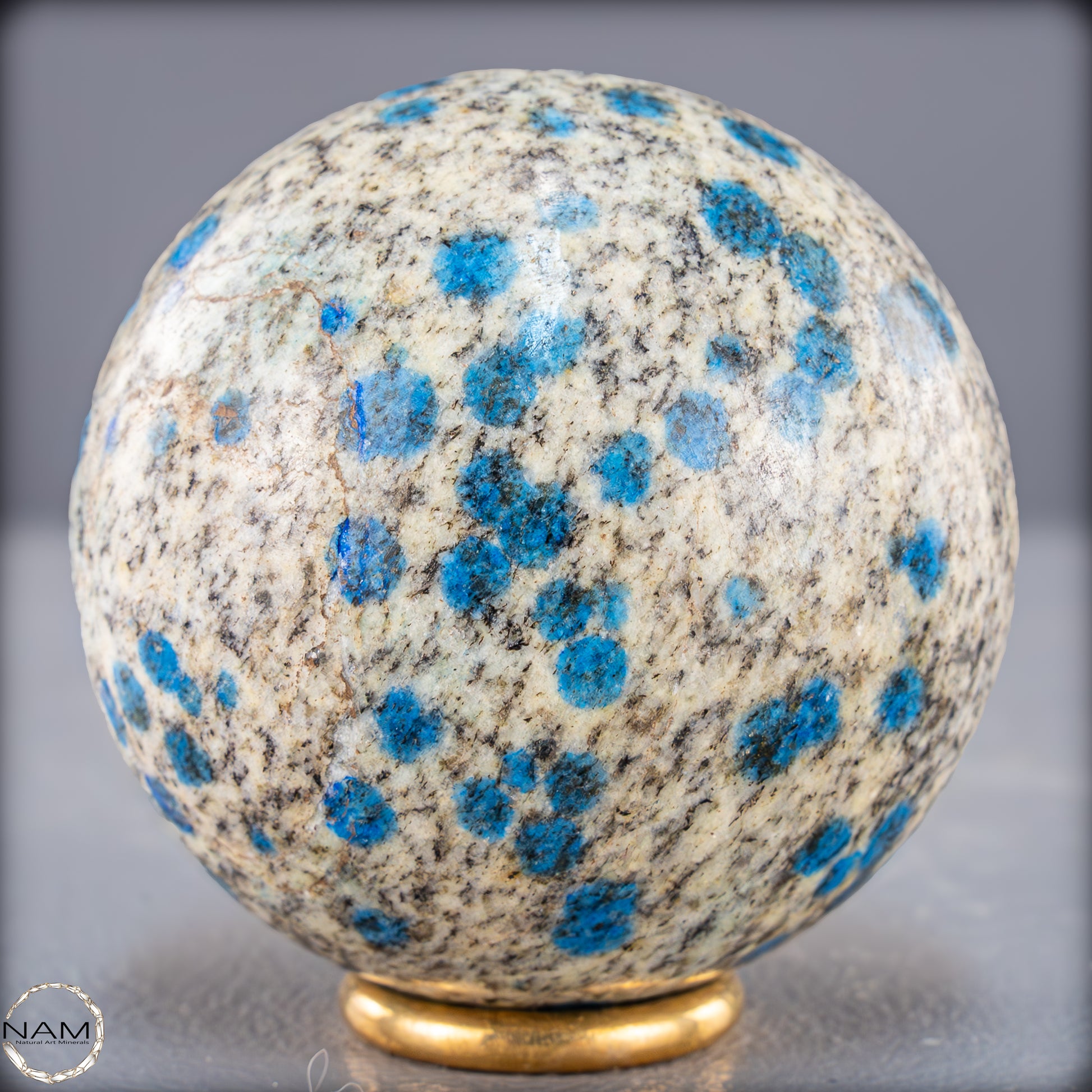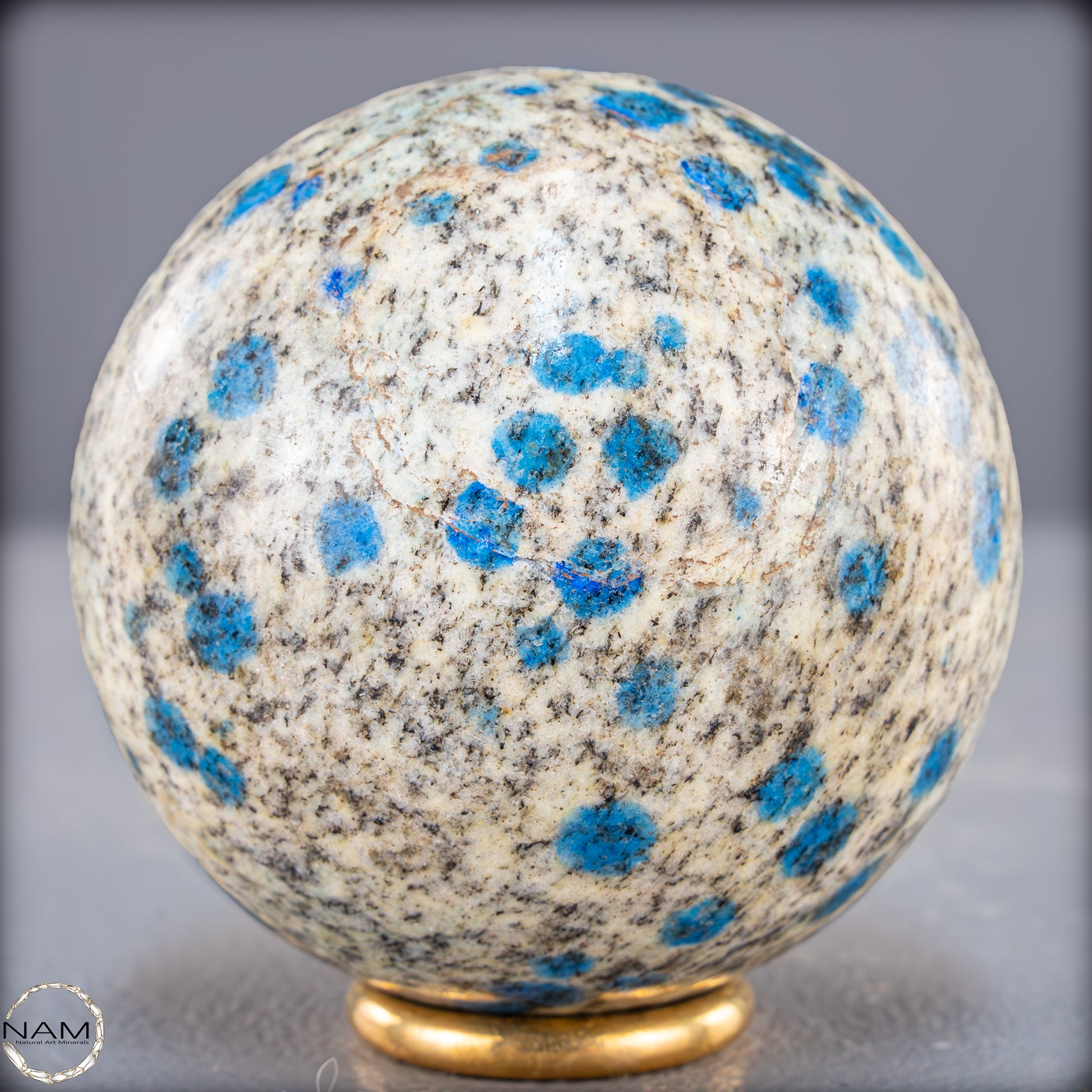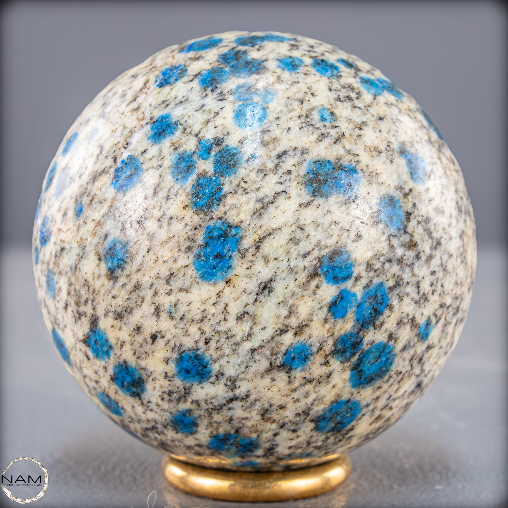 Eine einzigartige K2-Kugel aus dem Himalaya, die durch ihre auffälligen blauen Flecken auf einer hellgrauen bis weißen Grundfarbe sofort ins Auge fällt. Dieses außergewöhnliche Mineral besteht aus weißem Granit mit Einsprengseln von leuchtend blauem Azurit, was ein faszinierendes Kontrastspiel erzeugt. Die polierte Oberfläche der Kugel betont die besondere Textur und Farbgebung des Steins.