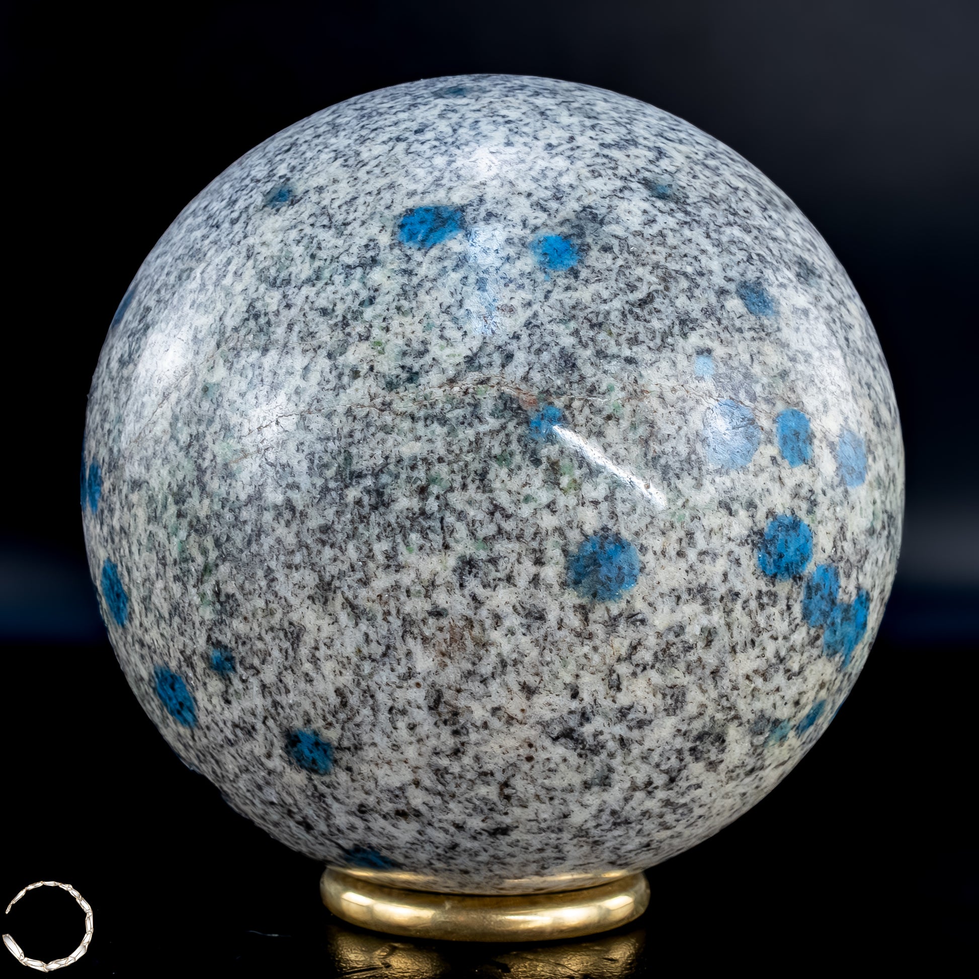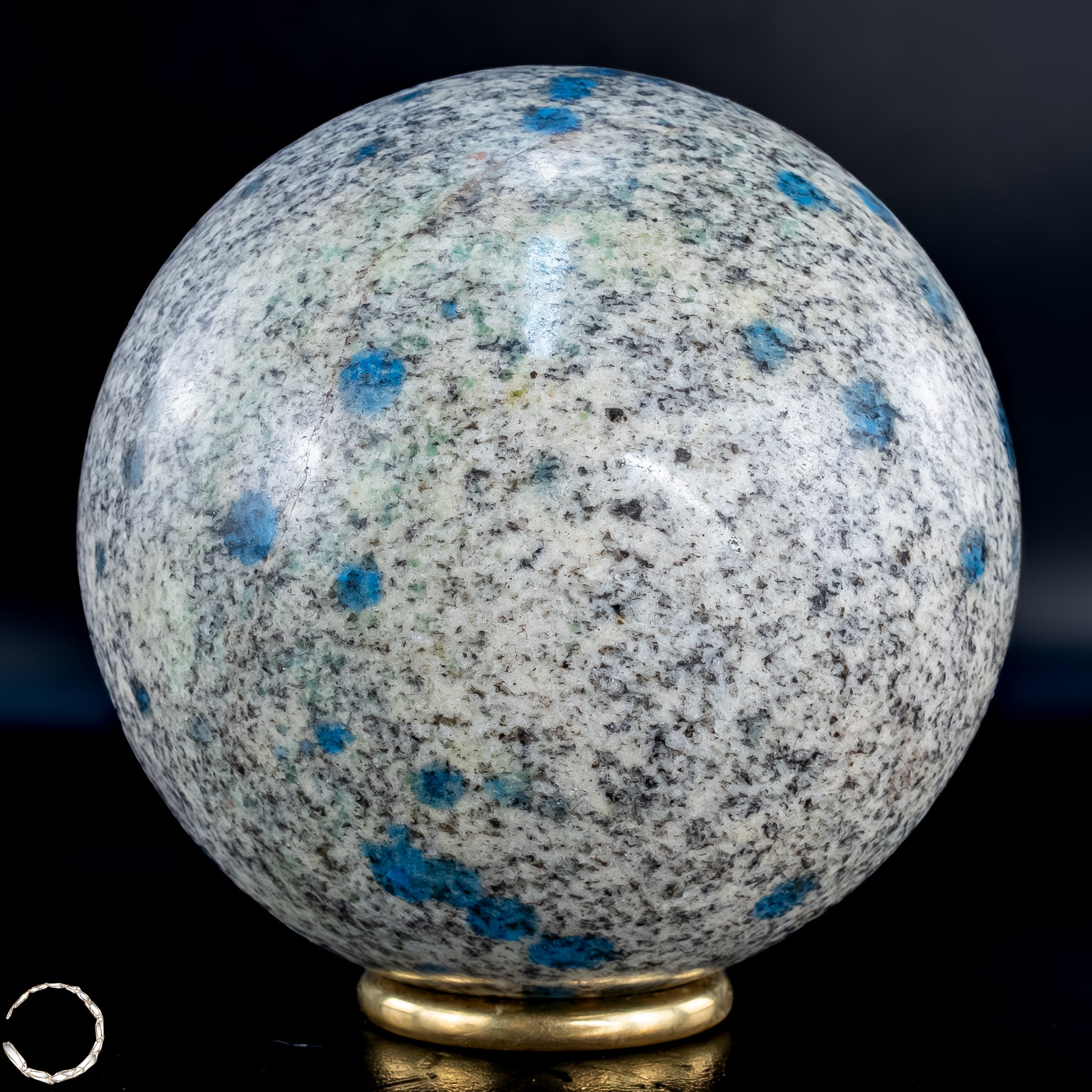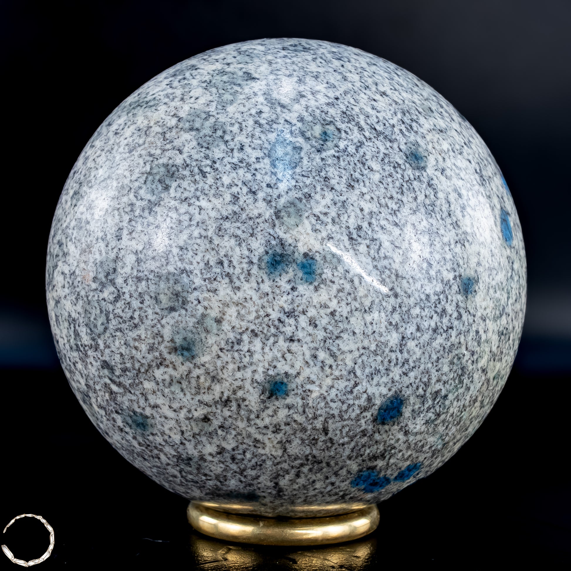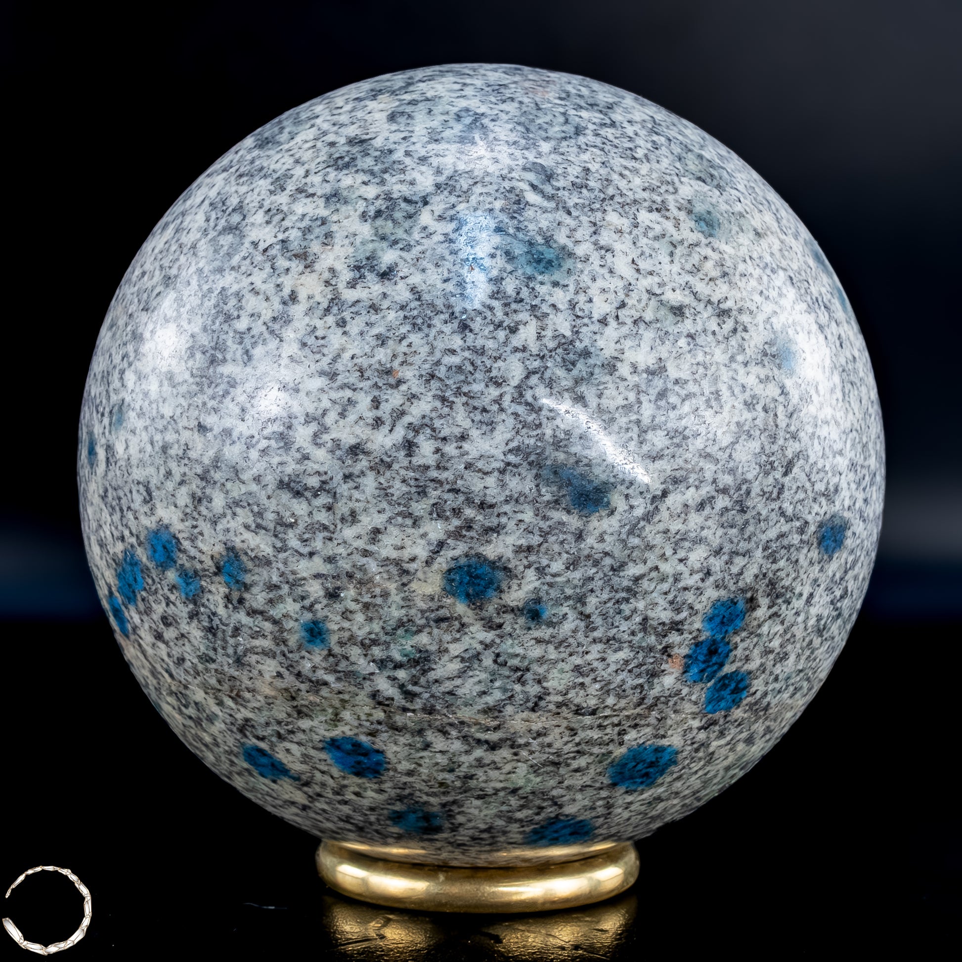 Eine einzigartige K2-Kugel aus dem Himalaya, die durch ihre auffälligen blauen Flecken auf einer hellgrauen bis weißen Grundfarbe sofort ins Auge fällt. Dieses außergewöhnliche Mineral besteht aus weißem Granit mit Einsprengseln von leuchtend blauem Azurit, was ein faszinierendes Kontrastspiel erzeugt. Die polierte Oberfläche der Kugel betont die besondere Textur und Farbgebung des Steins.