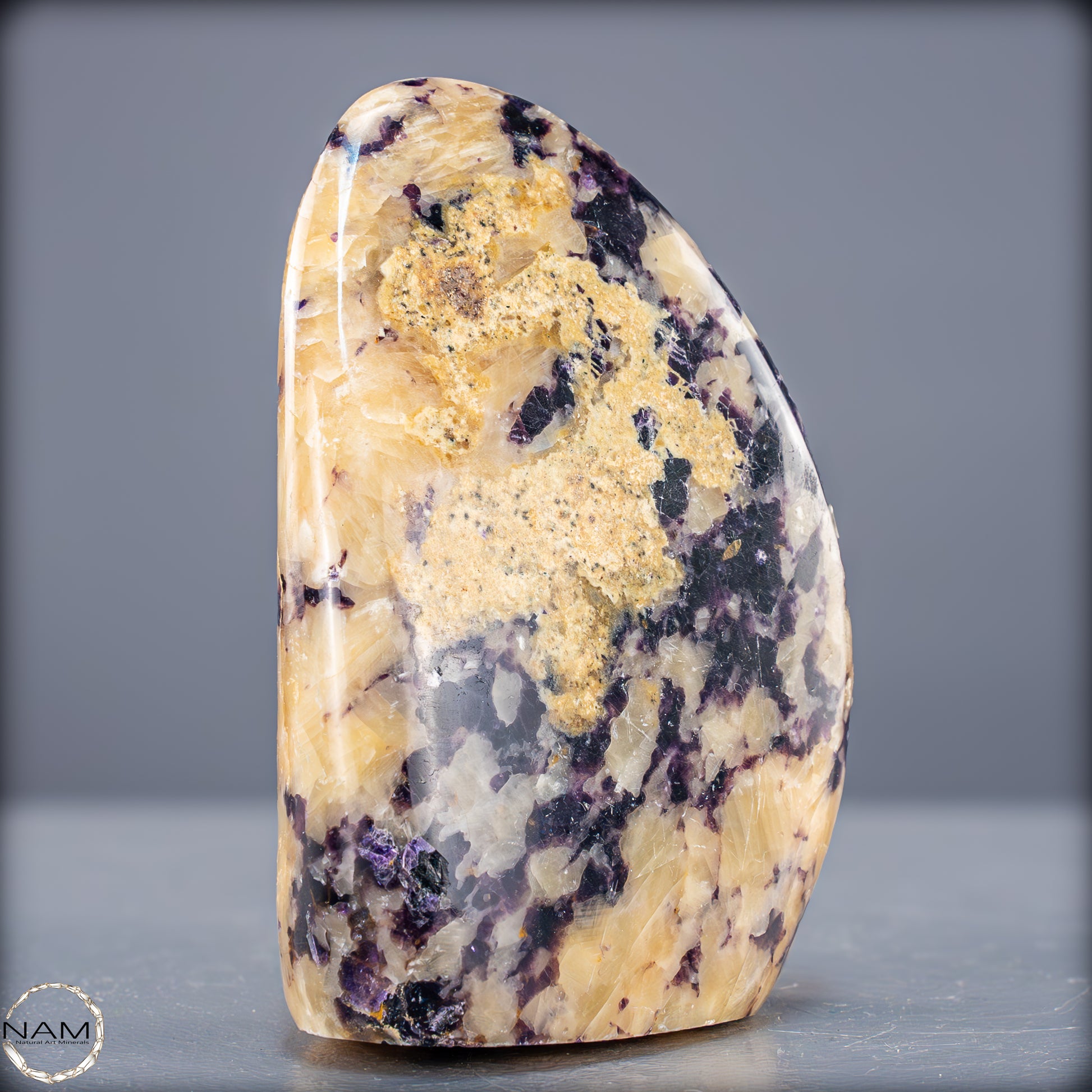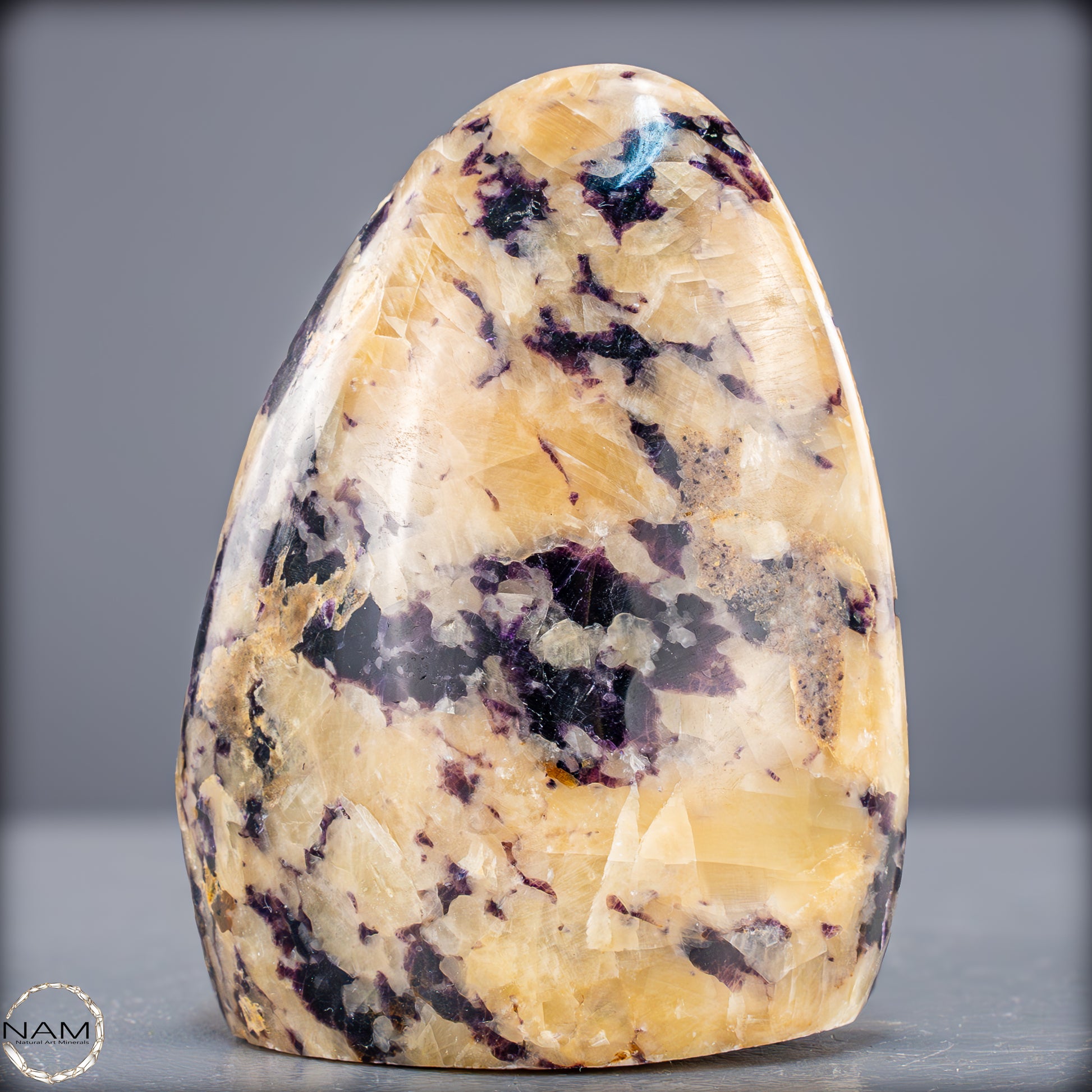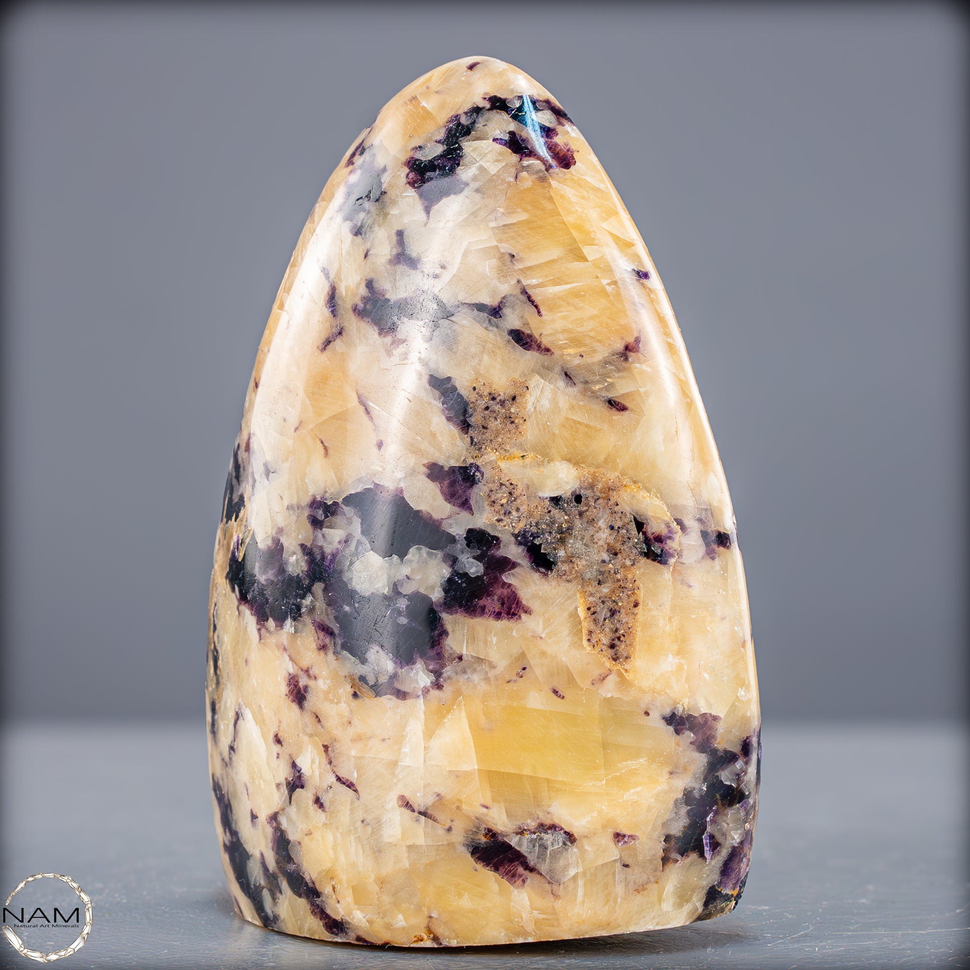 Fluorit in Calcit bildet ein faszinierendes Zusammenspiel von Farben und Strukturen. Leuchtend violette Fluorit-Einschlüsse kontrastieren mit den warmen, cremefarbenen bis goldgelben Tönen des Calcits und verleihen der Kugel eine dynamische, fast malerische Wirkung. Die natürlichen Kristallstrukturen lassen ein lebendiges Muster entstehen, das Tiefe und Bewegung vermittelt.