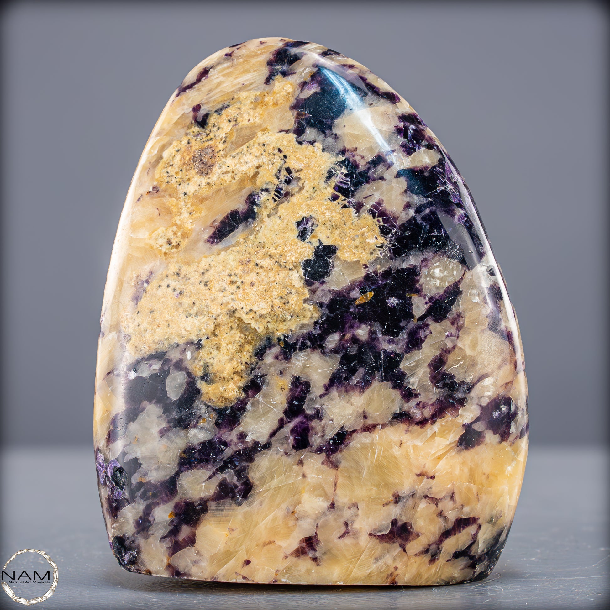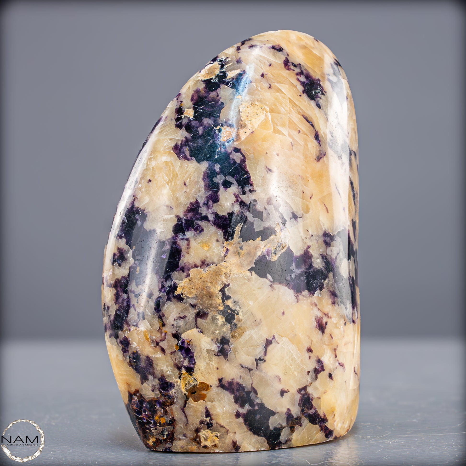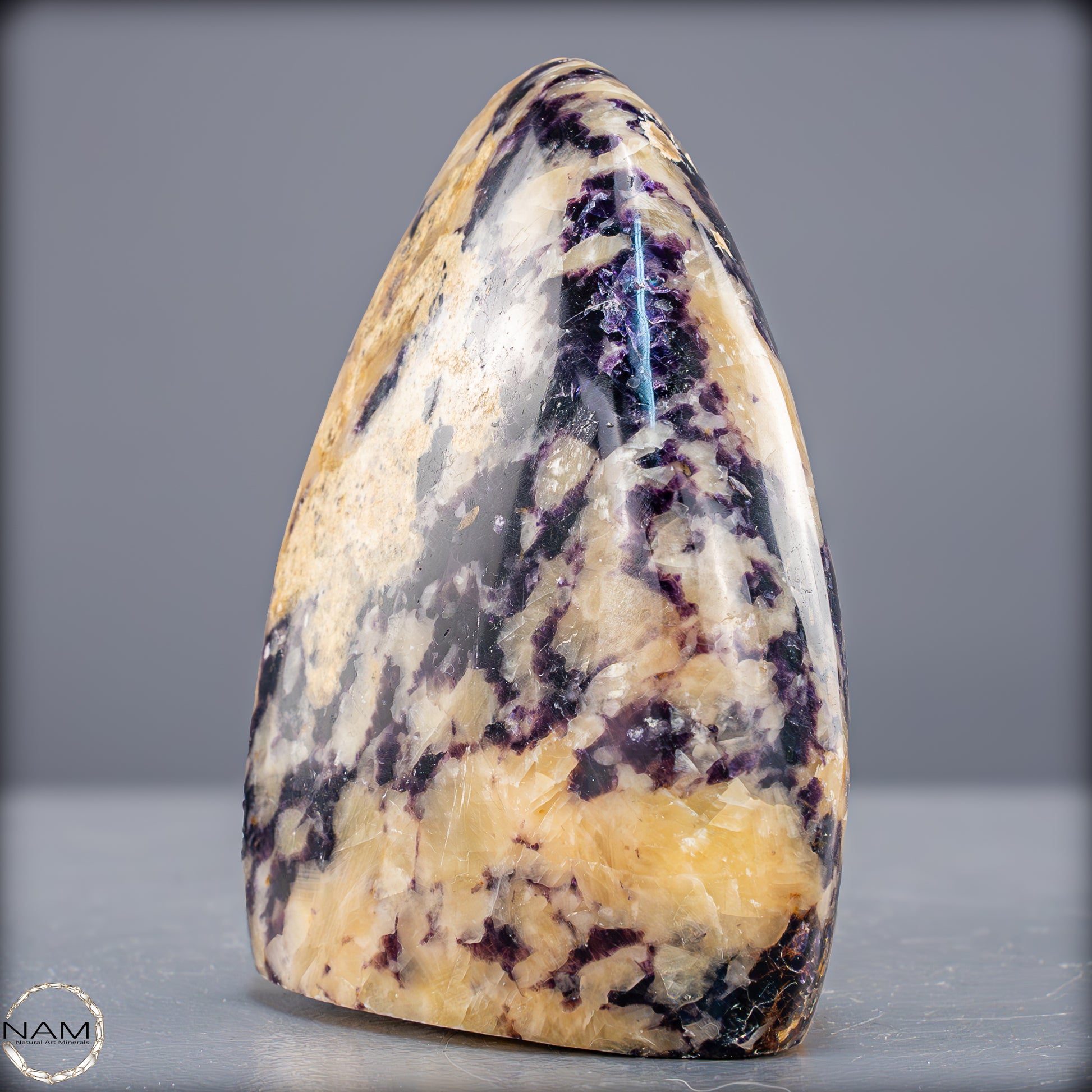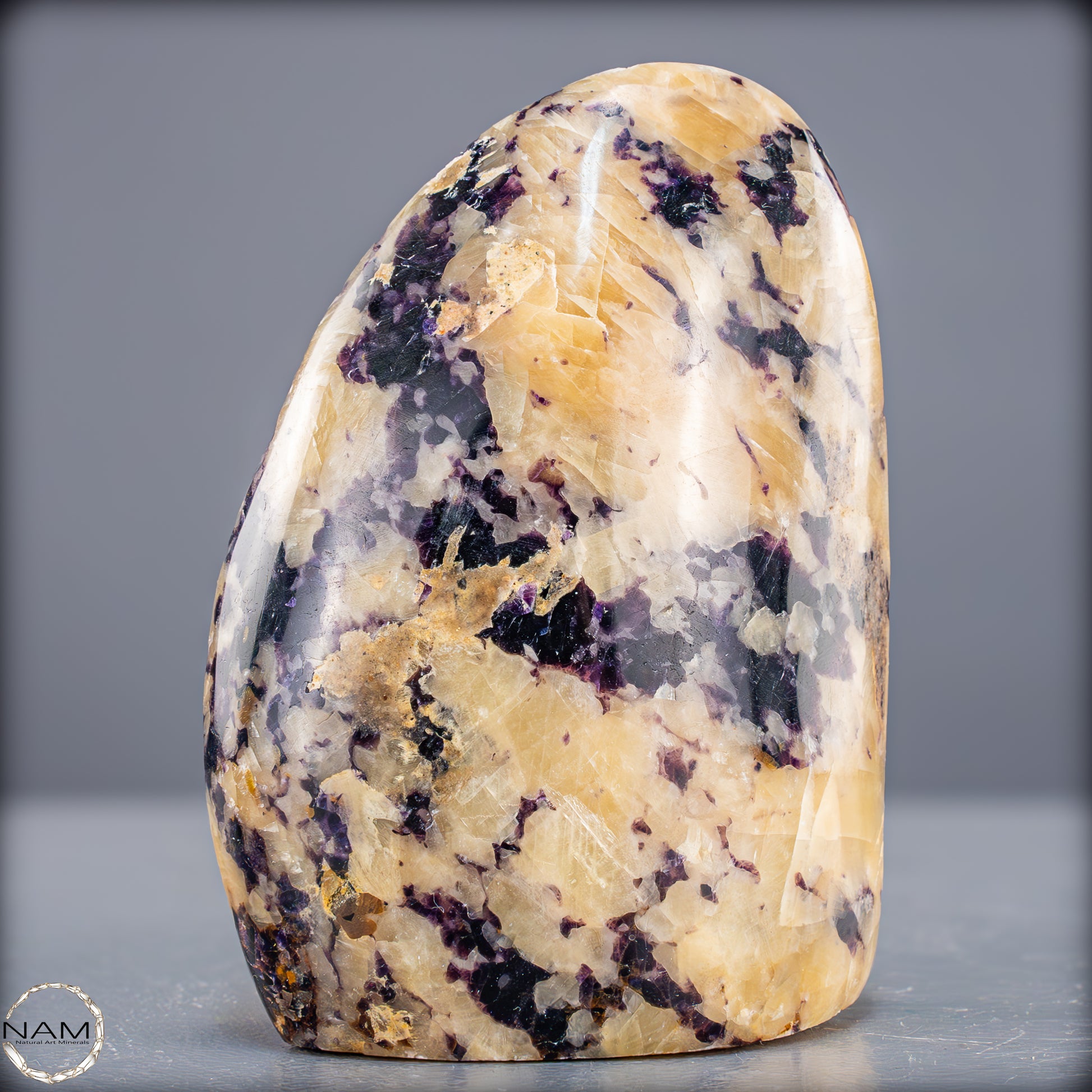 Fluorit in Calcit bildet ein faszinierendes Zusammenspiel von Farben und Strukturen. Leuchtend violette Fluorit-Einschlüsse kontrastieren mit den warmen, cremefarbenen bis goldgelben Tönen des Calcits und verleihen der Kugel eine dynamische, fast malerische Wirkung. Die natürlichen Kristallstrukturen lassen ein lebendiges Muster entstehen, das Tiefe und Bewegung vermittelt.