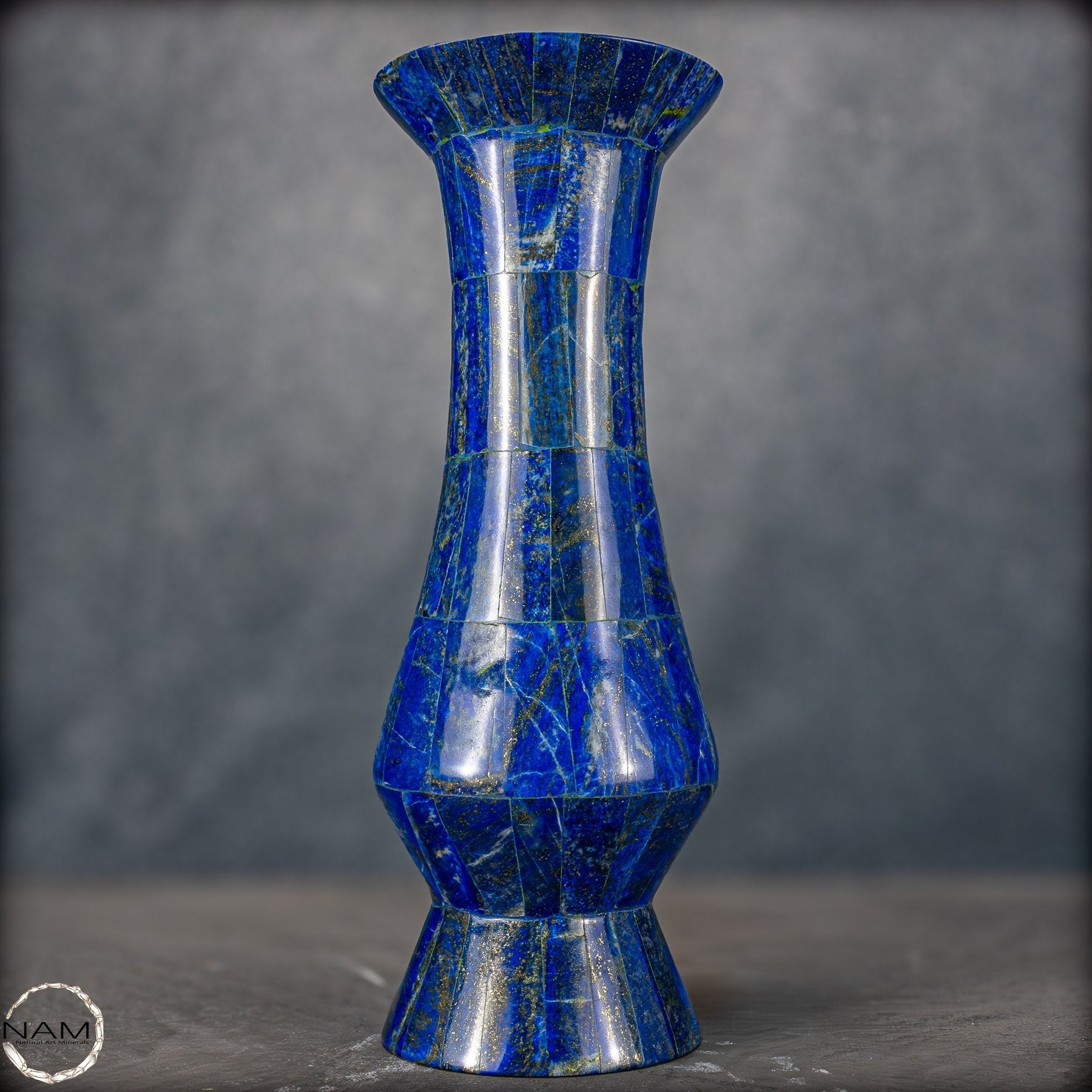 Diese wunderschöne Lapis-Lazuli Vase ist ein wahres Meisterwerk der Handwerkskunst. Mit ihrer einzigartigen Farbgebung, die von tiefem Blau bis zu goldenen Pyrit-Einschlüssen reicht, strahlt sie eine unverwechselbare Eleganz und Luxus aus. Der Lapis-Lazuli ist für seine atemberaubende Farbe und den goldenen Schimmer bekannt, der durch die Pyrit-Mineralien entsteht. Diese Vase wurde aus hochwertigen Lapis-Lazuli-Stücken gefertigt, die perfekt miteinander kombiniert und meisterhaft poliert wurden.