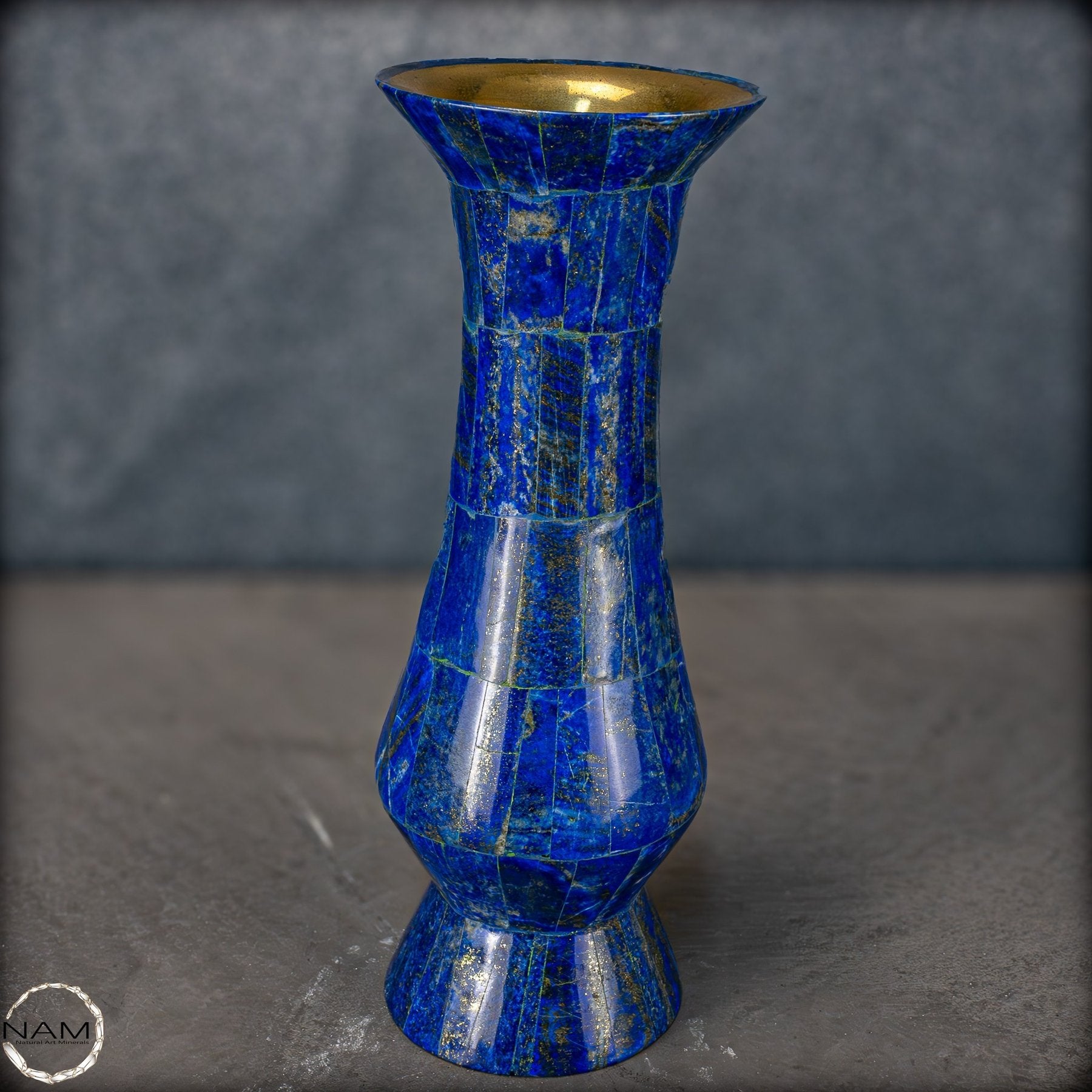 Die Form der Vase ist zugleich klassisch und modern. Ihre geschwungene Silhouette und die symmetrische Anordnung der Lapis-Lazuli-Stücke verleihen ihr eine harmonische und edle Ausstrahlung. Besonders bemerkenswert ist der goldene Innenrand der Vase, der dem gesamten Stück einen zusätzlichen Hauch von Luxus verleiht.