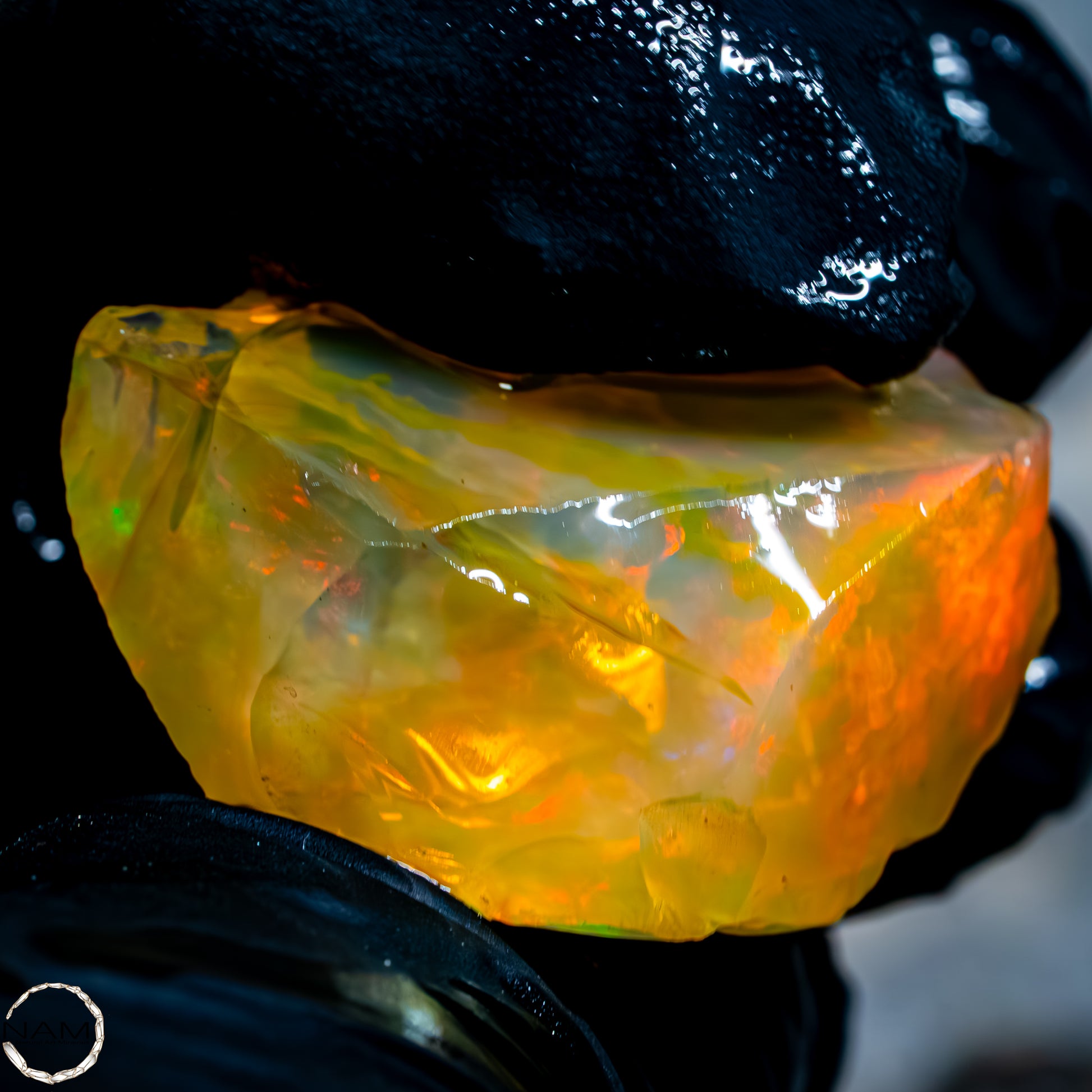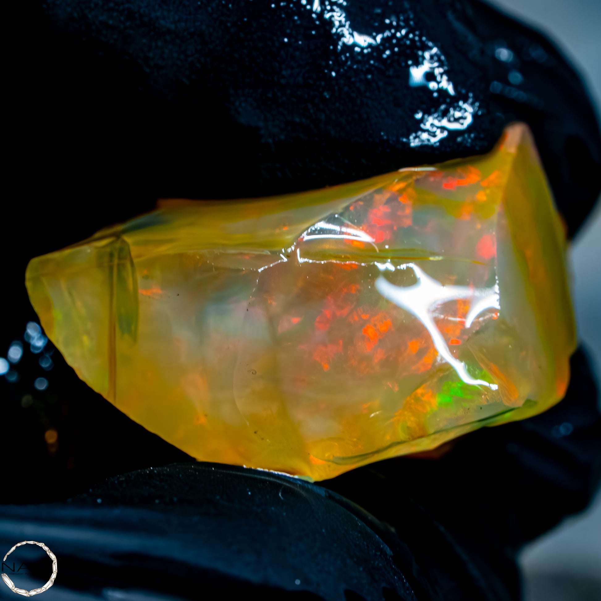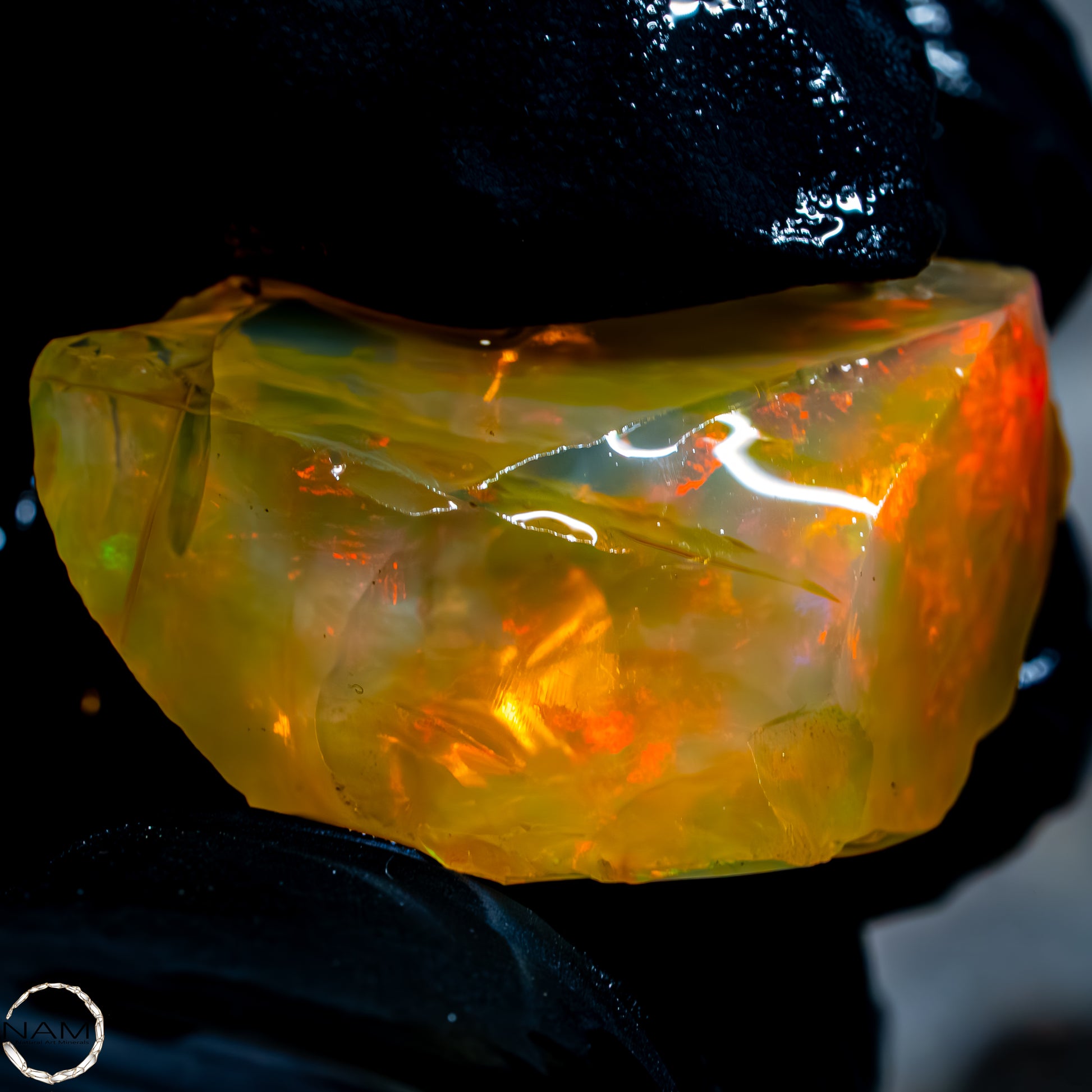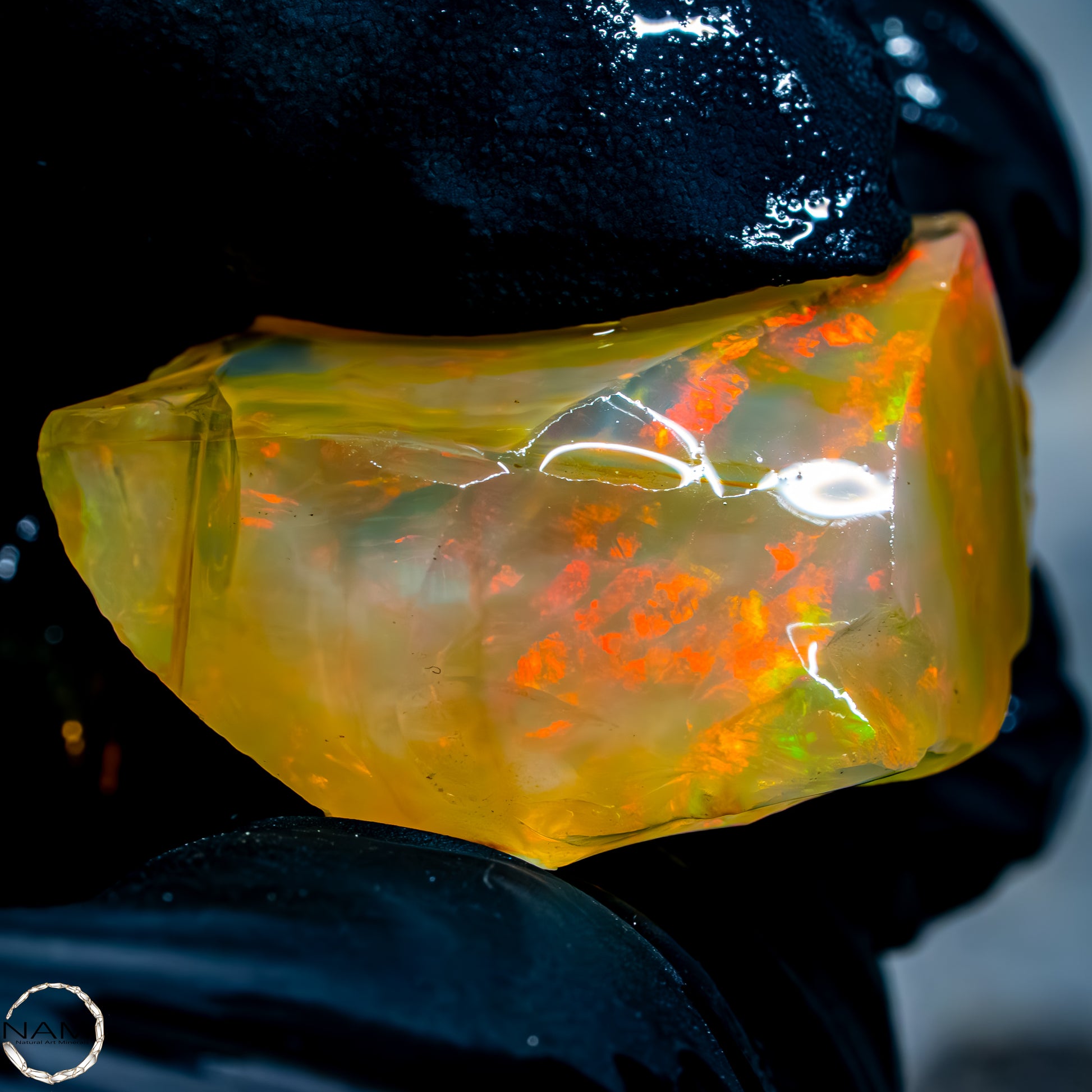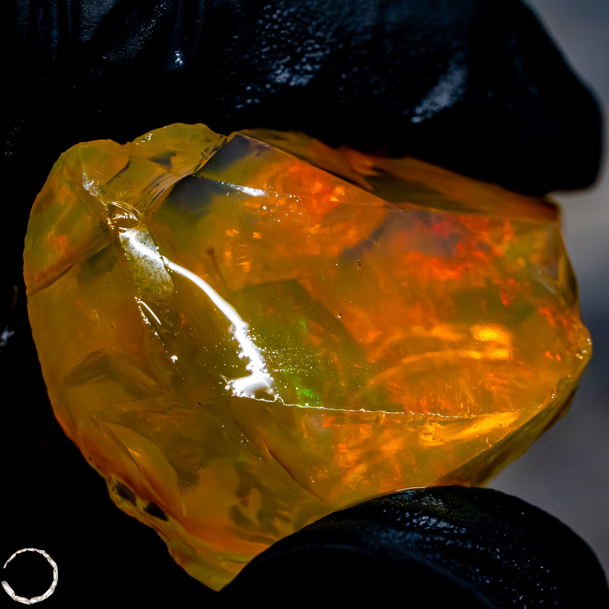 Dieser spektakuläre Kristall-Opal-Rohstein zeigt ein beeindruckendes Farbspiel in intensiven Gelb-, Orange-, Grün- und Rottönen. Das transparente bis transluzente Material wirkt wie flüssiges Feuer und offenbart eine faszinierende Tiefe. Die schillernden Farben scheinen aus dem Inneren heraus zu leuchten und wechseln je nach Lichteinfall auf magische Weise. Die natürlichen Bruchkanten und die erhaltene Mutterstein-Partie am oberen Rand verleihen dem Stück seinen authentischen, makellosen Charakter. Ein faszinierendes Sammlerstück für Liebhaber außergewöhnlicher Edelsteine.