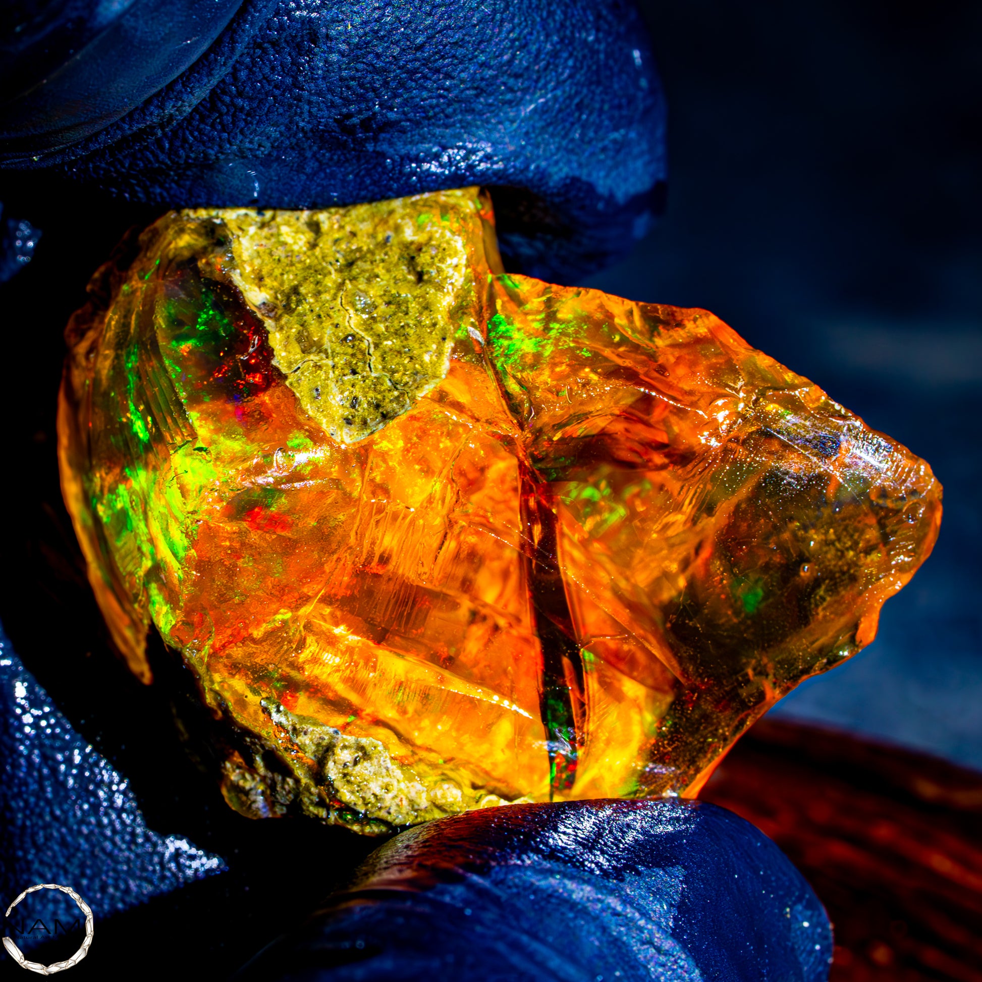 Dieser spektakuläre Kristall-Opal-Rohstein zeigt ein beeindruckendes Farbspiel in intensiven Gelb-, Orange-, Grün- und Rottönen. Das transparente bis transluzente Material wirkt wie flüssiges Feuer und offenbart eine faszinierende Tiefe. Die schillernden Farben scheinen aus dem Inneren heraus zu leuchten und wechseln je nach Lichteinfall auf magische Weise. Die natürlichen Bruchkanten und die erhaltene Mutterstein-Partie am oberen Rand verleihen dem Stück seinen authentischen, makellosen Charakter. Ein faszinierendes Sammlerstück für Liebhaber außergewöhnlicher Edelsteine.
