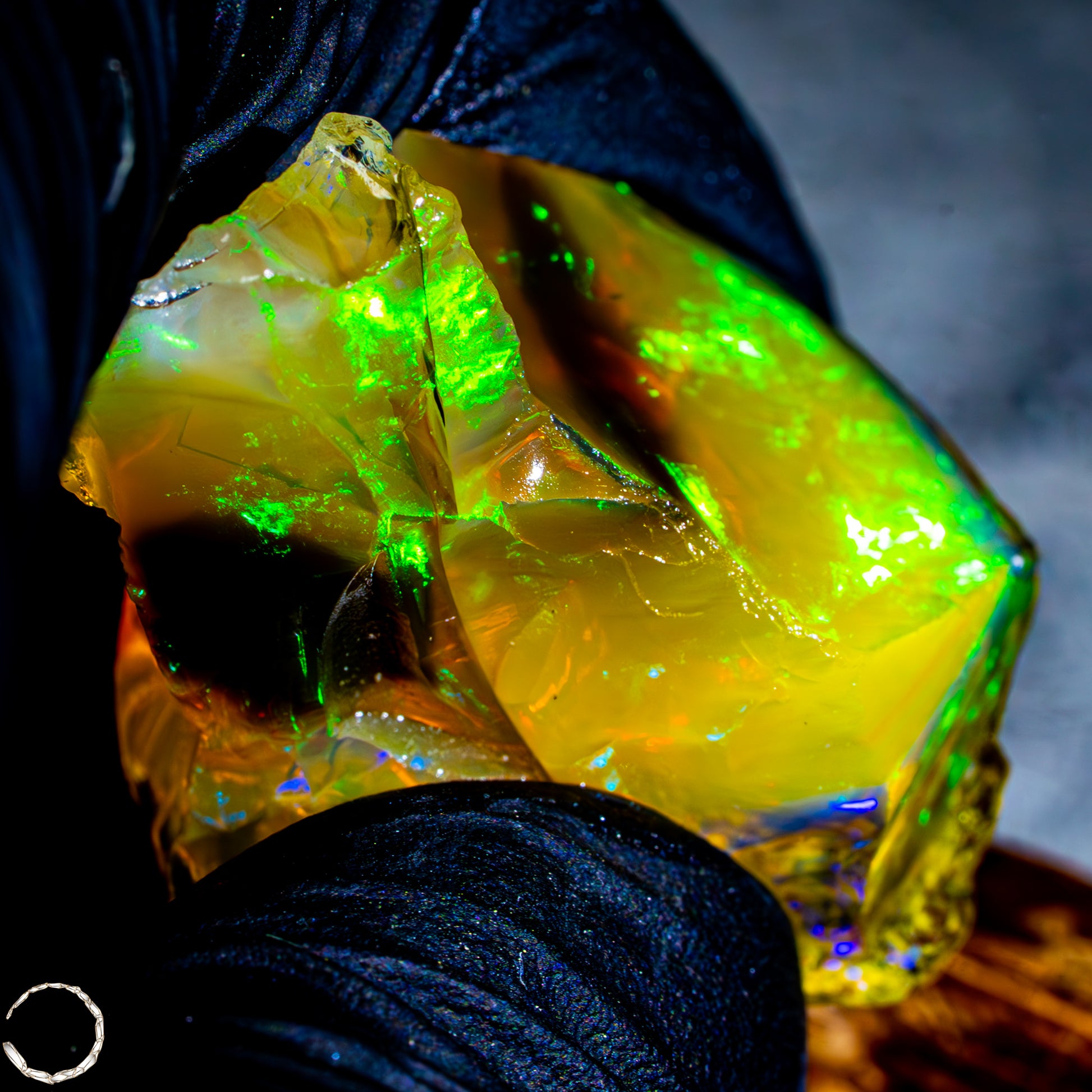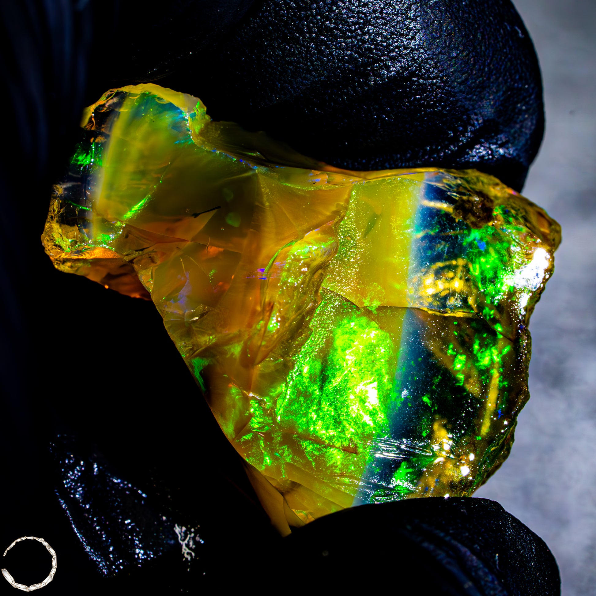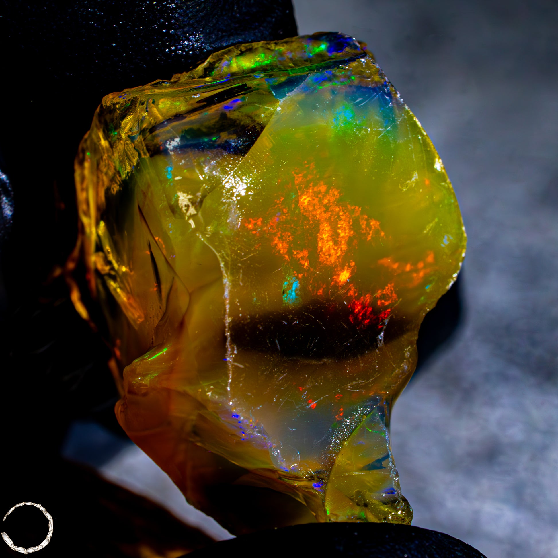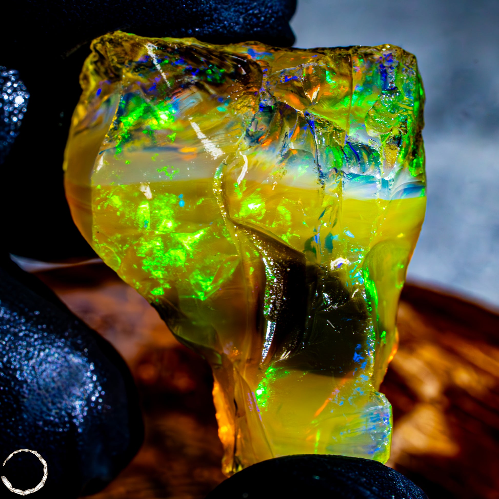 Dieser spektakuläre Kristall-Opal-Rohstein zeigt ein beeindruckendes Farbspiel in intensiven Gelb-, Orange-, Grün- und Rottönen. Das transparente bis transluzente Material wirkt wie flüssiges Feuer und offenbart eine faszinierende Tiefe. Die schillernden Farben scheinen aus dem Inneren heraus zu leuchten und wechseln je nach Lichteinfall auf magische Weise. Die natürlichen Bruchkanten und die erhaltene Mutterstein-Partie am oberen Rand verleihen dem Stück seinen authentischen, makellosen Charakter. Ein faszinierendes Sammlerstück für Liebhaber außergewöhnlicher Edelsteine.