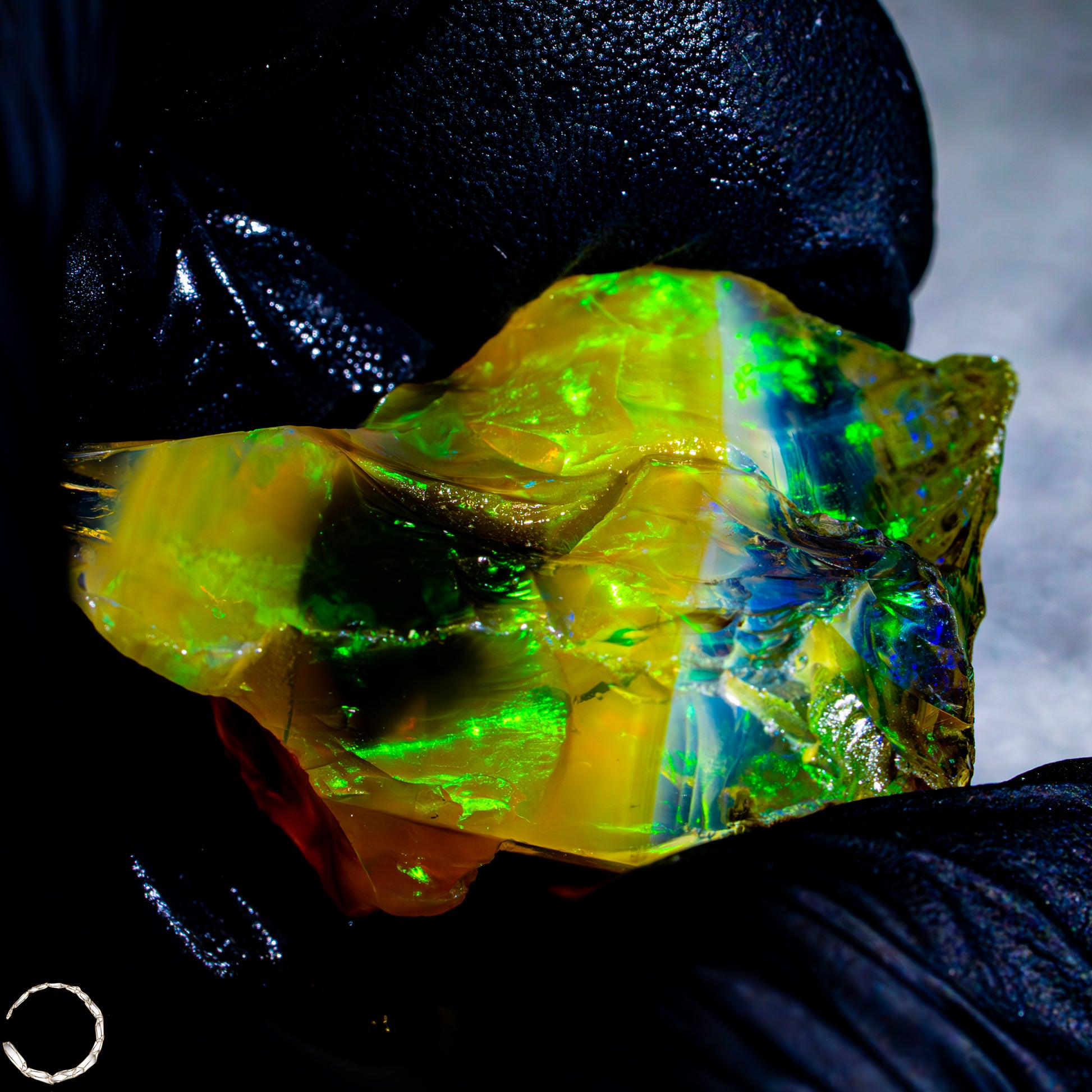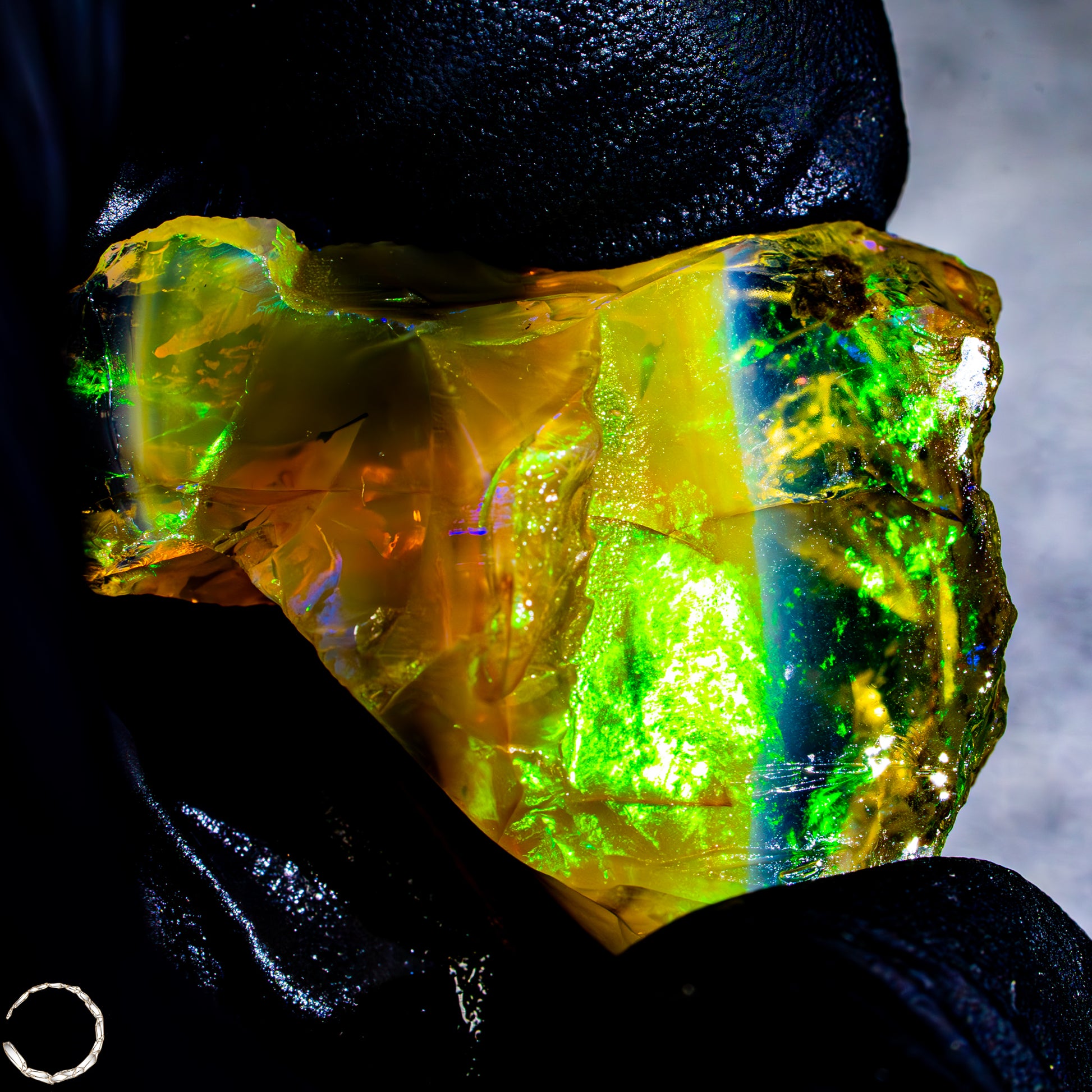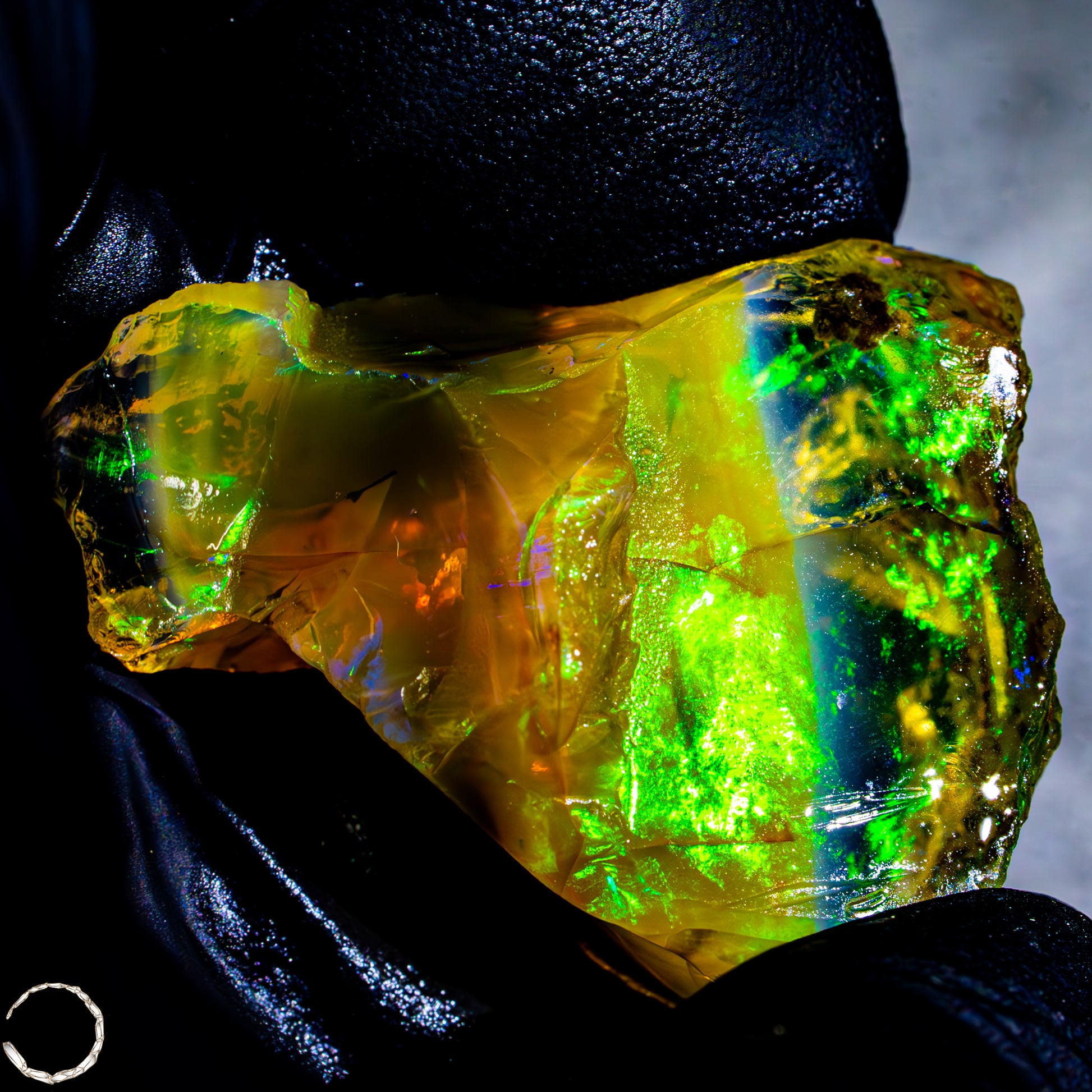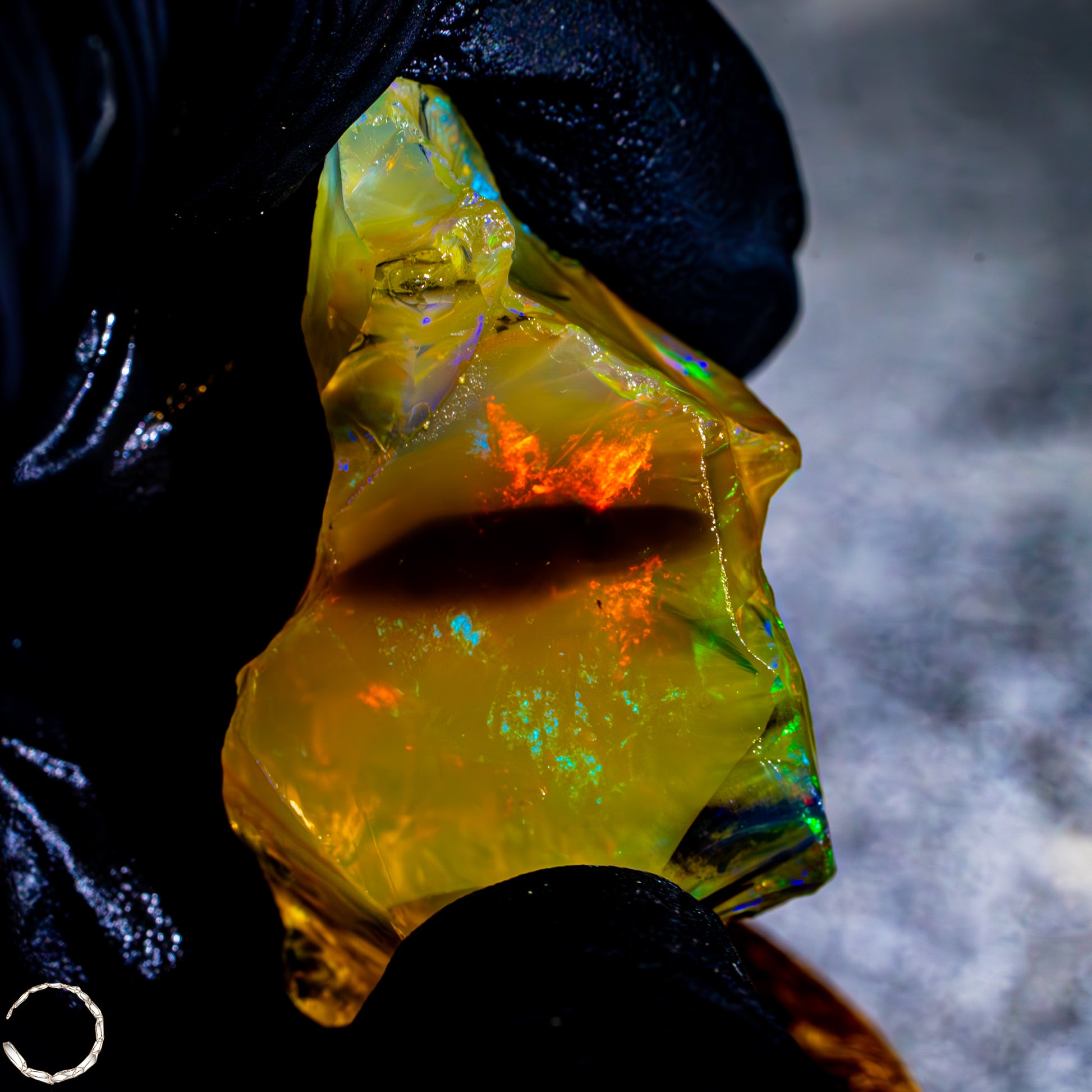 Dieser spektakuläre Kristall-Opal-Rohstein zeigt ein beeindruckendes Farbspiel in intensiven Gelb-, Orange-, Grün- und Rottönen. Das transparente bis transluzente Material wirkt wie flüssiges Feuer und offenbart eine faszinierende Tiefe. Die schillernden Farben scheinen aus dem Inneren heraus zu leuchten und wechseln je nach Lichteinfall auf magische Weise. Die natürlichen Bruchkanten und die erhaltene Mutterstein-Partie am oberen Rand verleihen dem Stück seinen authentischen, makellosen Charakter. Ein faszinierendes Sammlerstück für Liebhaber außergewöhnlicher Edelsteine.