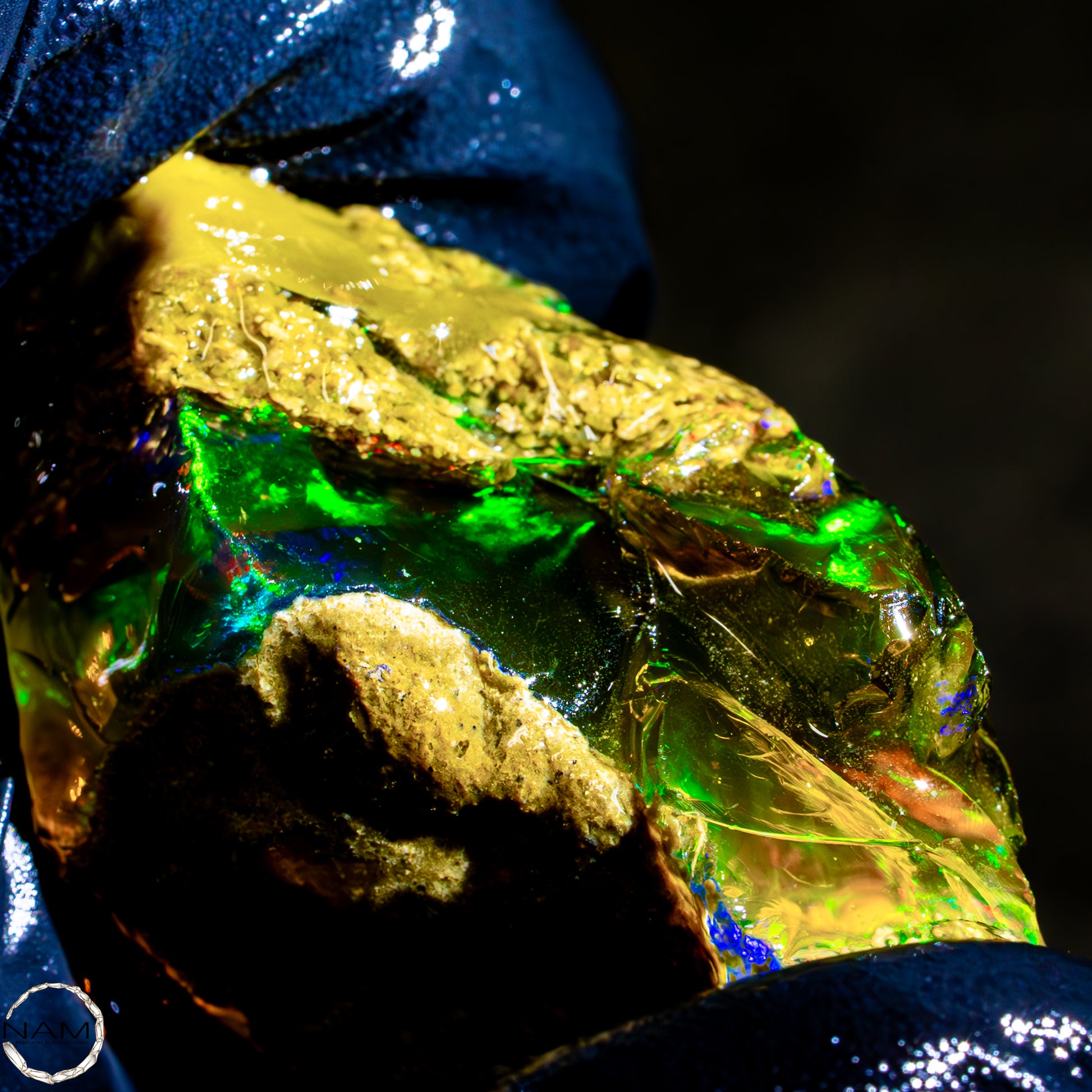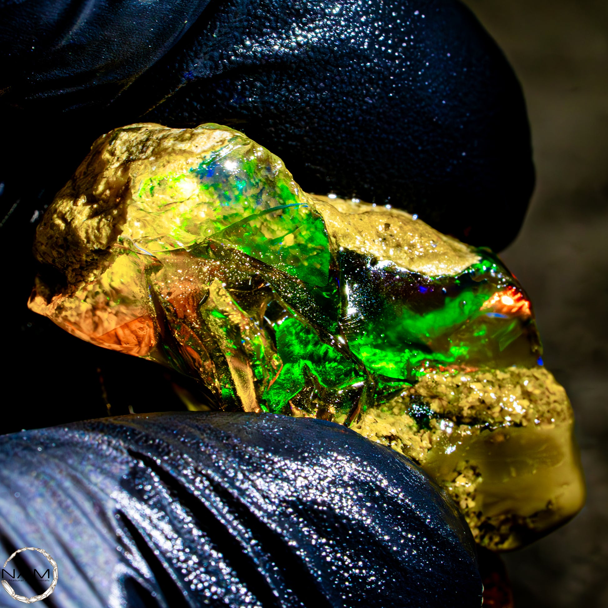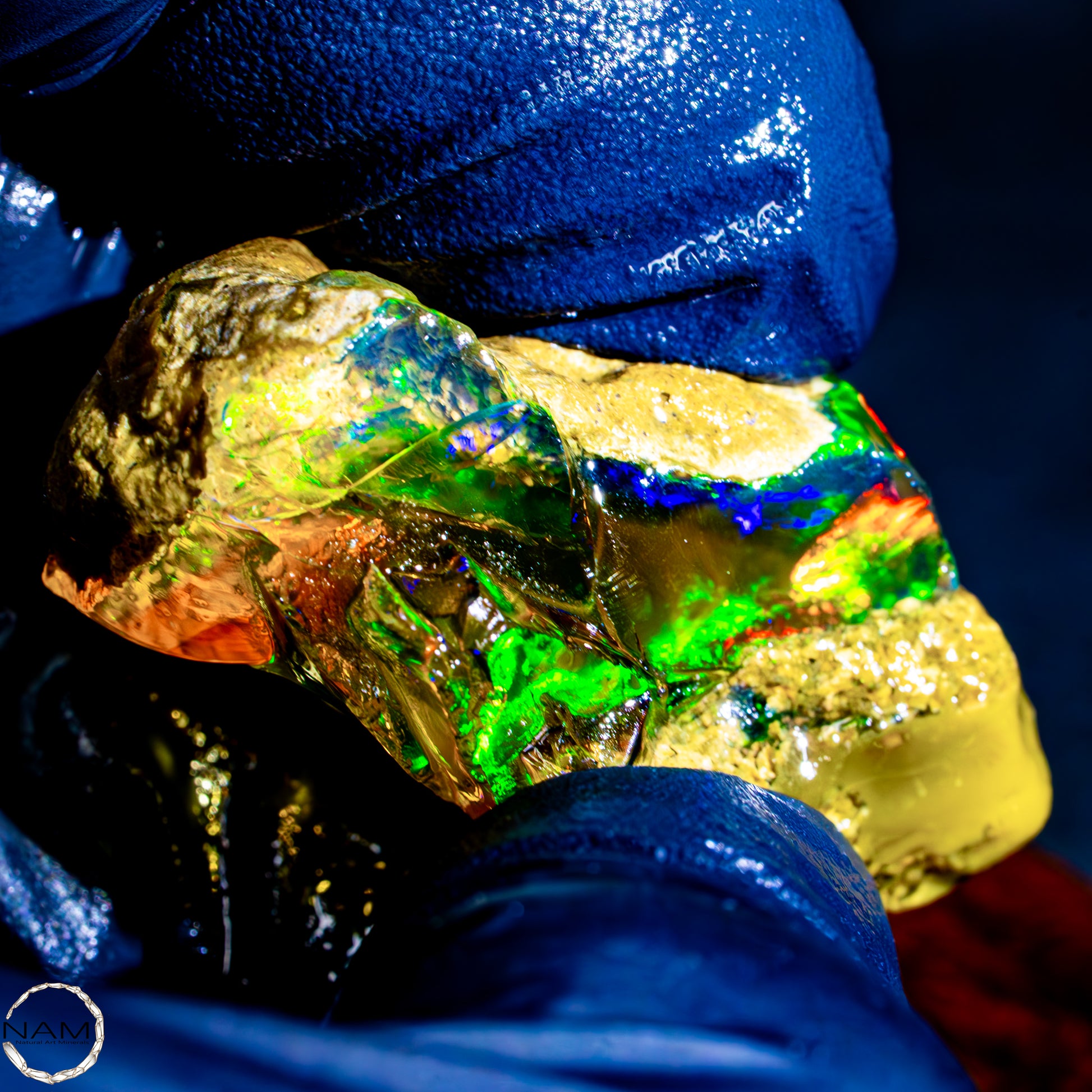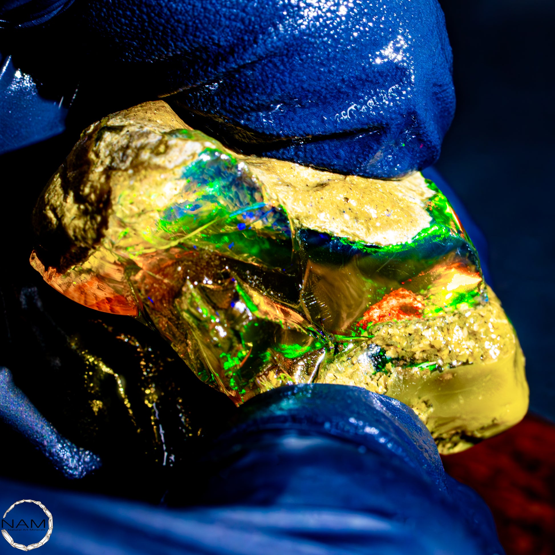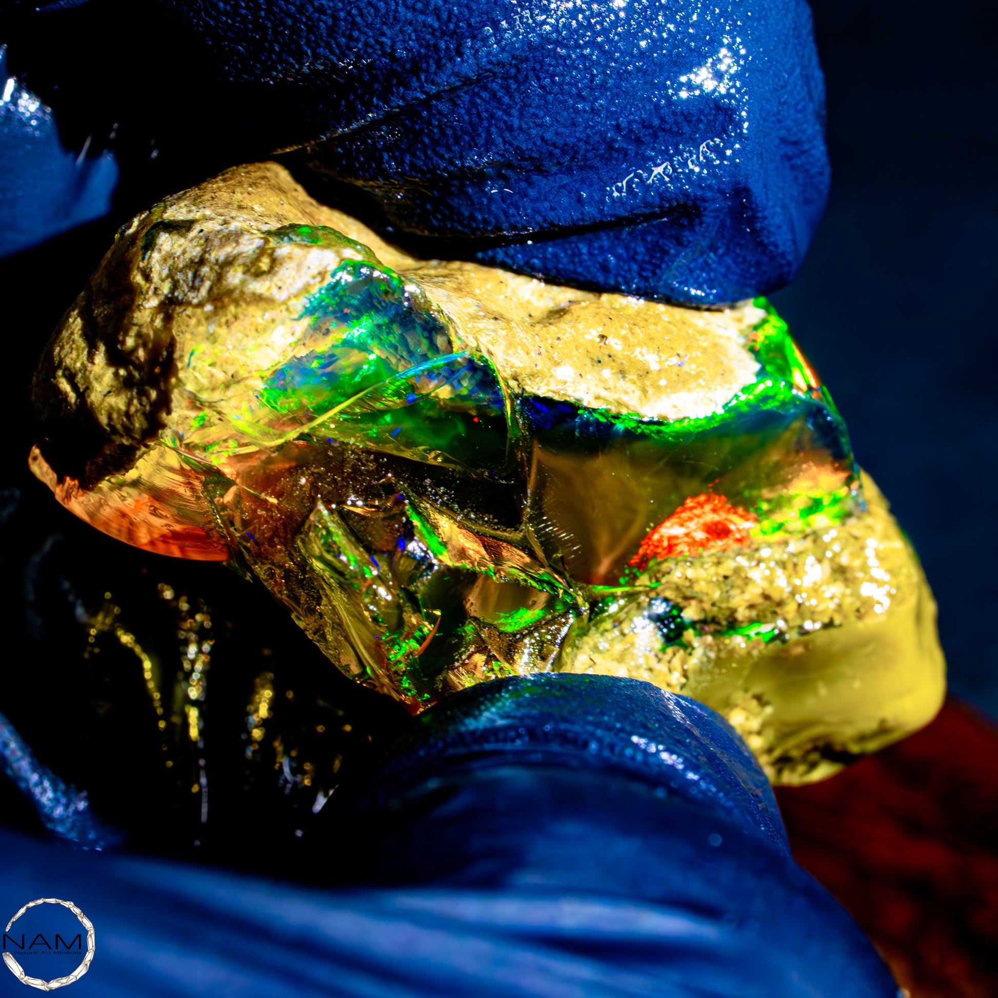 Dieser spektakuläre Kristall-Opal-Rohstein zeigt ein beeindruckendes Farbspiel in intensiven Gelb-, Orange-, Grün- und Rottönen. Das transparente bis transluzente Material wirkt wie flüssiges Feuer und offenbart eine faszinierende Tiefe. Die schillernden Farben scheinen aus dem Inneren heraus zu leuchten und wechseln je nach Lichteinfall auf magische Weise. Die natürlichen Bruchkanten und die erhaltene Mutterstein-Partie am oberen Rand verleihen dem Stück seinen authentischen, makellosen Charakter. Ein faszinierendes Sammlerstück für Liebhaber außergewöhnlicher Edelsteine.