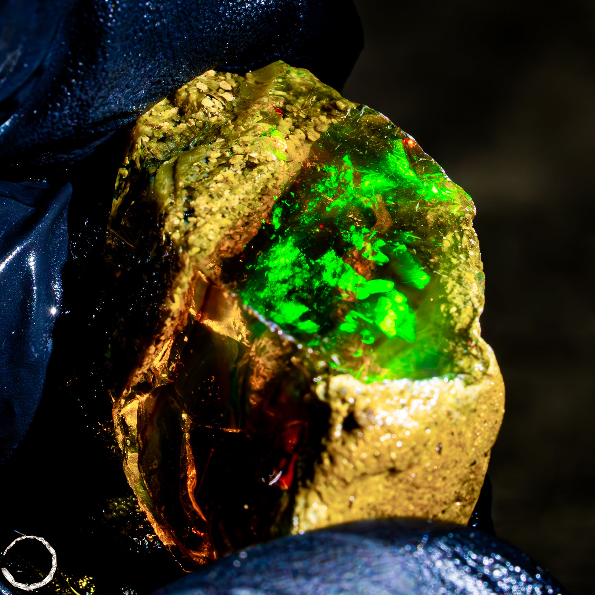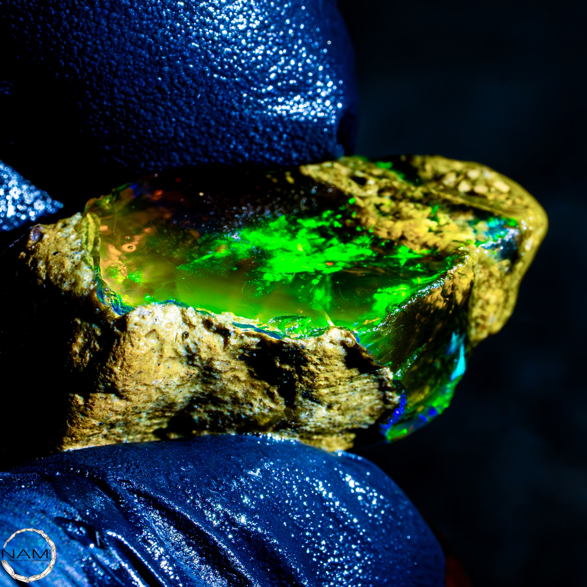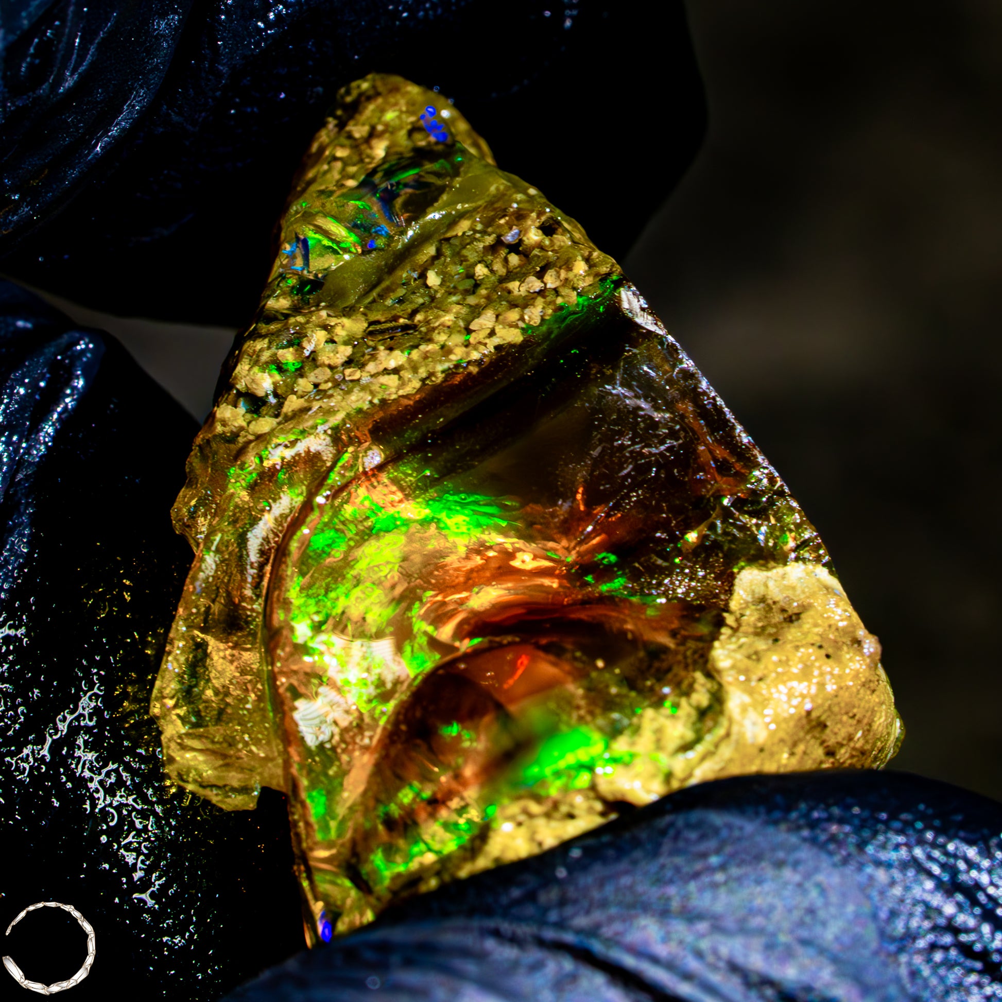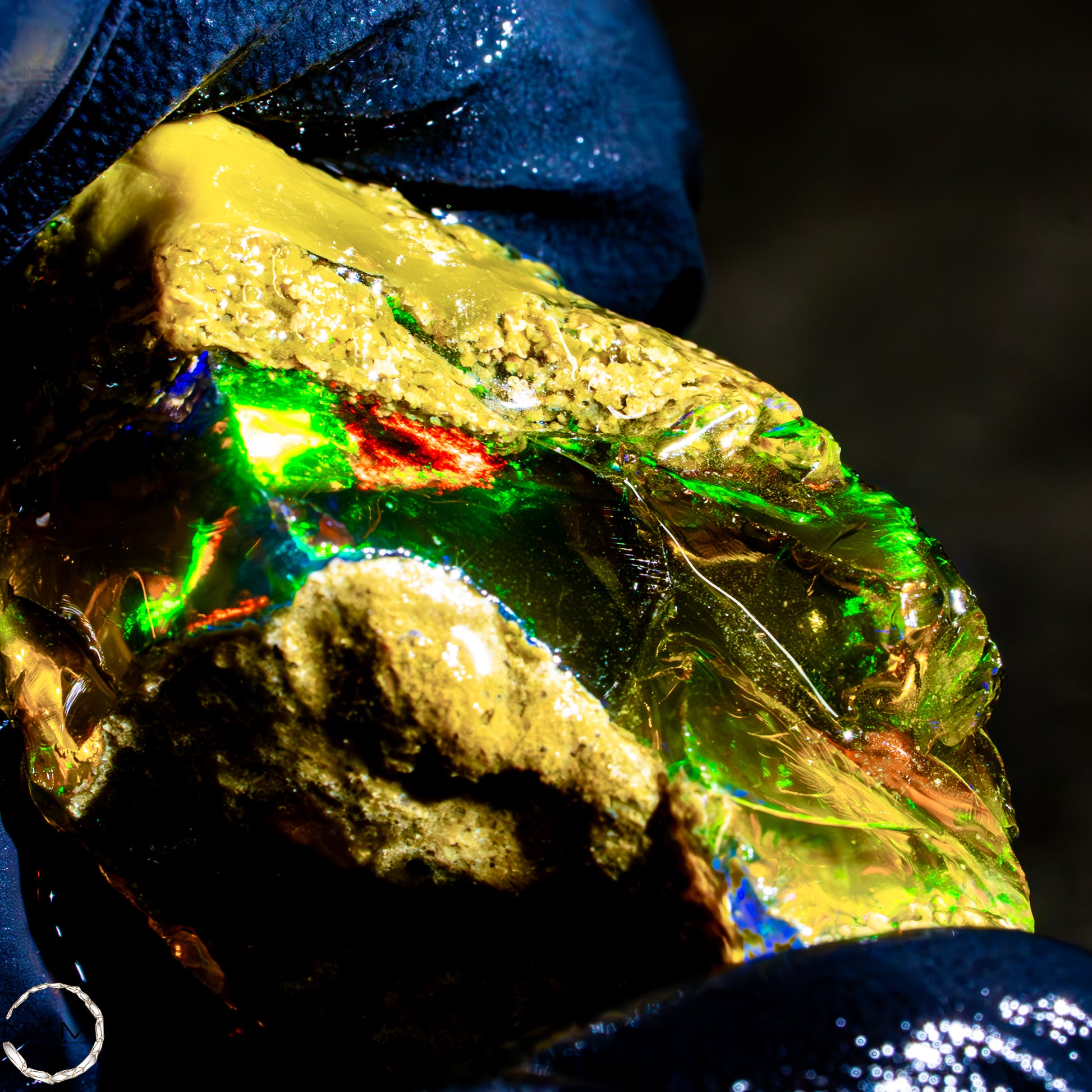 Dieser spektakuläre Kristall-Opal-Rohstein zeigt ein beeindruckendes Farbspiel in intensiven Gelb-, Orange-, Grün- und Rottönen. Das transparente bis transluzente Material wirkt wie flüssiges Feuer und offenbart eine faszinierende Tiefe. Die schillernden Farben scheinen aus dem Inneren heraus zu leuchten und wechseln je nach Lichteinfall auf magische Weise. Die natürlichen Bruchkanten und die erhaltene Mutterstein-Partie am oberen Rand verleihen dem Stück seinen authentischen, makellosen Charakter. Ein faszinierendes Sammlerstück für Liebhaber außergewöhnlicher Edelsteine.