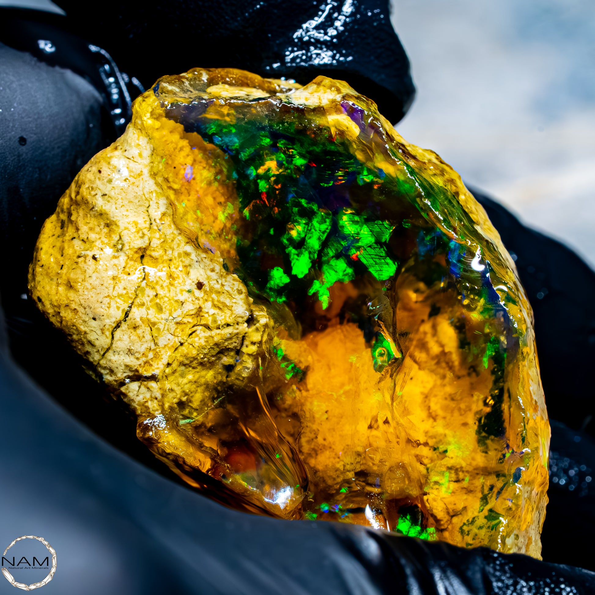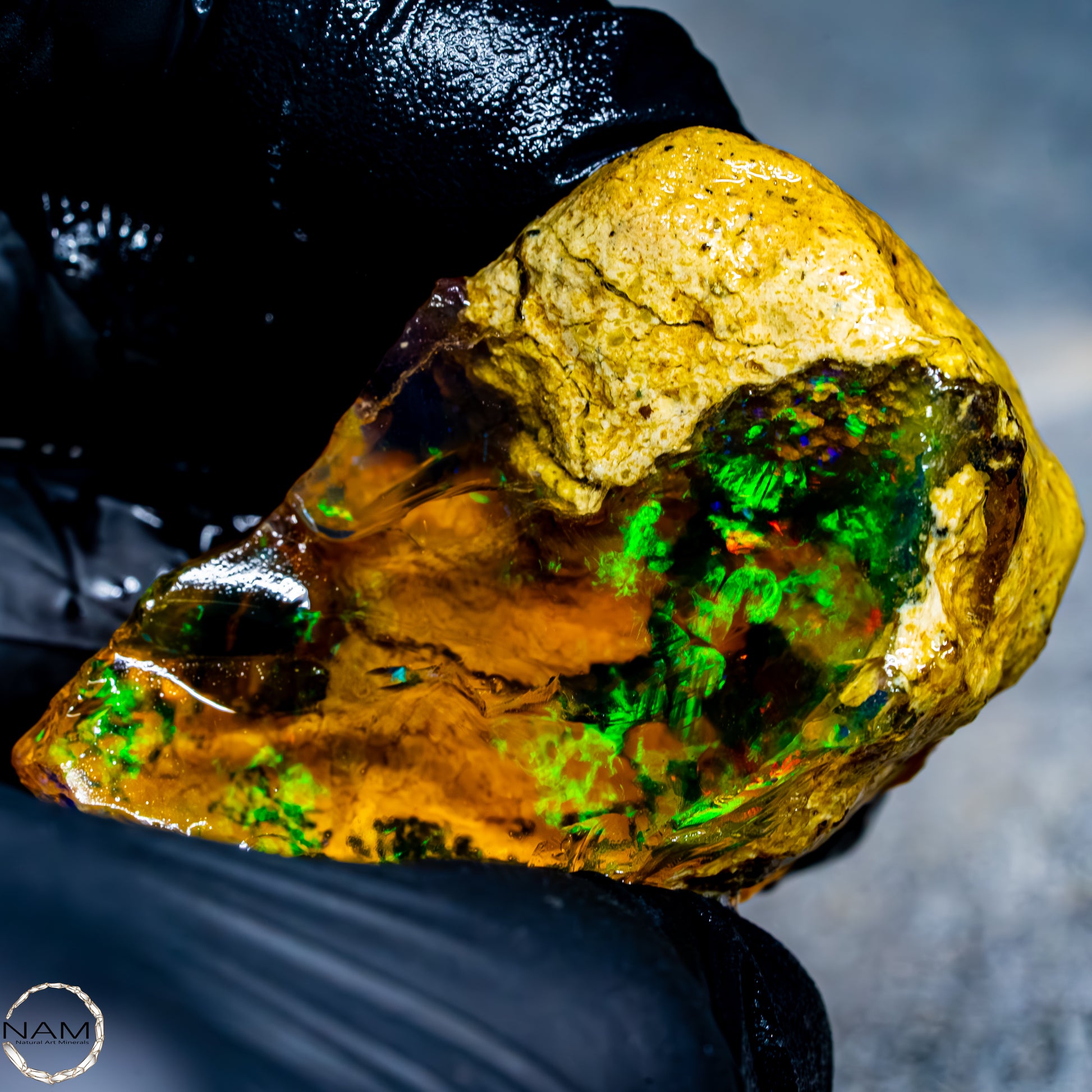 Dieser spektakuläre Kristall-Opal-Rohstein zeigt ein beeindruckendes Farbspiel in intensiven Gelb-, Orange-, Grün- und Rottönen. Das transparente bis transluzente Material wirkt wie flüssiges Feuer und offenbart eine faszinierende Tiefe. Die schillernden Farben scheinen aus dem Inneren heraus zu leuchten und wechseln je nach Lichteinfall auf magische Weise. Die natürlichen Bruchkanten und die erhaltene Mutterstein-Partie am oberen Rand verleihen dem Stück seinen authentischen, makellosen Charakter. Ein faszinierendes Sammlerstück für Liebhaber außergewöhnlicher Edelsteine.
