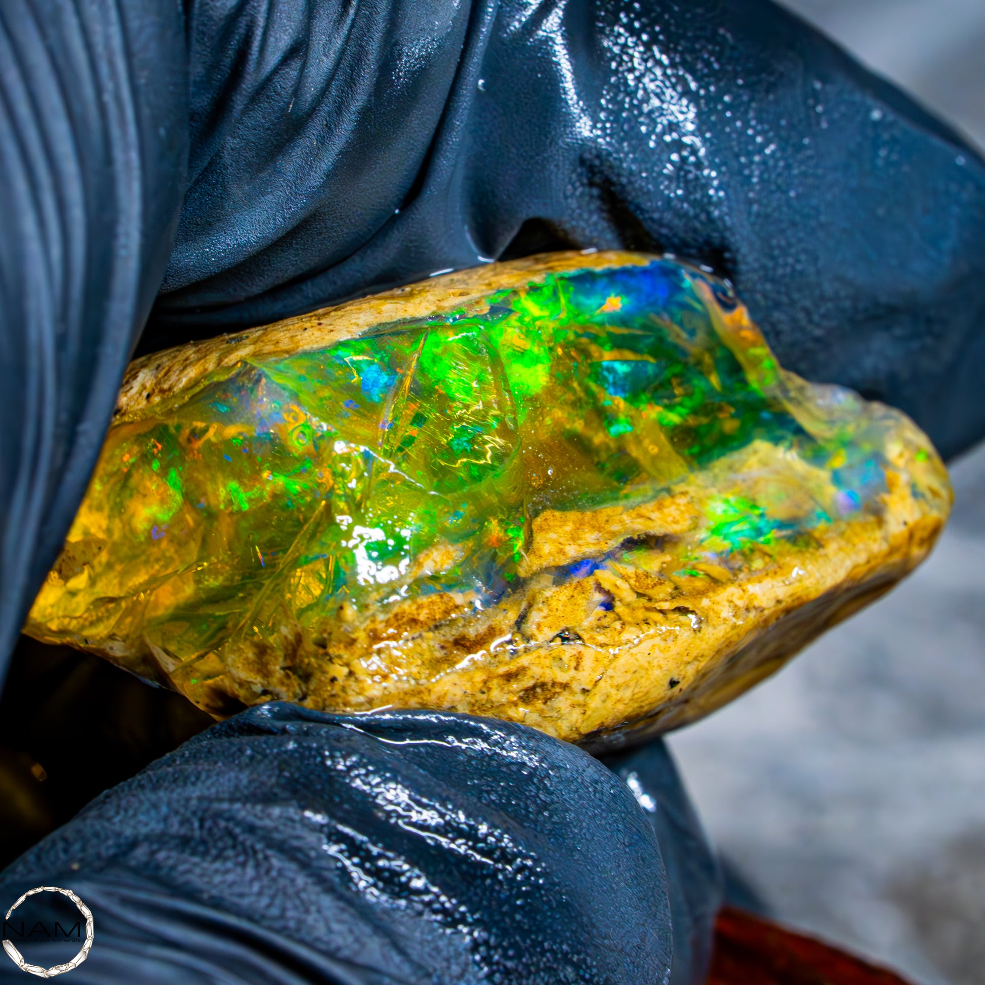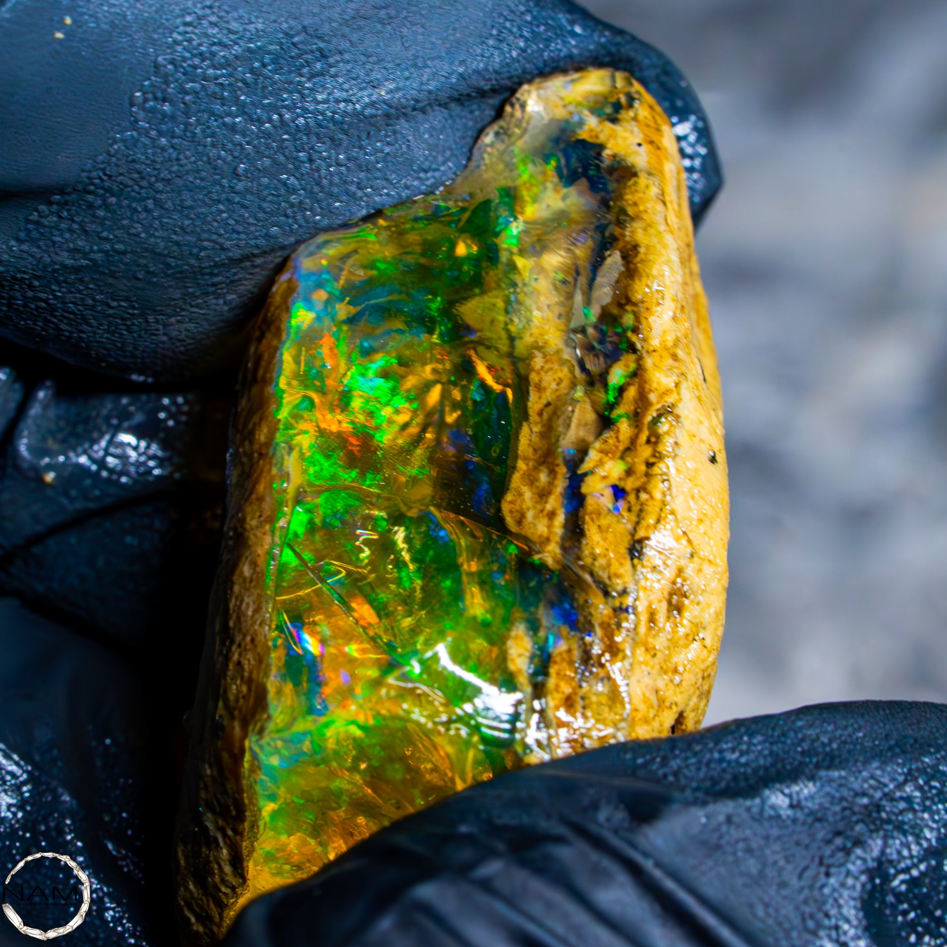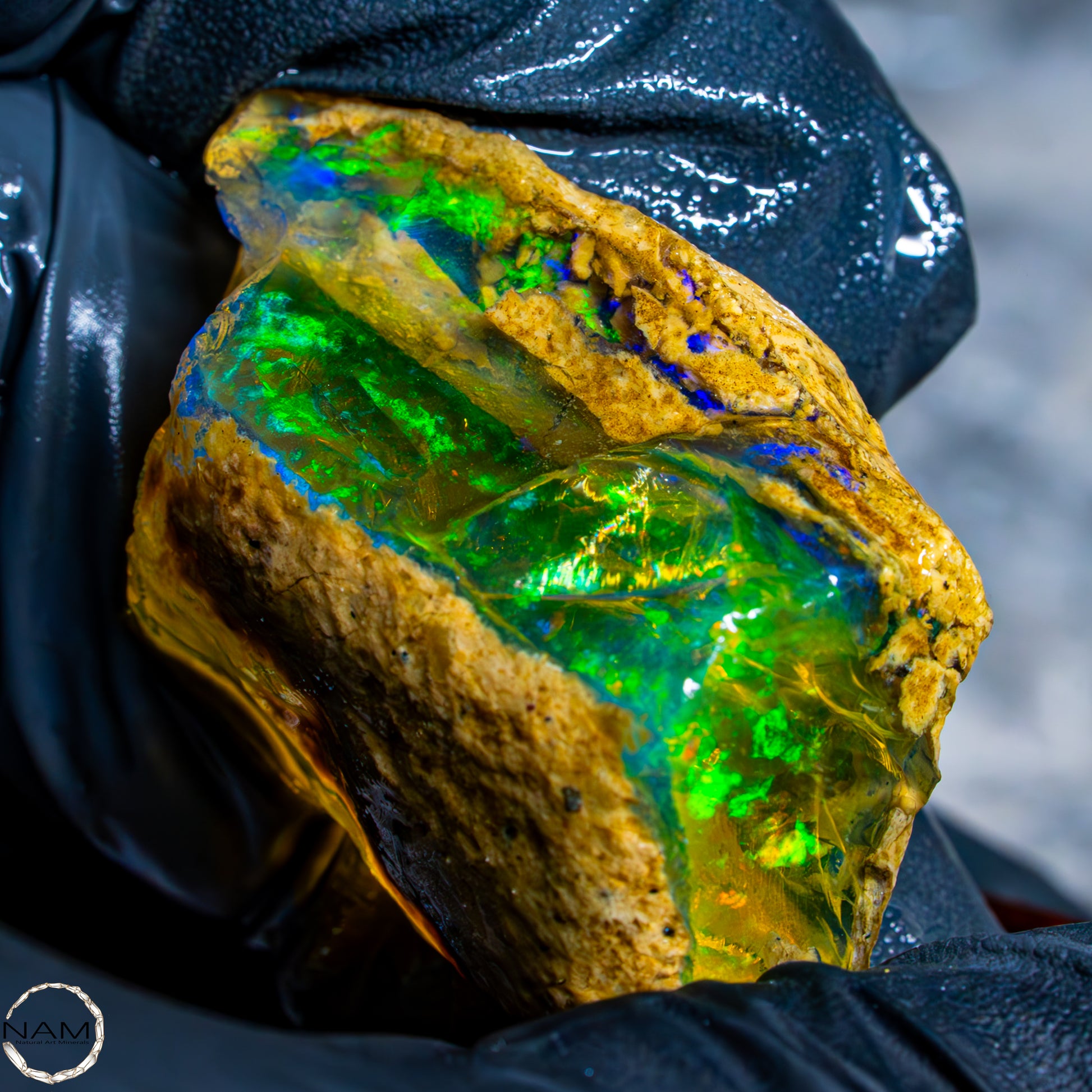 Dieser spektakuläre Kristall-Opal-Rohstein zeigt ein beeindruckendes Farbspiel in intensiven Gelb-, Orange-, Grün- und Rottönen. Das transparente bis transluzente Material wirkt wie flüssiges Feuer und offenbart eine faszinierende Tiefe. Die schillernden Farben scheinen aus dem Inneren heraus zu leuchten und wechseln je nach Lichteinfall auf magische Weise. Die natürlichen Bruchkanten und die erhaltene Mutterstein-Partie am oberen Rand verleihen dem Stück seinen authentischen, makellosen Charakter. Ein faszinierendes Sammlerstück für Liebhaber außergewöhnlicher Edelsteine.
