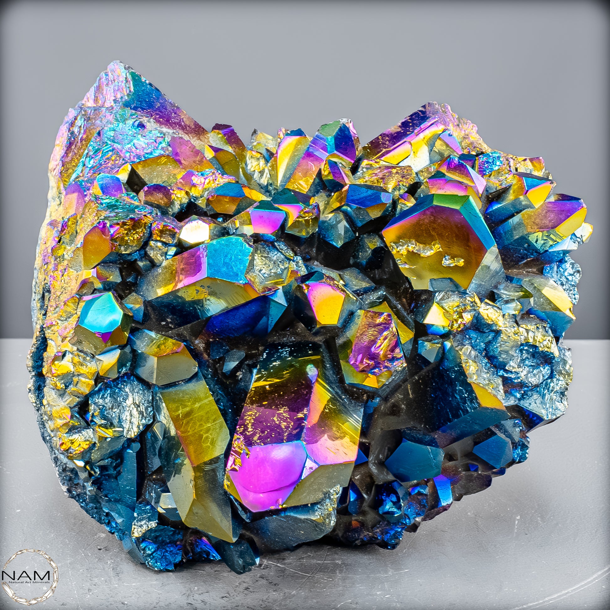 Diese spektakuläre Titanium Aura Quarz-Druse mit einem Gewicht von 4 Kilogramm ist ein wahres Feuerwerk der Farben! Das intensive Spiel aus Violett, Blau, Gold, Pink und Grün entsteht durch die Verschmelzung von natürlichem Bergkristall mit Titan und anderen Metallen – ein Prozess, der Licht, Energie und Kunst vereint.