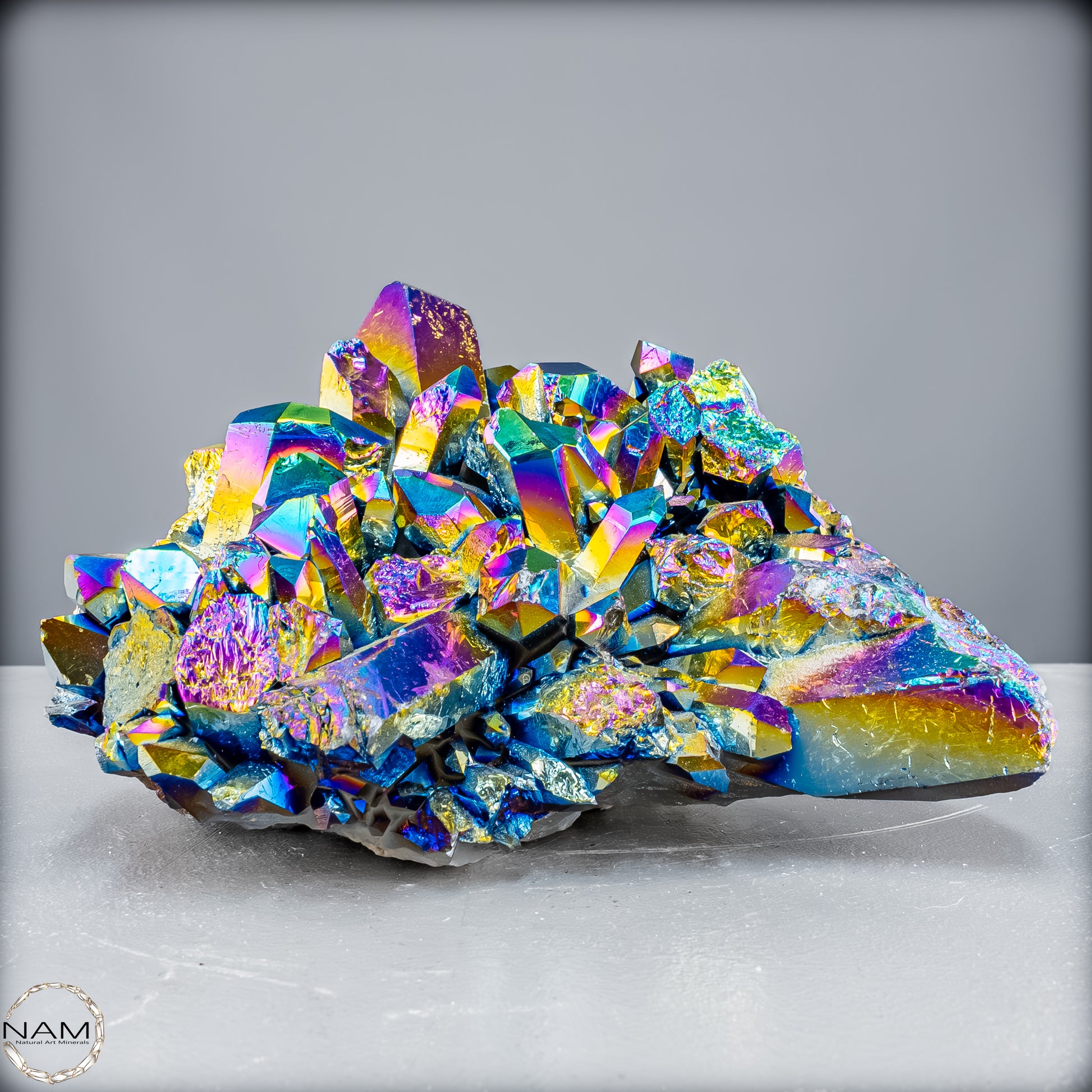 Jede Facette dieser Kristallformation reflektiert das Licht in leuchtenden Regenbogenfarben und verleiht dem Stück eine fast magische Ausstrahlung. Die glitzernden Spitzen und tiefen Schichten schaffen eine dynamische Struktur, die sowohl modern als auch mystisch wirkt.