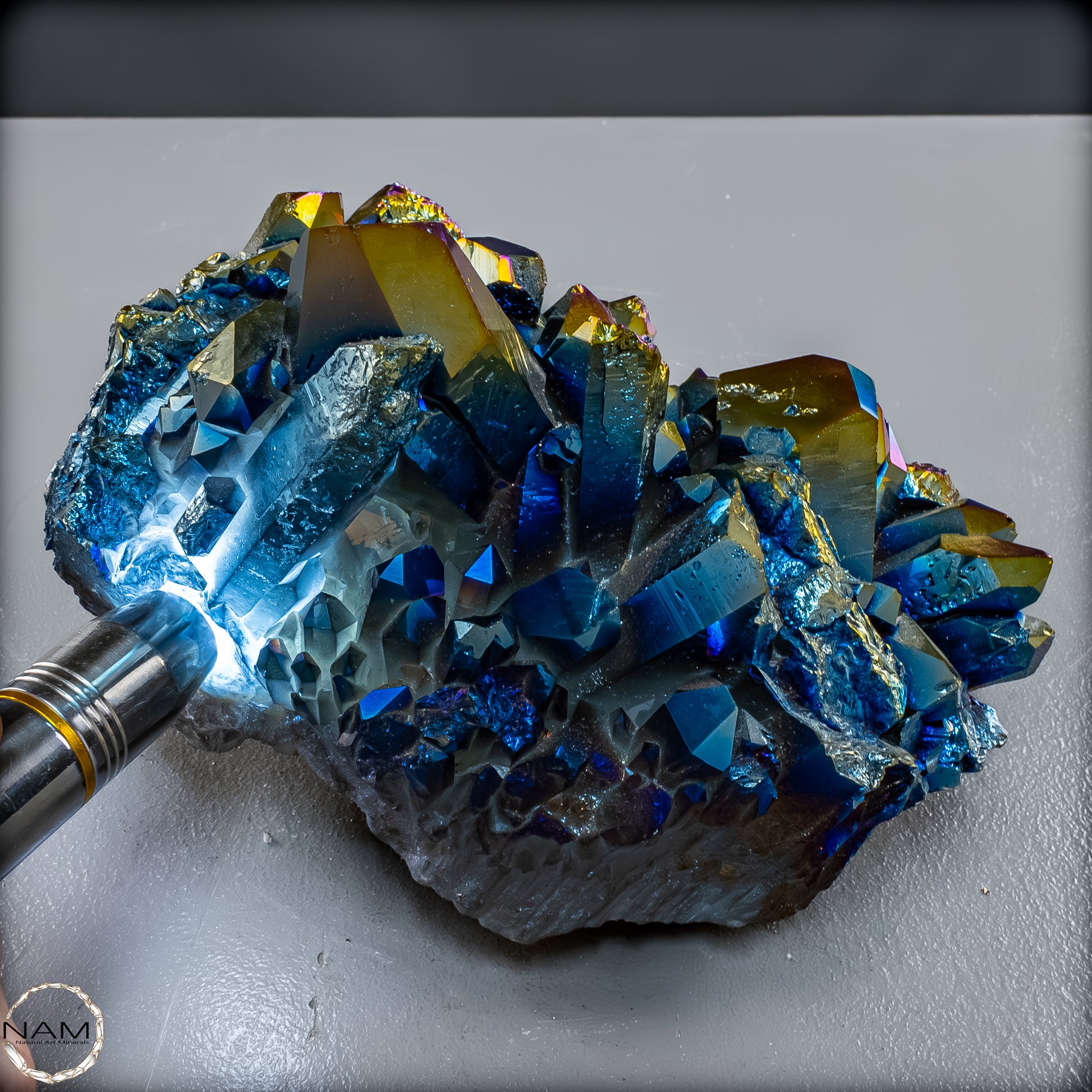 Energetisch gilt der Titanium Aura Quarz als Kristall der Lebensfreude, Kreativität und Transformation. Er verstärkt die Schwingung positiver Energie, hebt die Stimmung und inspiriert zu neuen Perspektiven. Ideal für Meditation, Energiearbeit oder als strahlender Mittelpunkt eines Raumes.