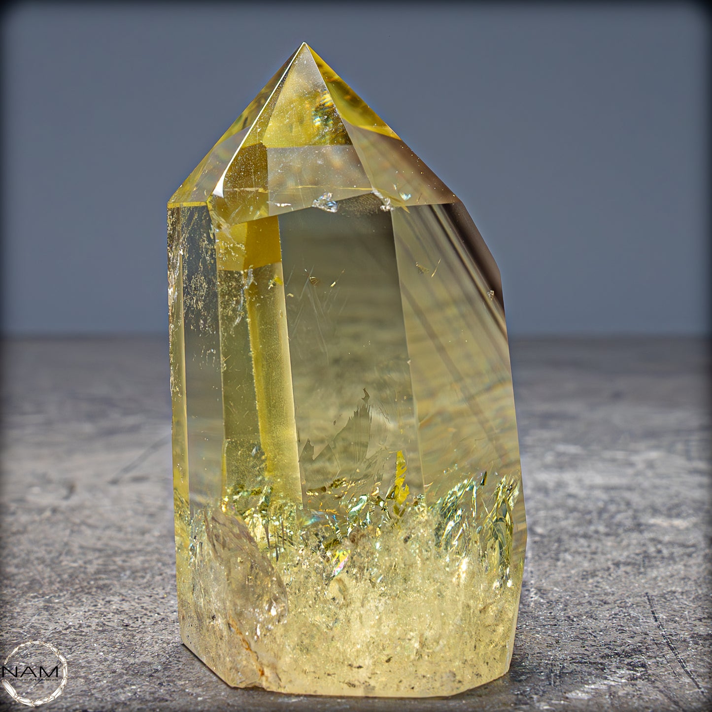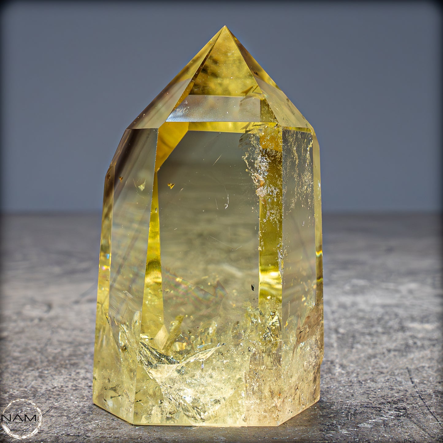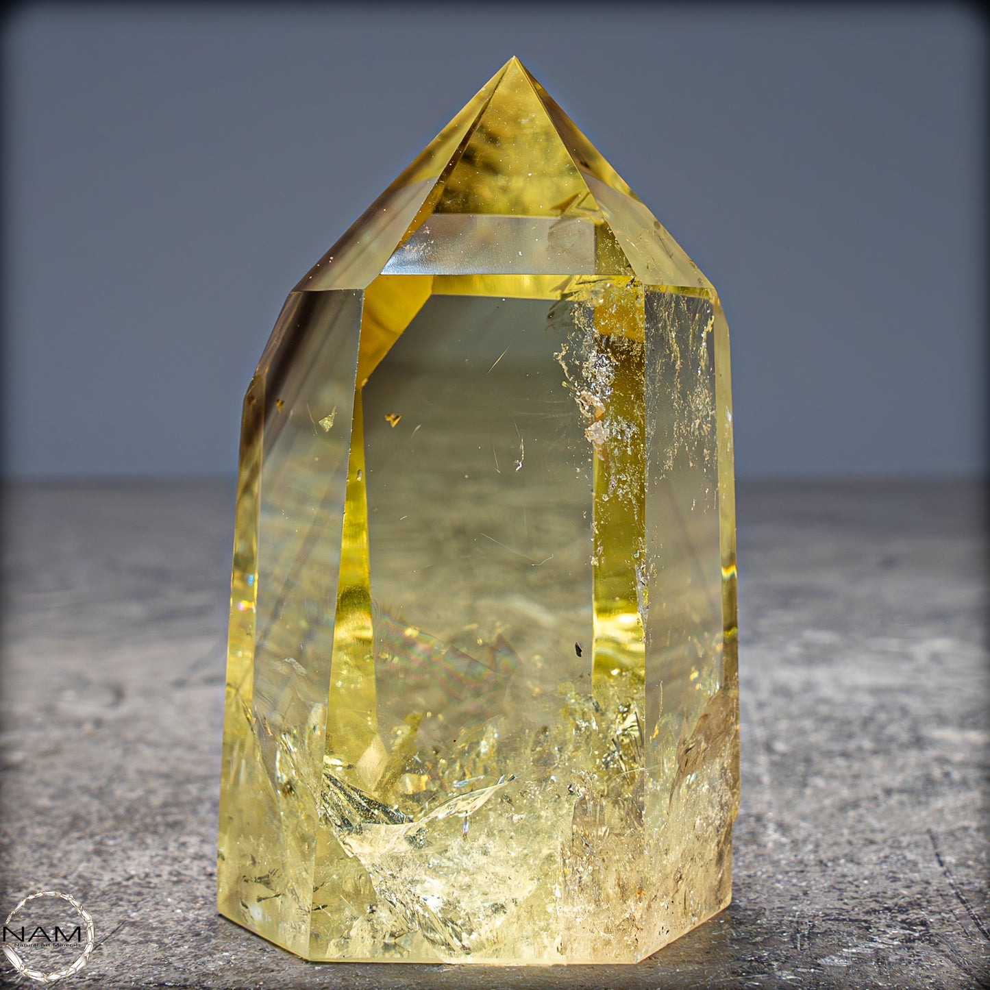 Erleben Sie die unvergleichliche Schönheit eines traumhaften transparenten Citrin Kristalls der höchsten Qualität. Dieser beeindruckende Edelstein besticht durch seine außergewöhnliche Klarheit und die intensive gelbe Farbgebung, die an das strahlende Licht der Sonne erinnert.