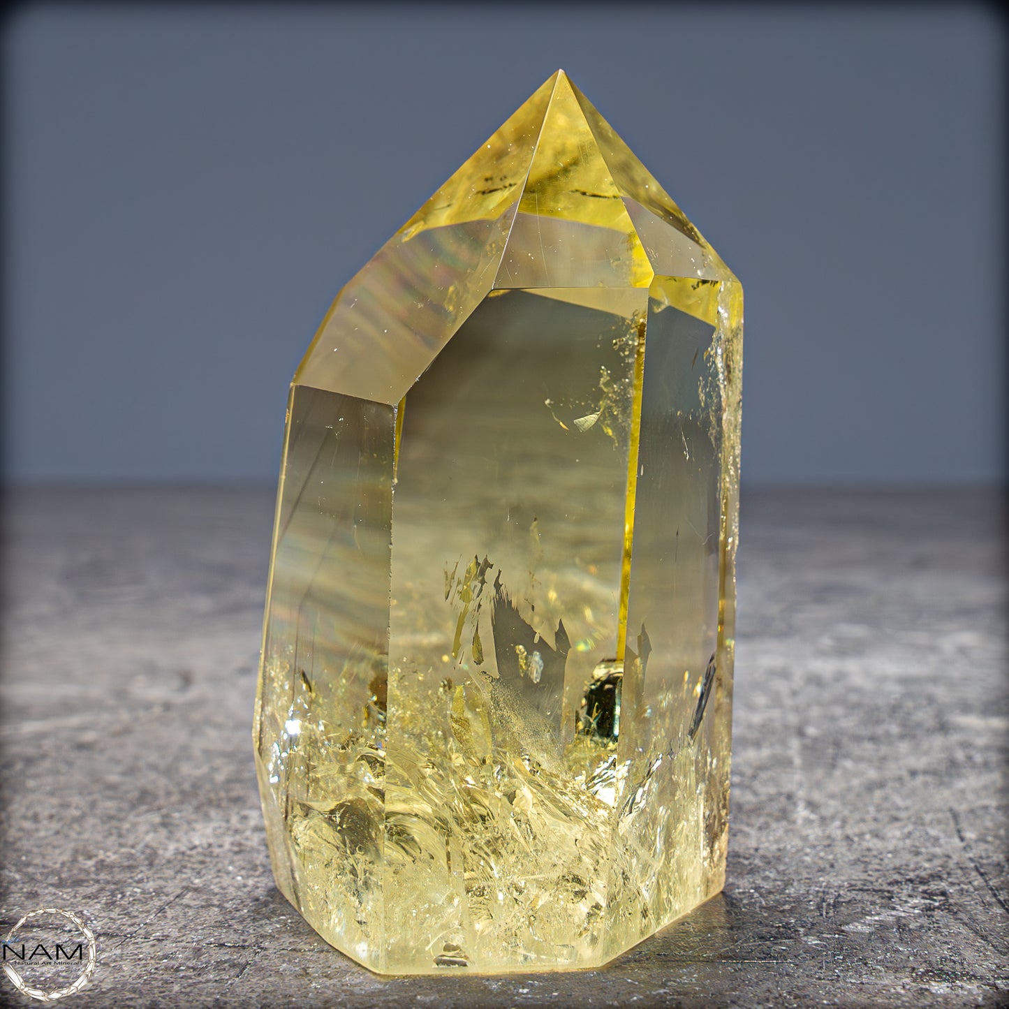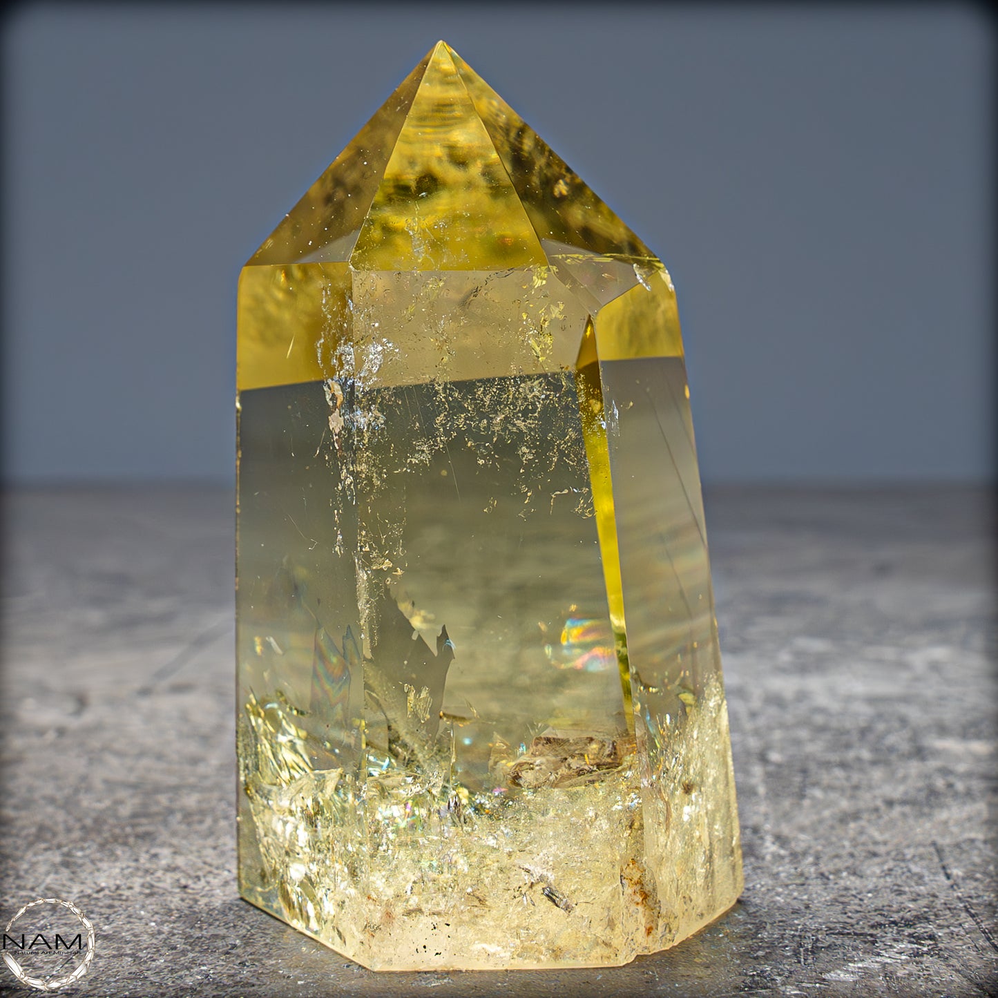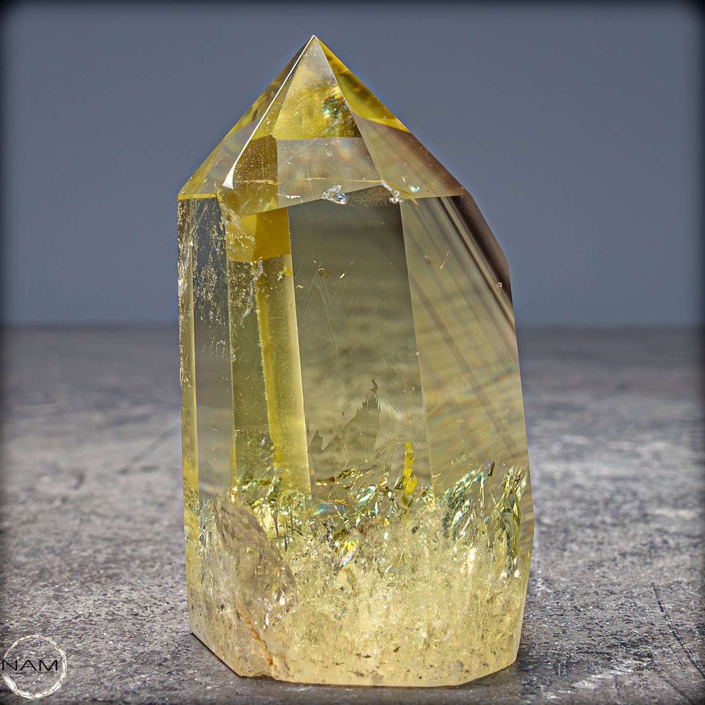 Erleben Sie die unvergleichliche Schönheit eines traumhaften transparenten Citrin Kristalls der höchsten Qualität. Dieser beeindruckende Edelstein besticht durch seine außergewöhnliche Klarheit und die intensive gelbe Farbgebung, die an das strahlende Licht der Sonne erinnert.