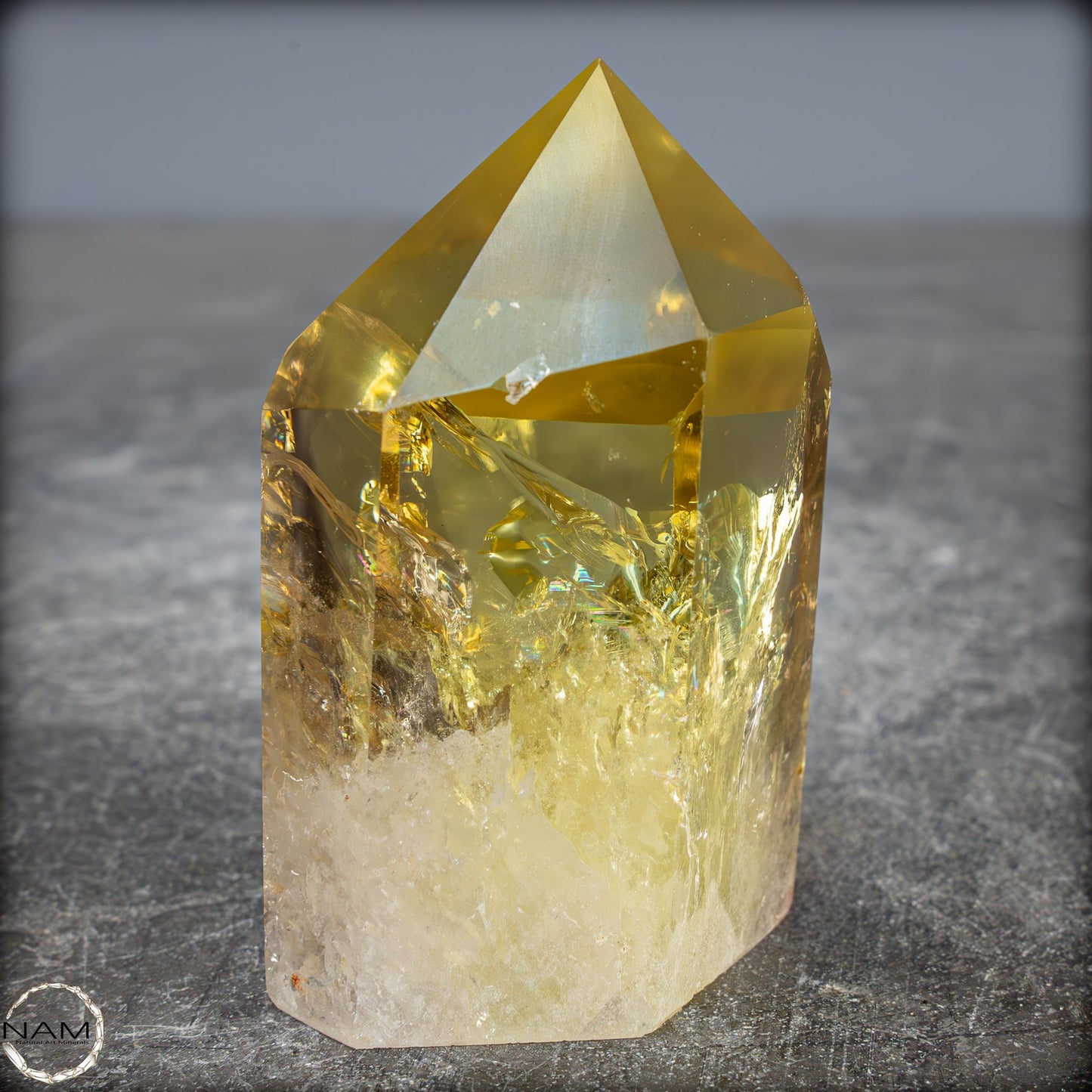 Erleben Sie die unvergleichliche Schönheit eines traumhaften transparenten Citrin Kristalls der höchsten Qualität. Dieser beeindruckende Edelstein besticht durch seine außergewöhnliche Klarheit und die intensive gelbe Farbgebung, die an das strahlende Licht der Sonne erinnert.