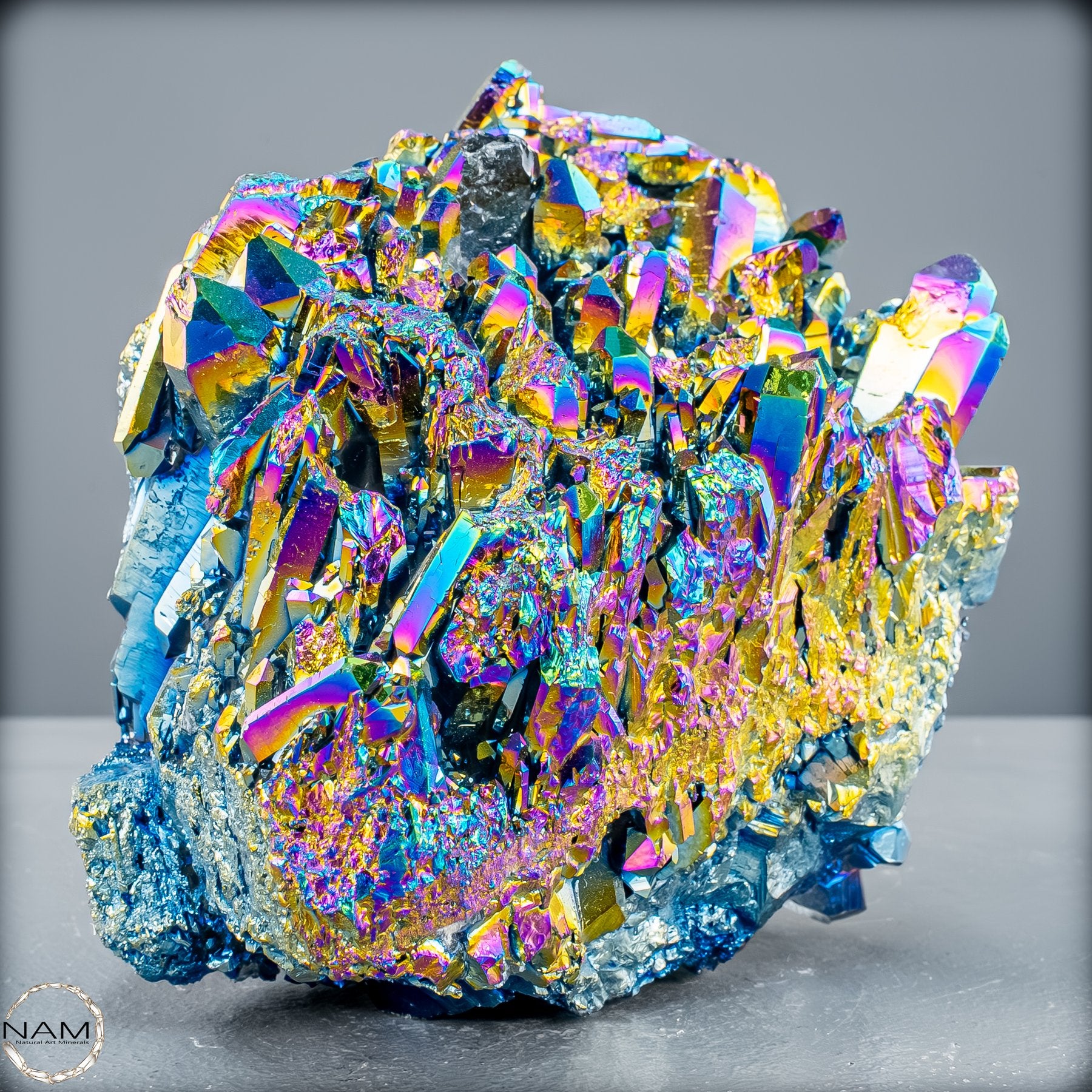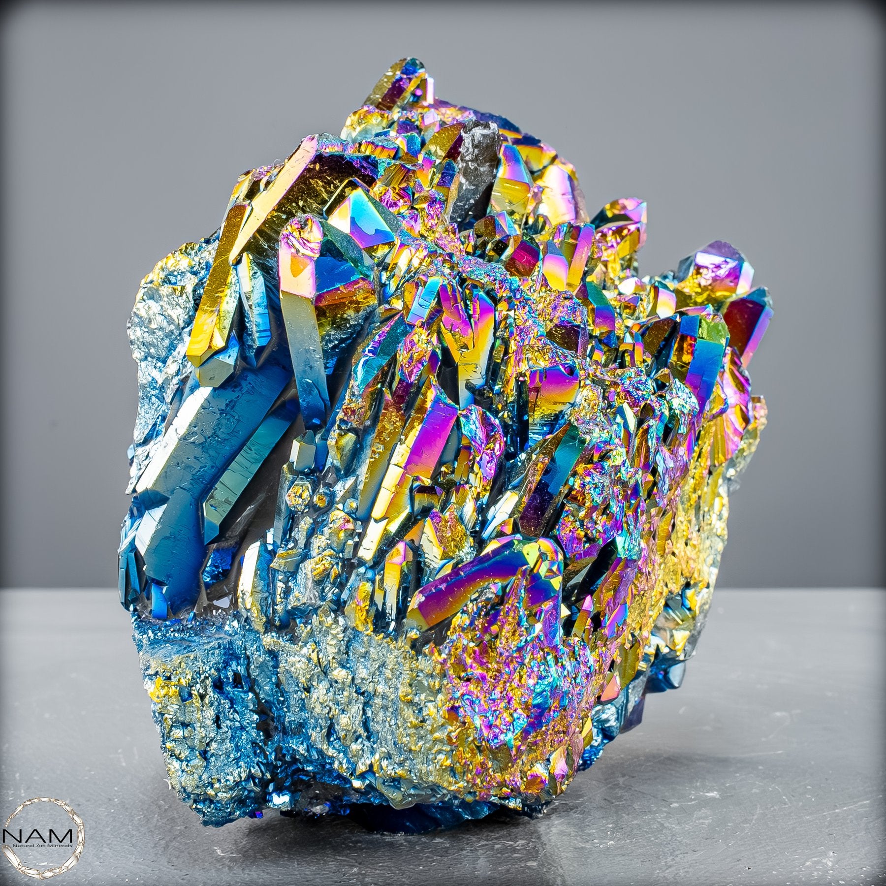 Dieser Aura-Amethyst präsentiert sich in einem intensiven Farbspiel, das ihn zu einem echten Blickfang macht. Die klaren Kristallflächen sind mit einer irisierenden Schicht überzogen, die in leuchtenden Nuancen von Türkis, Gold, Pink, Violett und Blau schimmert. Je nach Lichteinfall entfaltet der Amethyst eine fast magische Tiefe, die an das Leuchten von Polarlichtern erinnert.